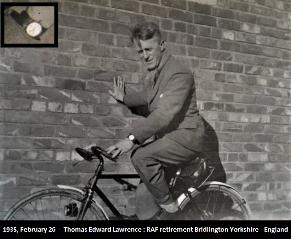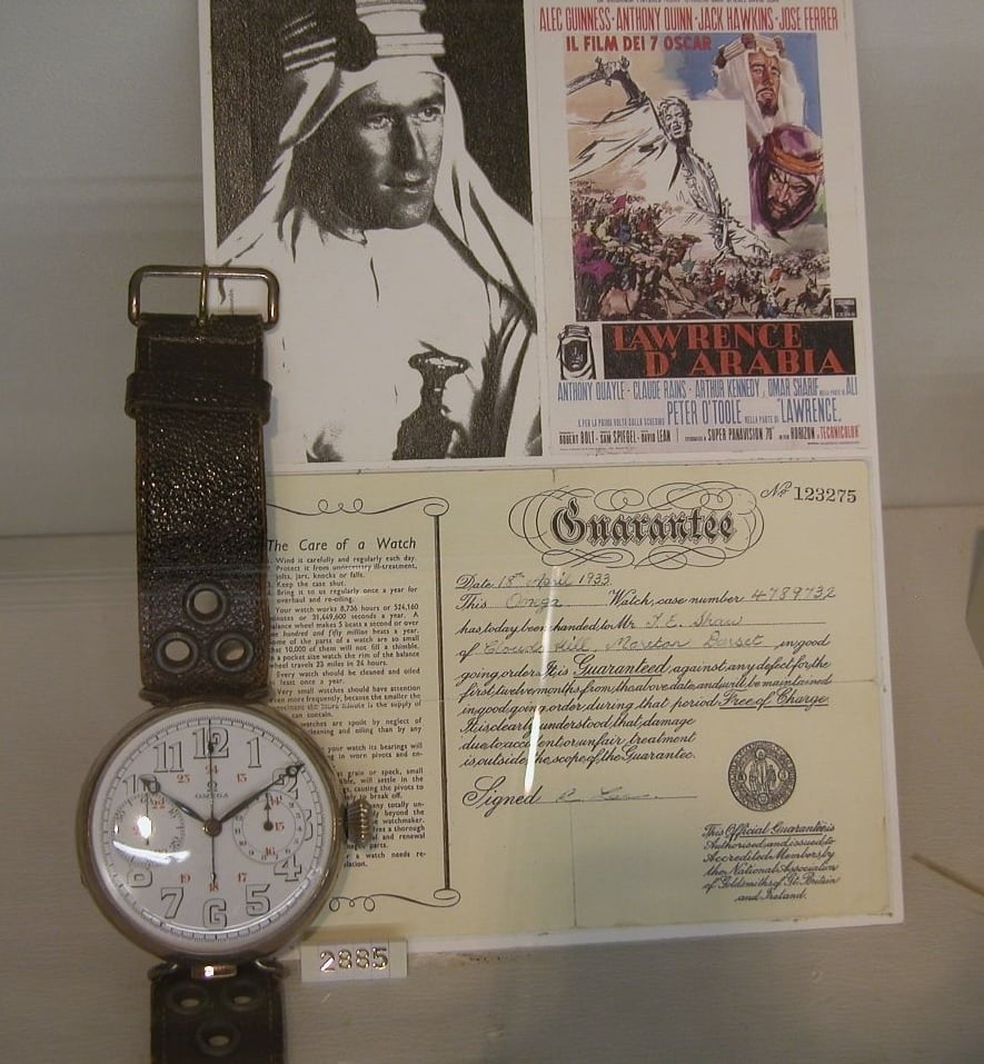 The watch T E Lawrence had on in the photo housed the BFG (Baumgartner) 90 caliber movement which was an alarm watch. If you look closely you will see the two apertures on the dial and of course the slide button on the left of the case.