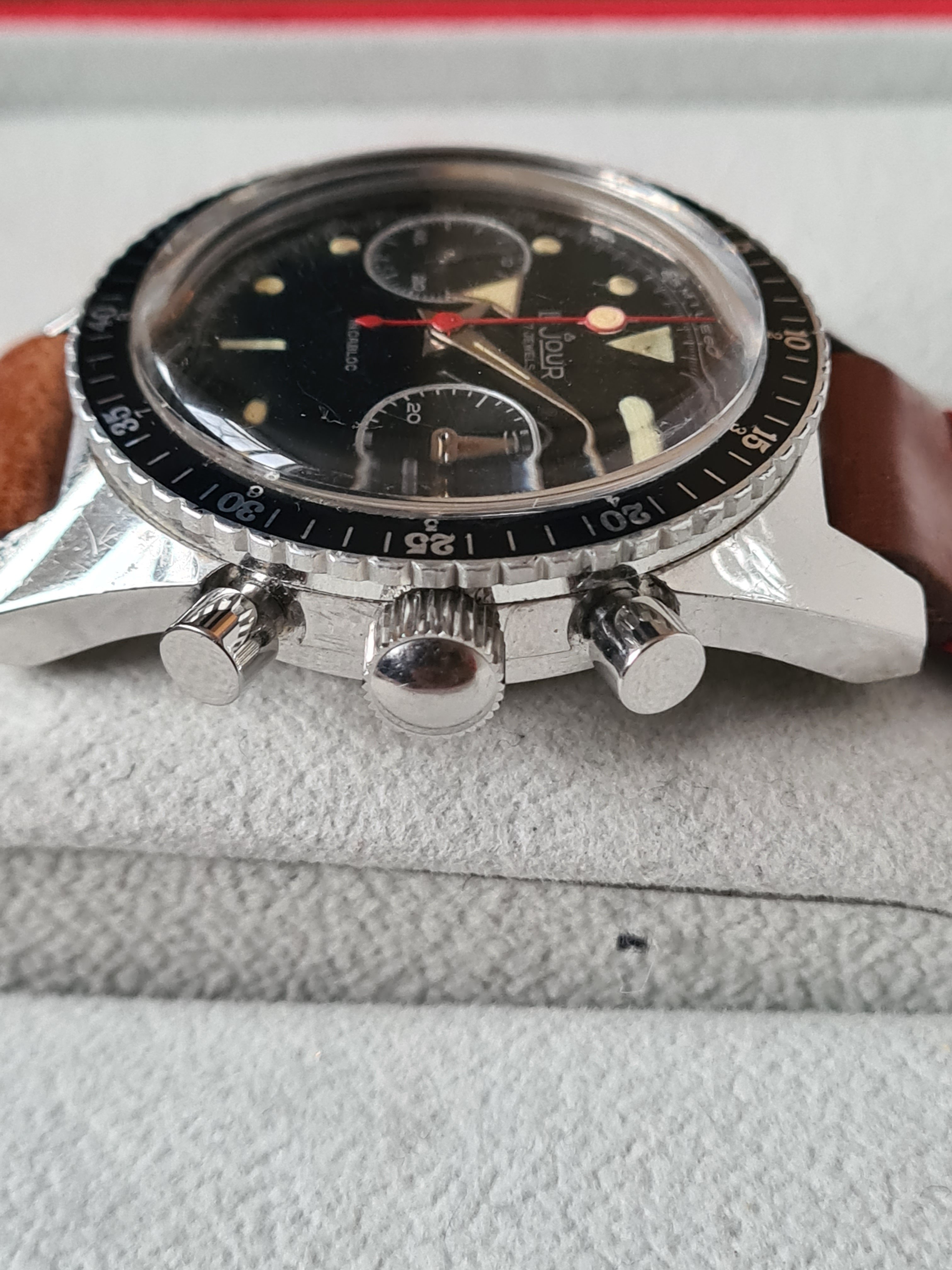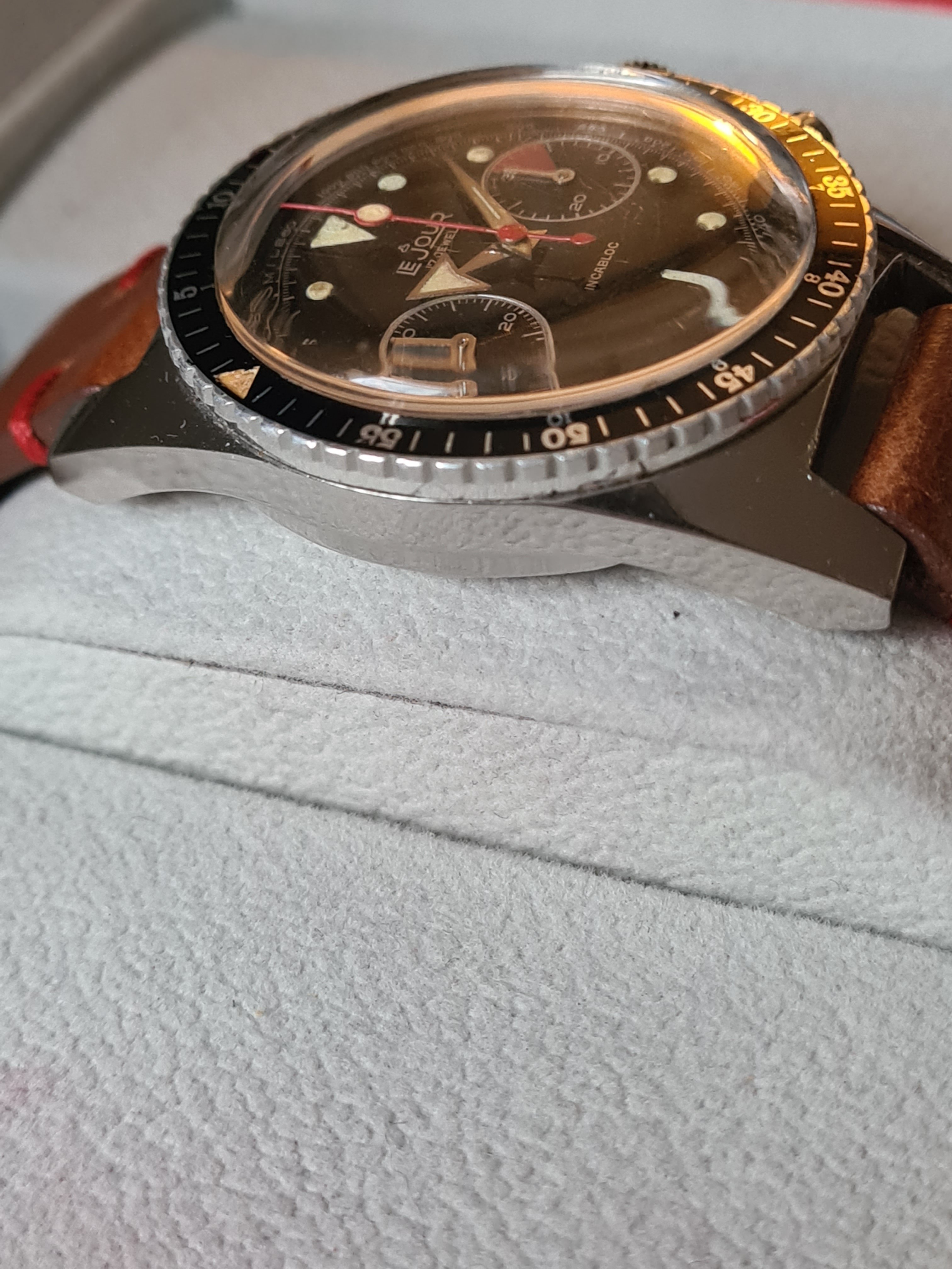 The Brand: For those of you unfamiliar with Le Jour, they were created by Yema to distribute watches in the US--you can find Le Jour-branded versions of both the Yema Daytona and the Superman. Over time, Le Jour, primarily an assembler, produced a number of different chronographs. Le Jour-branded Wakmanns were also common. The Triton is, to my knowledge, the piece associated most distinctly with Le Jour. It was produced in 2-resister valjoux 7730, 2-register val. 92, and 3-register val. 72 versions (the latter two, which came in J.P. Pingouin cases, fetching the highest prices these days, understandably). The defining features were the black dial, round lumes (w/ big triangle at 12), and red lollipop sweep-second. Some more examples and discussion about Le Jour here: https://omegaforums.net/threads/sometimes-you-get-_more_-than-what-you-paid-for-yema-le-jour.111240/