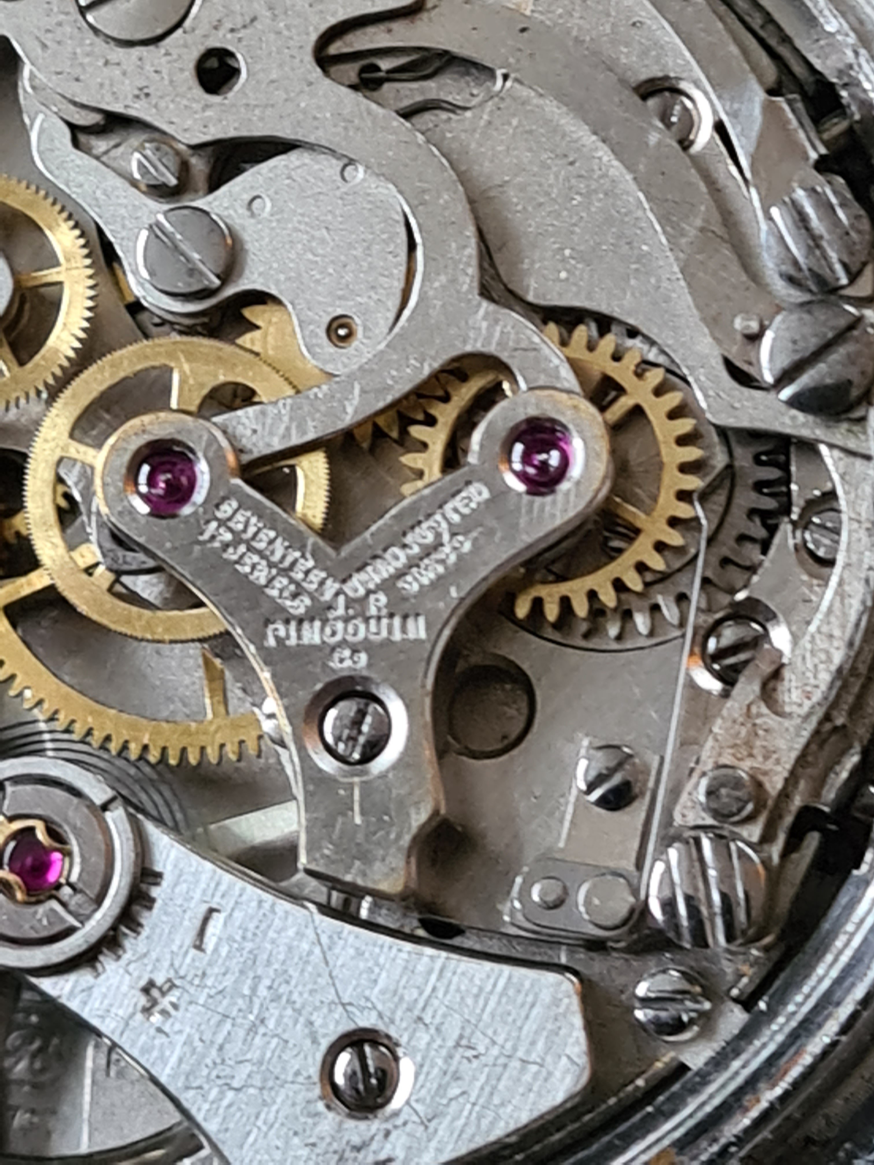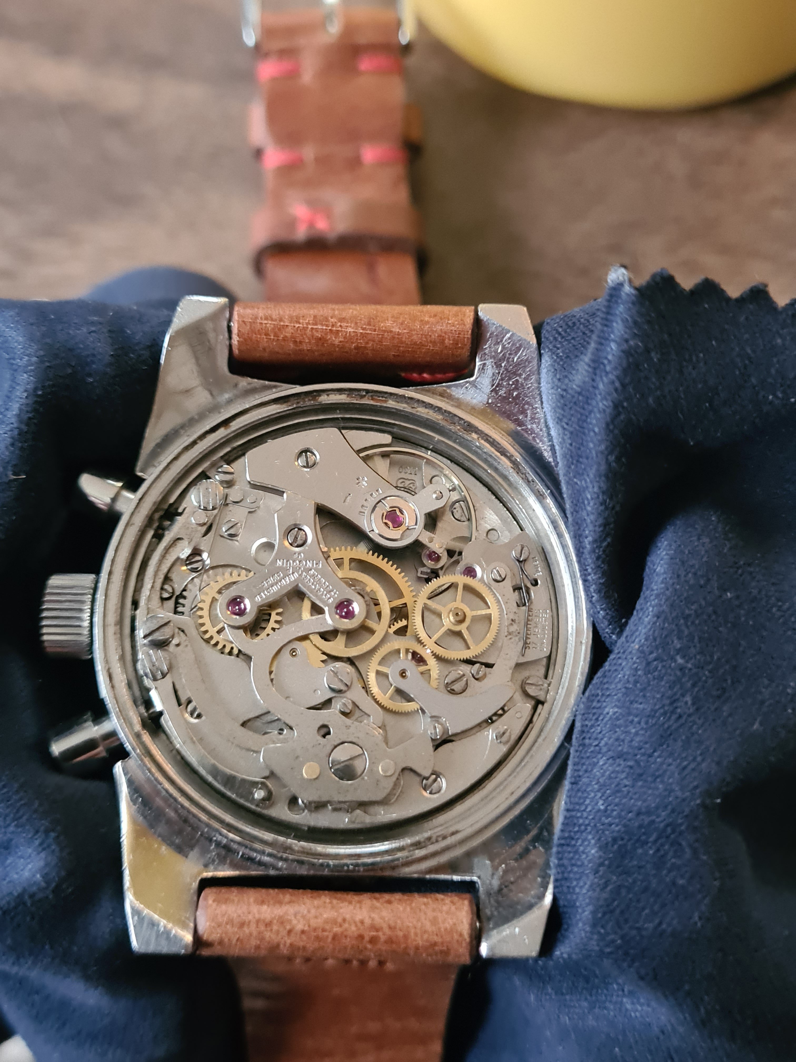 The Movement: The workhorse Valjoux 7730 movement is keeping excellent time and resets as it should. Signed J.P. Pingouin.