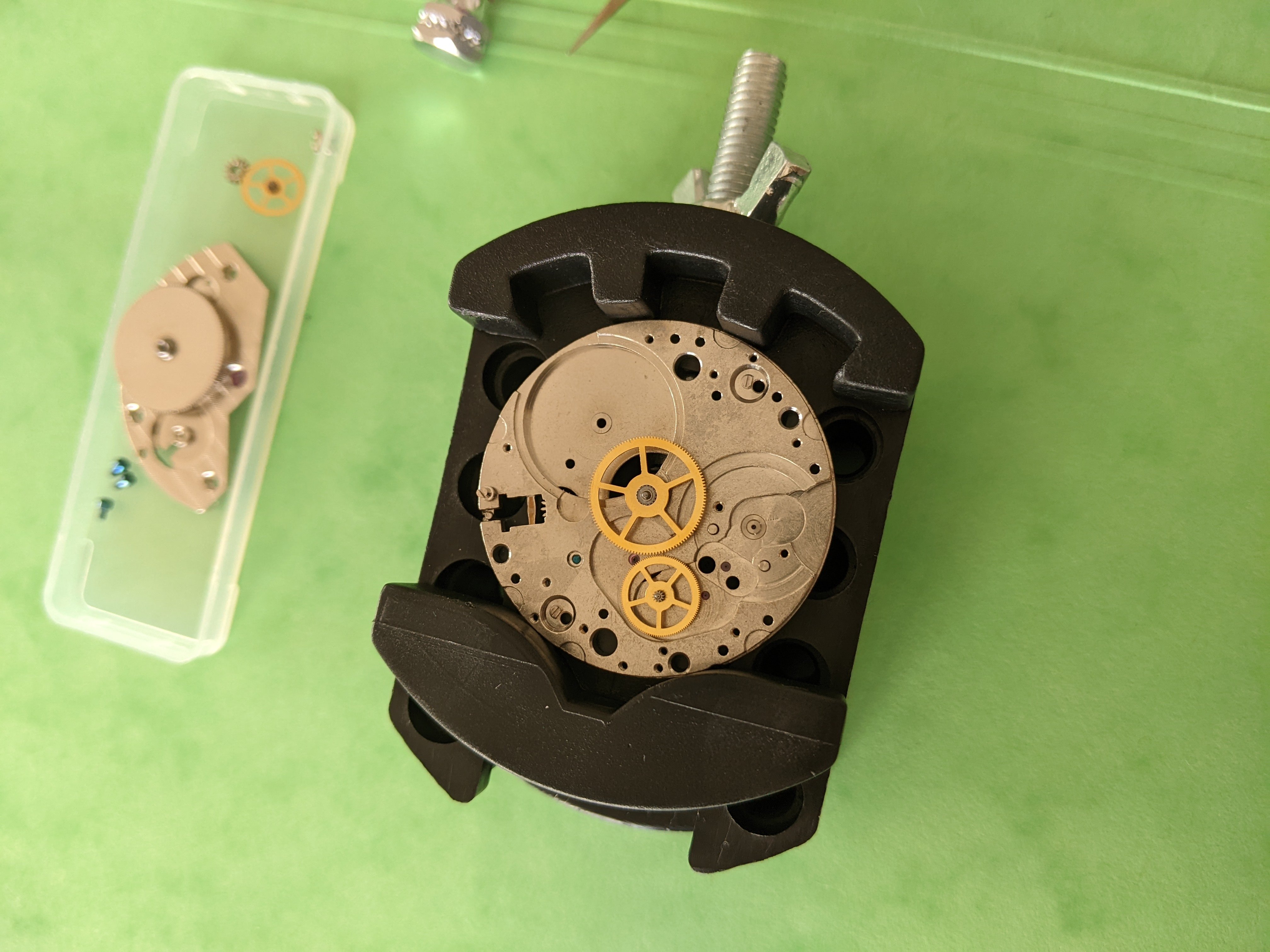 I was able to take the ETA movement apart. However, I could not remove the cannon pinion as I simply don't have the tools for this. The movement holder was part of a cheap toolset I already owned. However it is quite clumsy and the screw can only be operated using both hands. I might want to buy a better one if I would proceed. I am also thinking of buying a proper working mat that does not slip - the green thing I am using right now is just a cardboard folder that is moving the whole time.