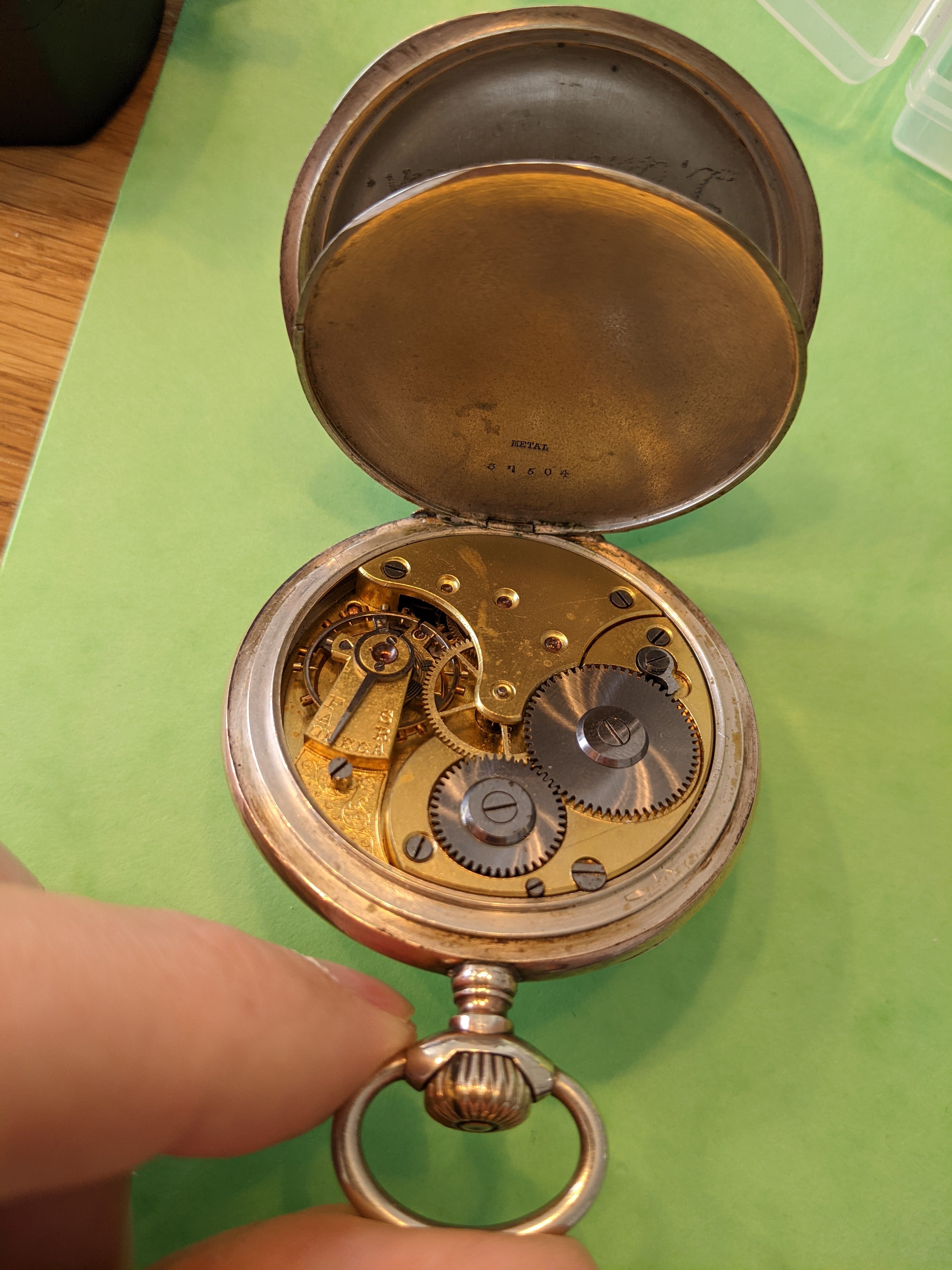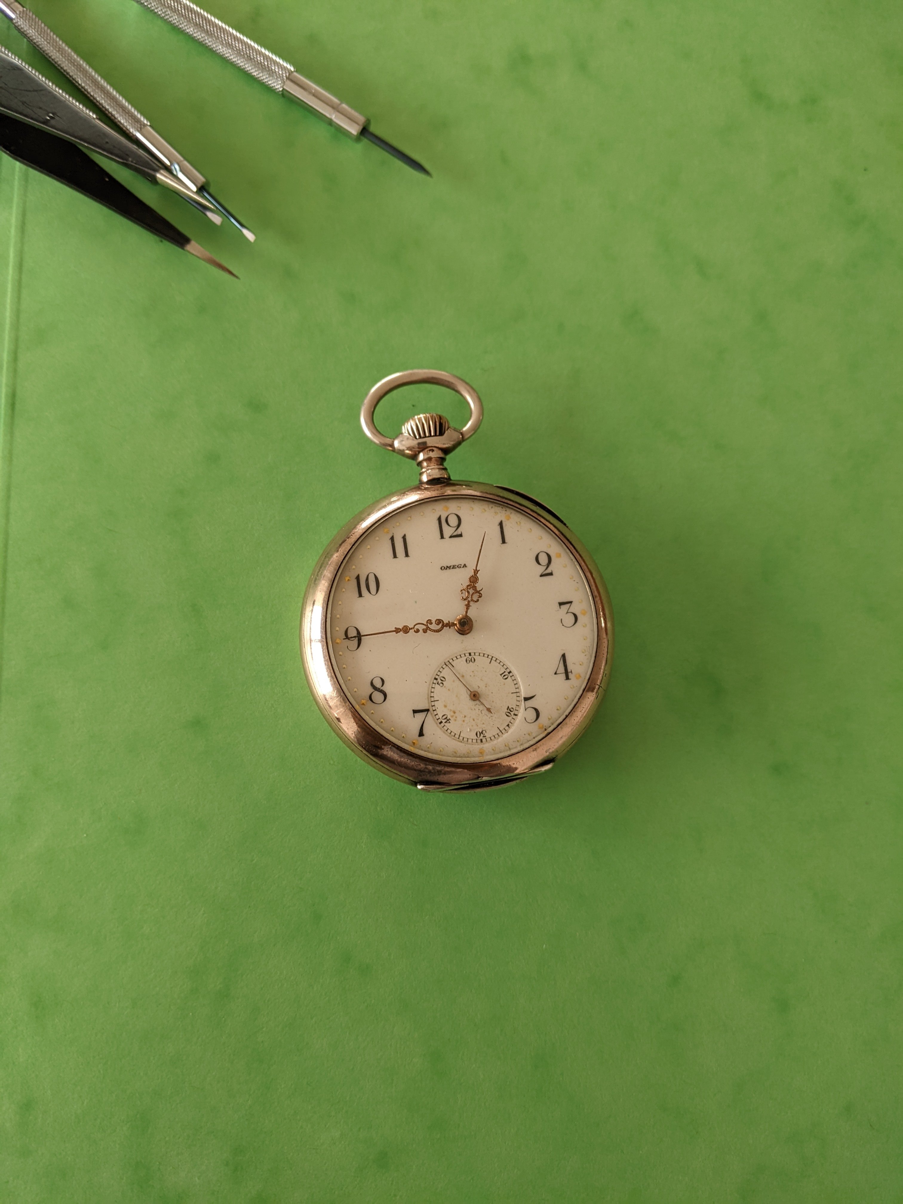 The I thought "Let's carefully have a look onto the old Omega Pocketwatch that I own but is not working"