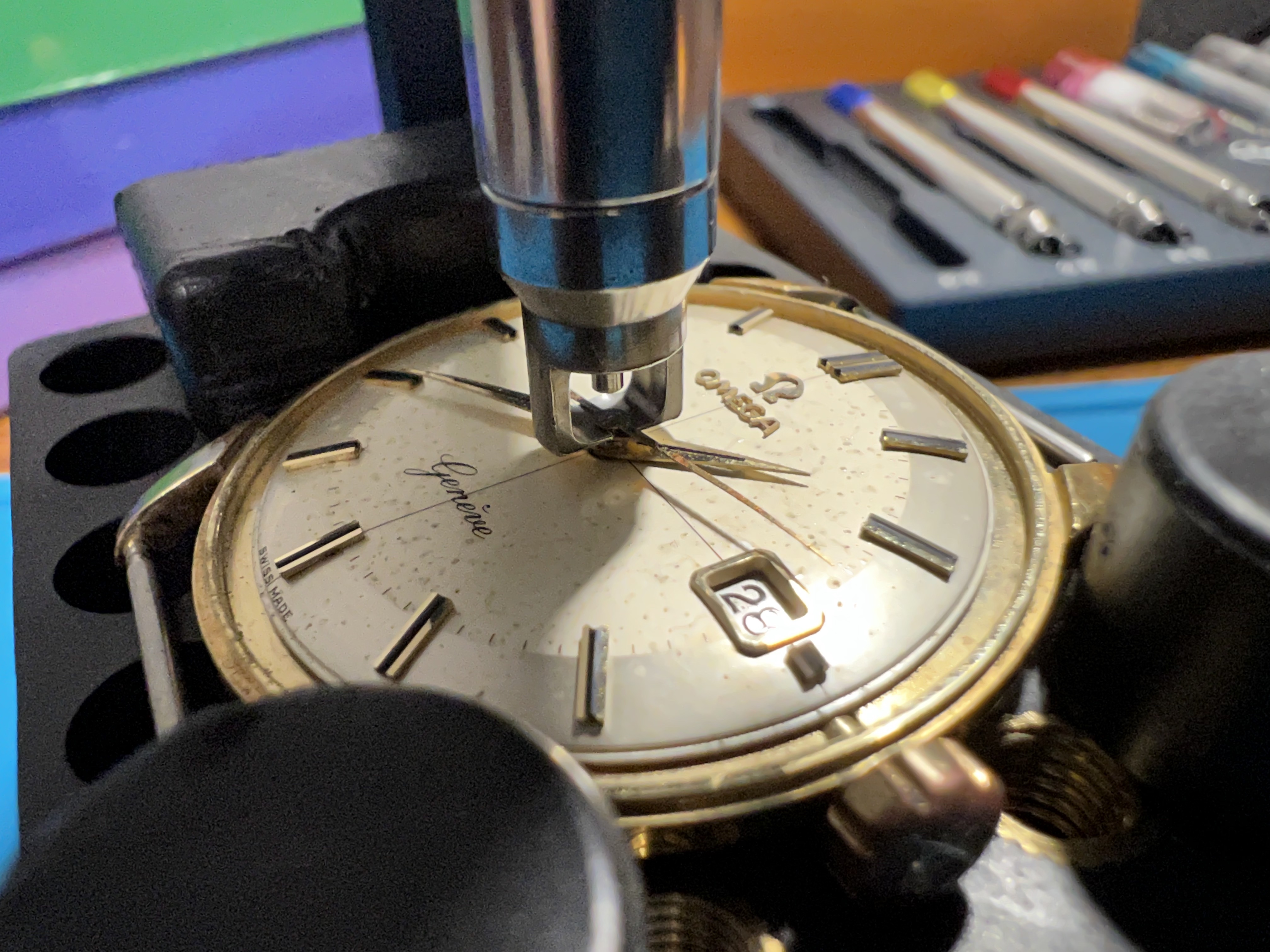 No damage to the naturally damaged dial, even without using the internal clasping mechanisms, it's pretty useful just as a lift - I only ended up using the grasp system for the seconds hand, the minutes hand was easy too, the hour hand which is the critical one wasn't as breazy as I imagined, but this watch/dial particularly cuts it close too
