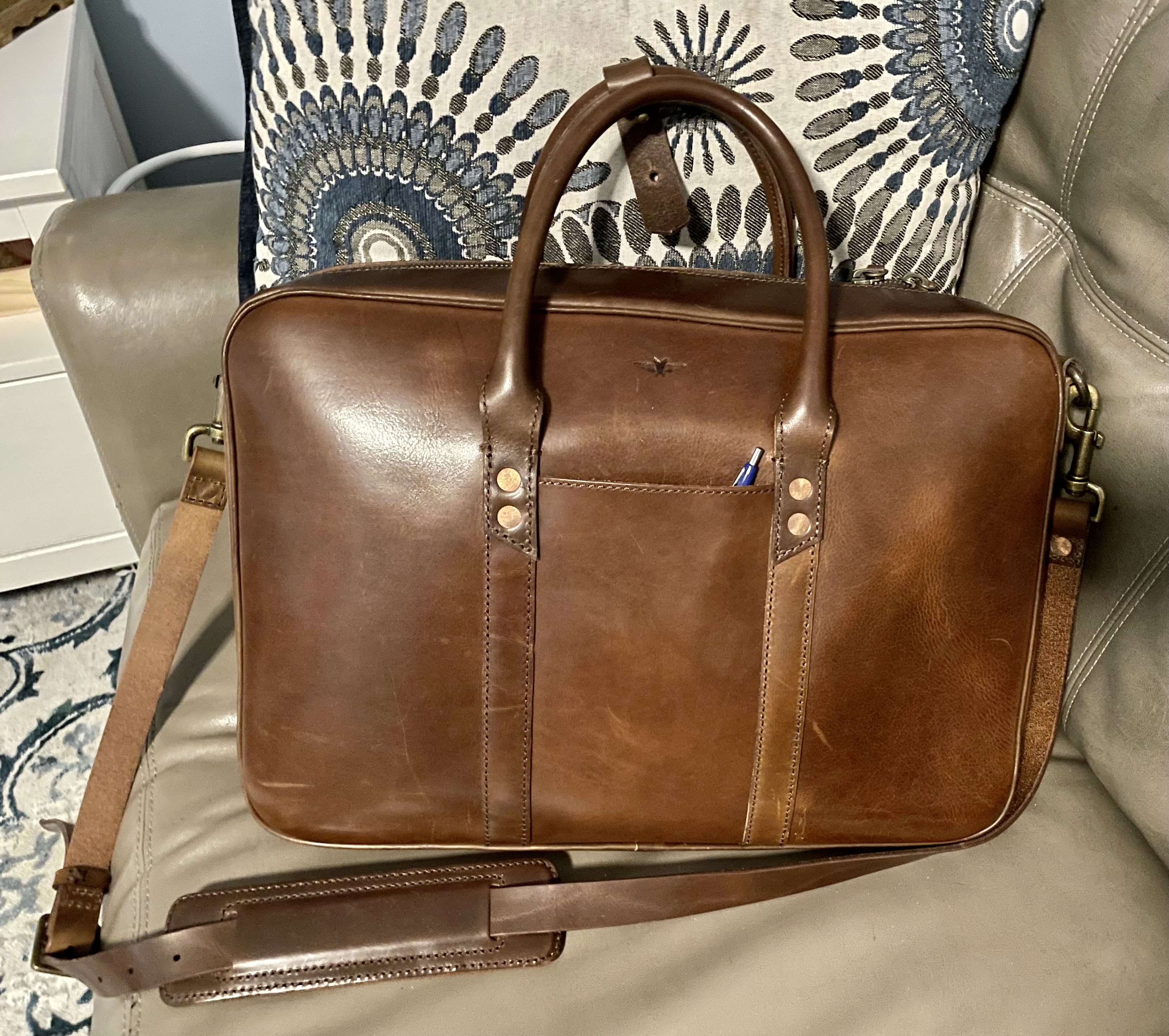 A leather satchel like others have recommended is fine, as long as your realize it’s just a briefcase/satchel with a strap.