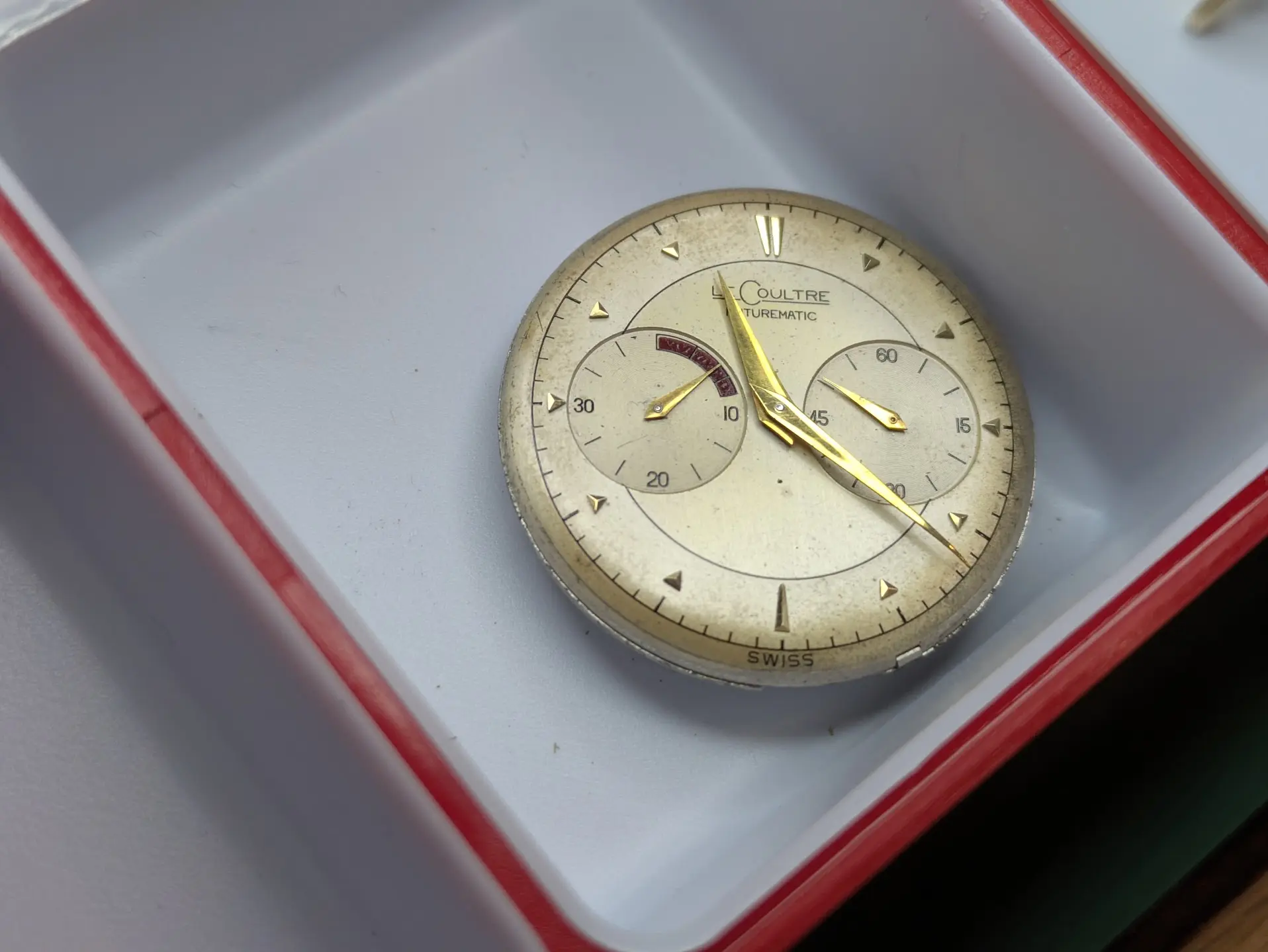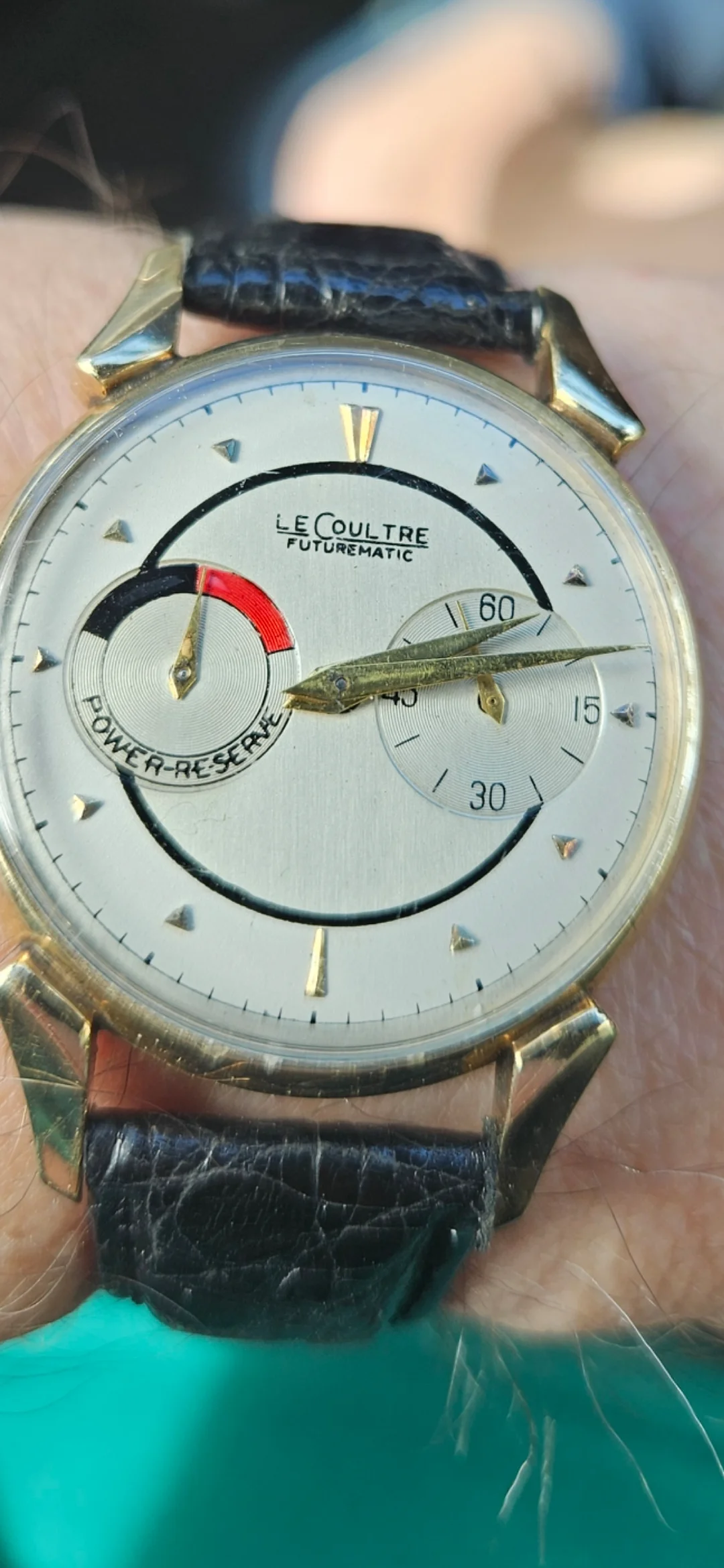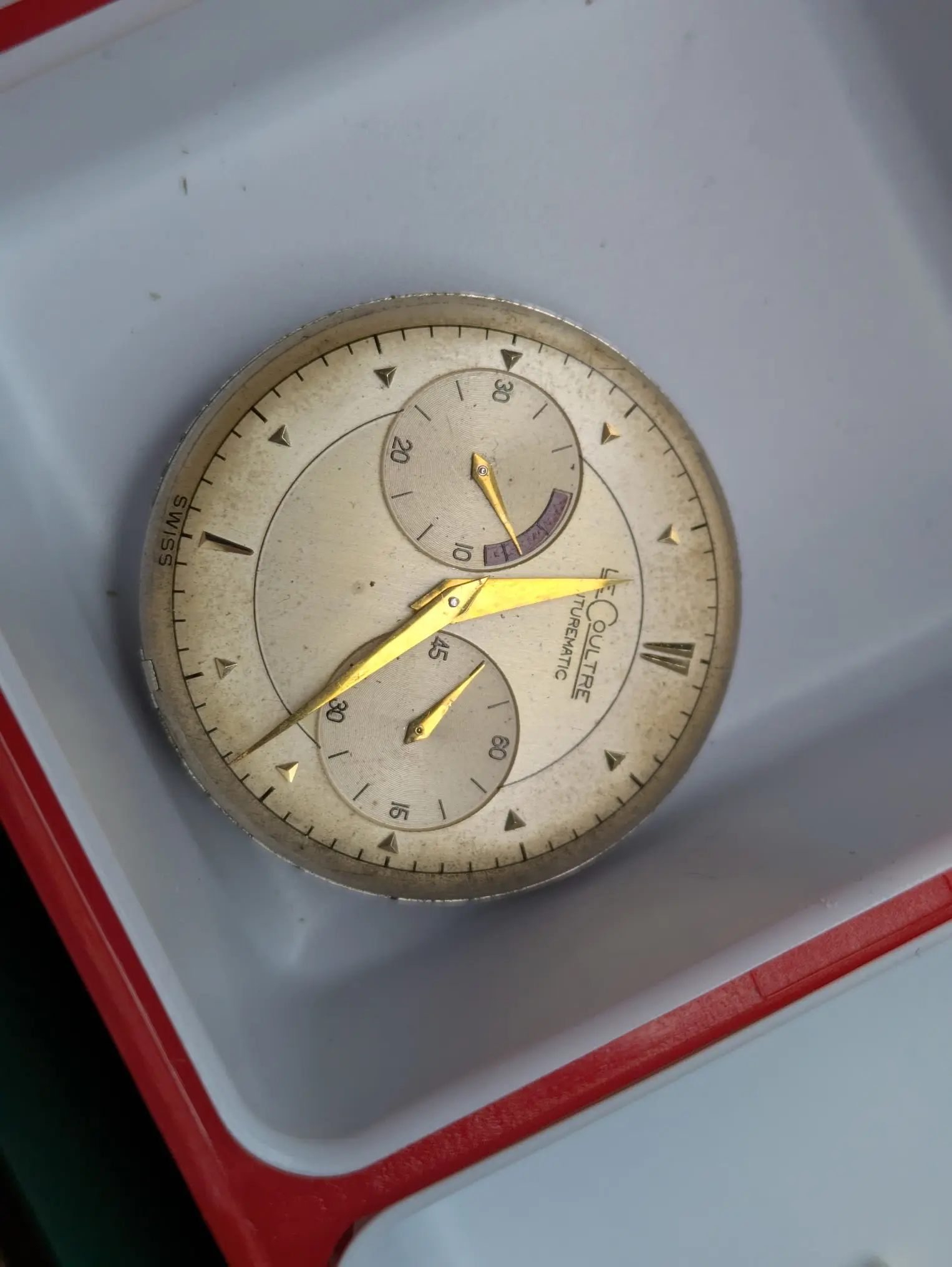 ·Looking for some input from the group on this LeCoultre Futurematic (cal. 497, gold-filled case). Movement looks correct and honest, but I’m unsure about the dial. The overall layout is right, though the printing—especially the “SWISS” at 6 o’clock and some of the text weight—gives me pause when compared to other known originals. I’d appreciate experienced eyes weighing in. Thanks in advance.