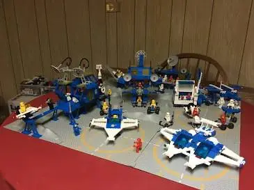 As a kid I was all-in on the Lego space sets of the 1980s. Some of those sets came with the grey moon surface squares and I build a whole moon surface on a table in the basement with around a dozen space sets. Below is not a picture of my actual sets but I owned most of these and others and is a period correct representation of what I had, complete with the apparent 70s basement decor that was probably given over to the 80s kids when the parents didn’t need a romper room anymore.
