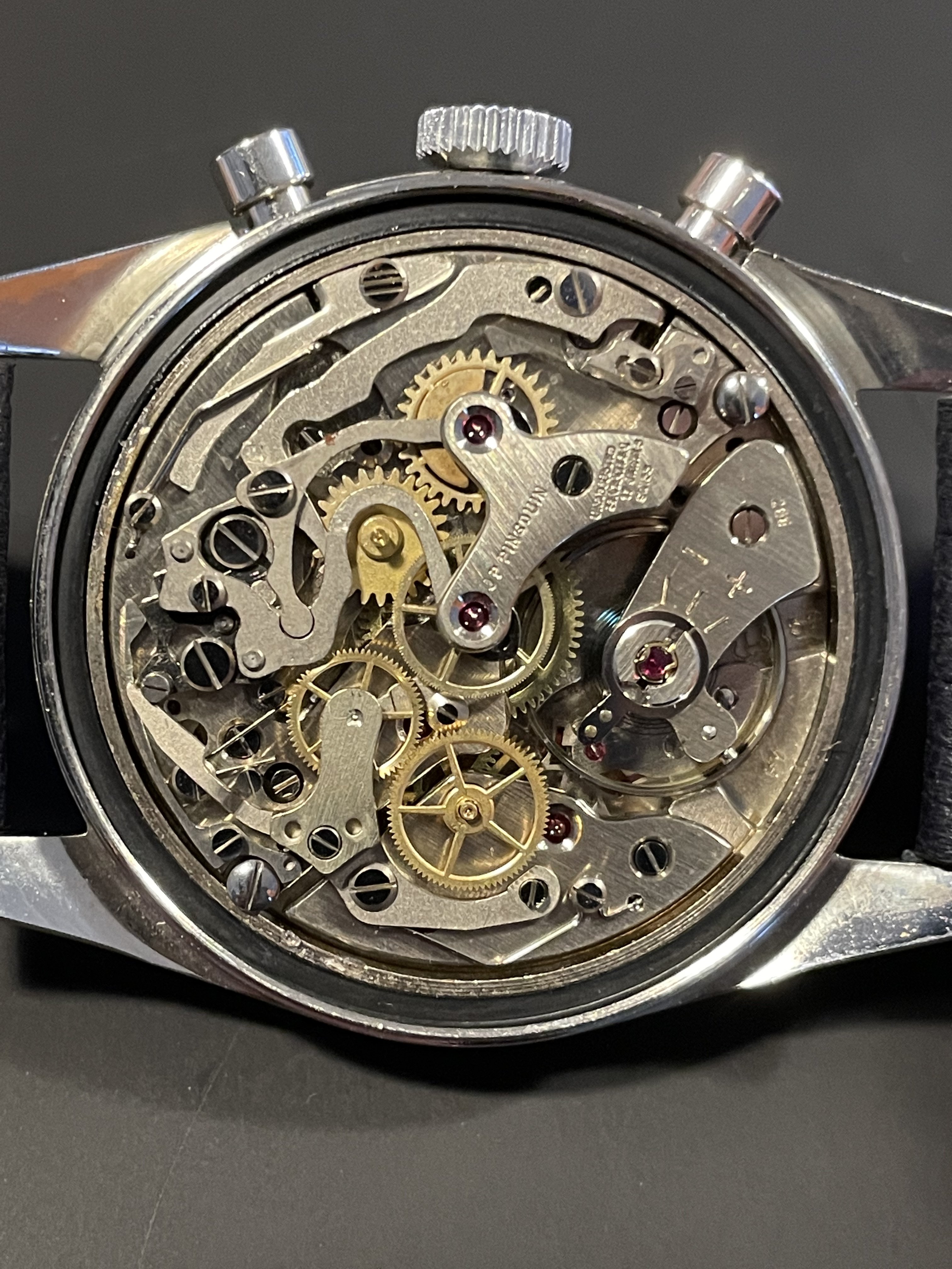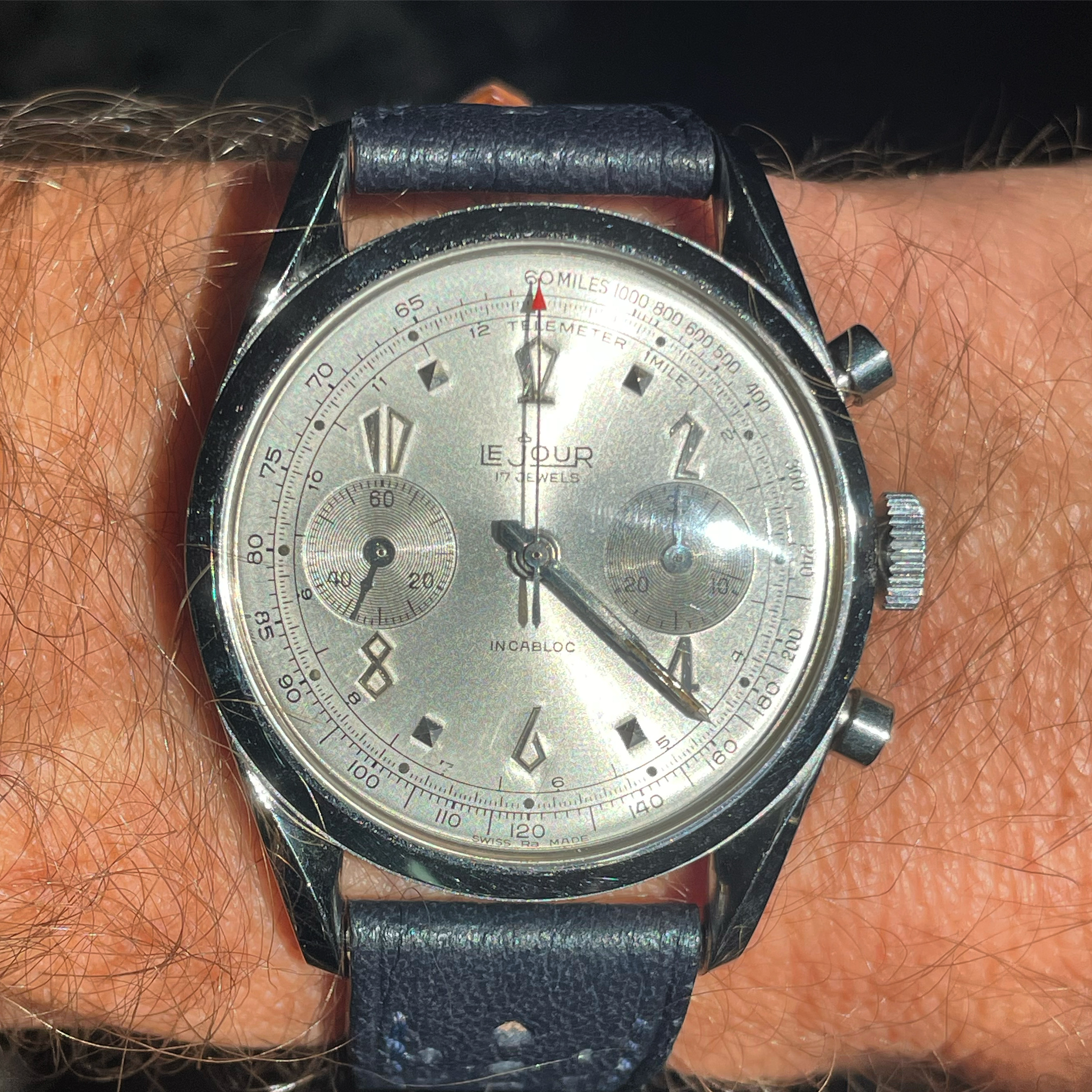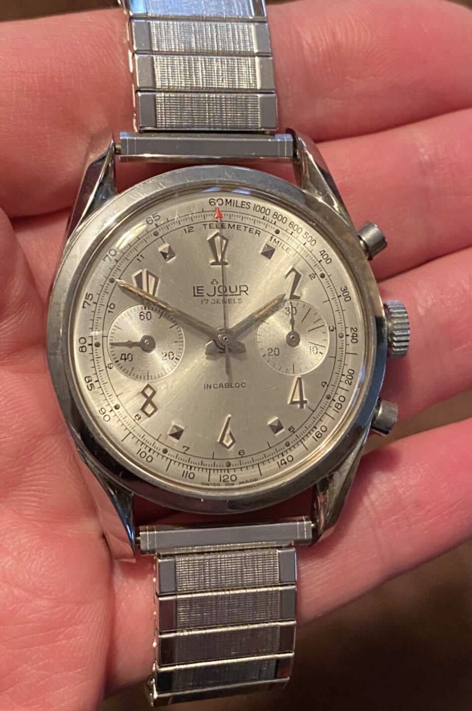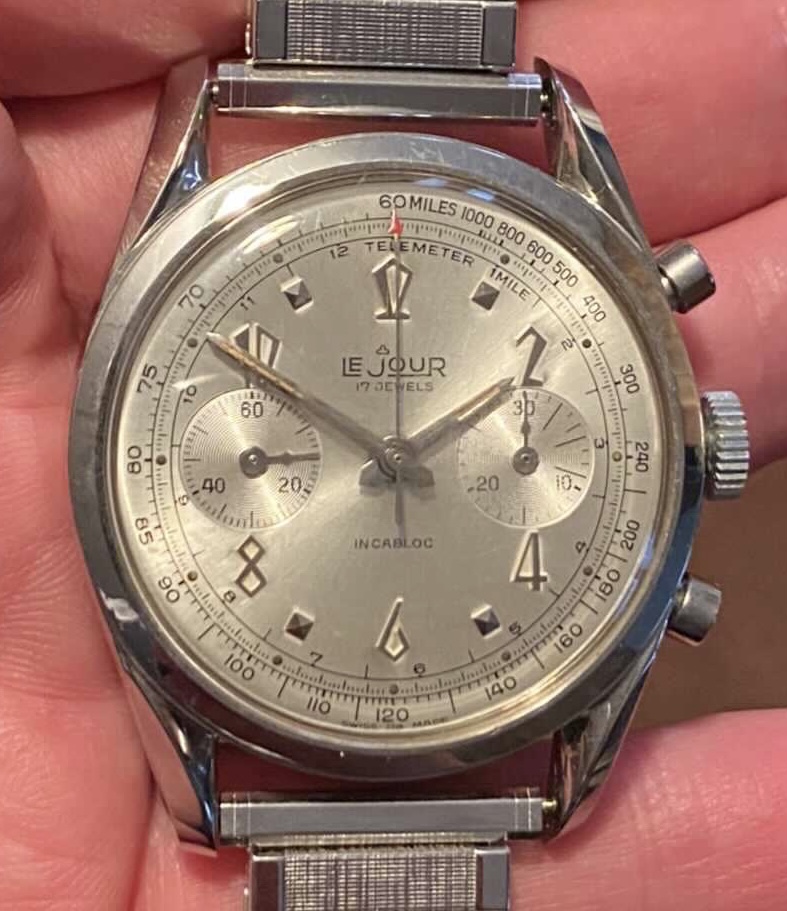 ·Up For Sale…This rarely seen vintage early 1960's LeJour chronograph has a light silver satin "SWISS Ra MADE" signed dial that is in lovely condition and the original radium on the dial and hands, denoted by the "Ra" signed at the bottom of the dial, remains fully intact, no longer glows after being exposed to bright light and has aged to a deep patina. Case size is between 36-37 without the crown…No service history…My asking price is $1k usd + Shipping…I'm obviously happy to answer any questions or provide more pictures. (The Watch is located in Florida)..Comes with a generic leather strap.