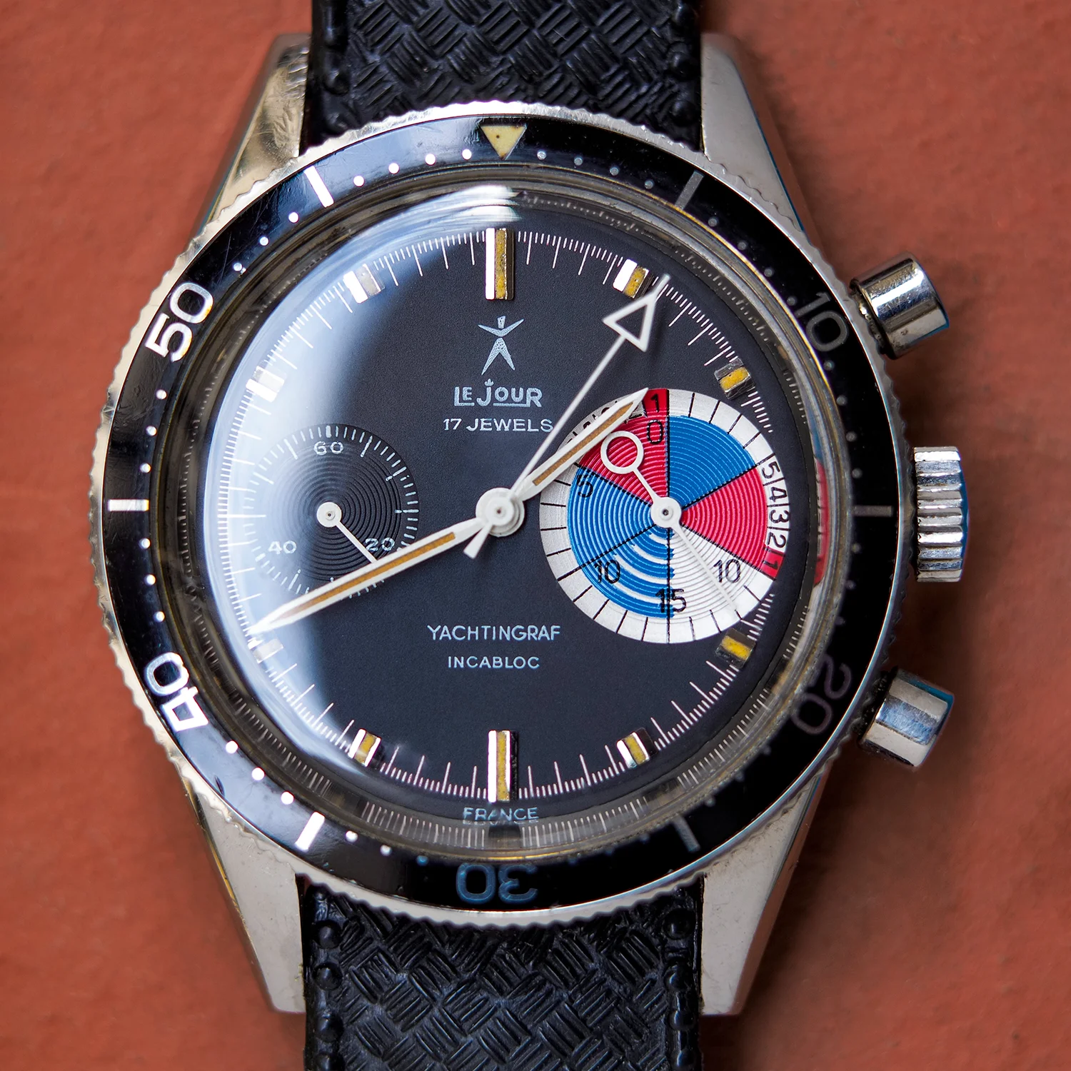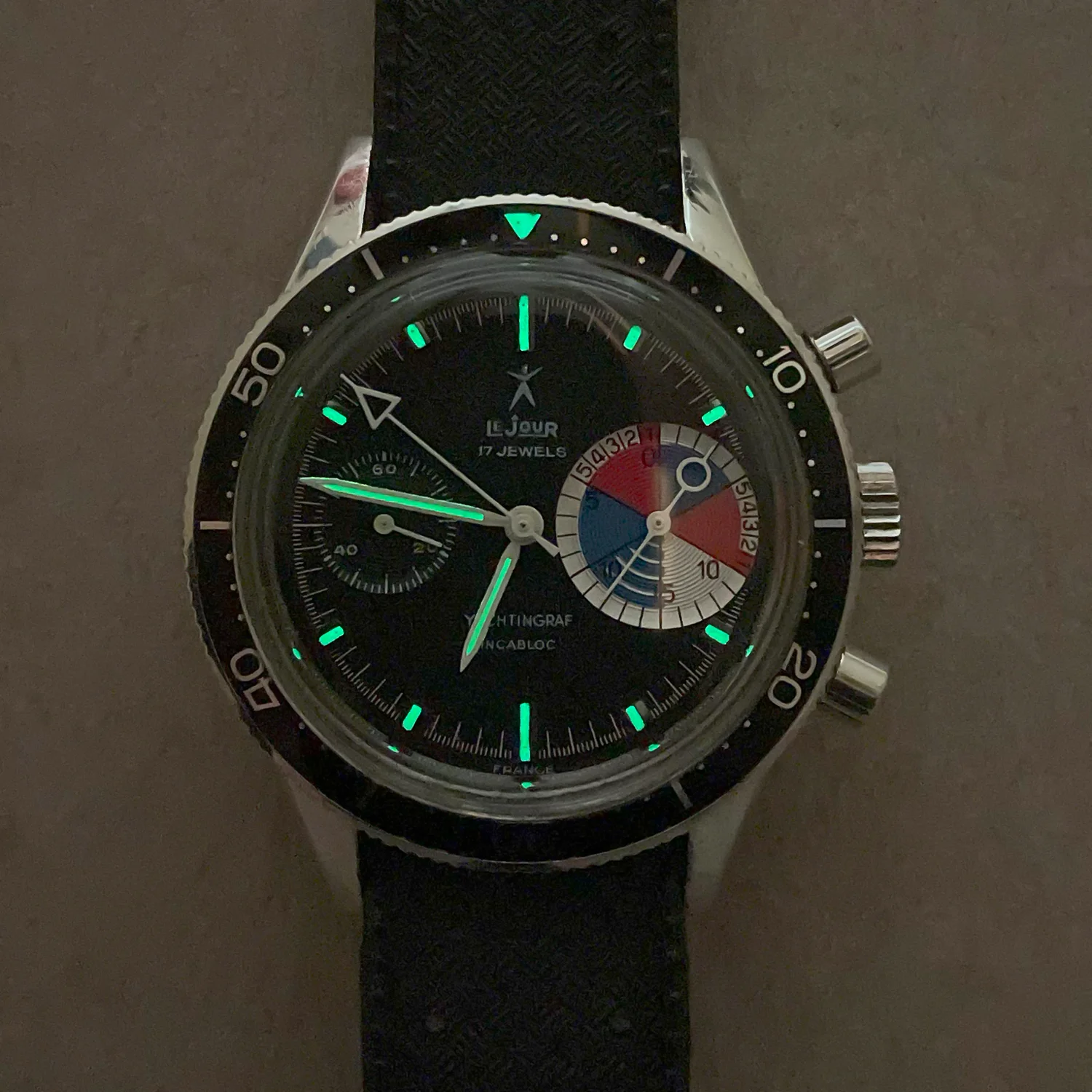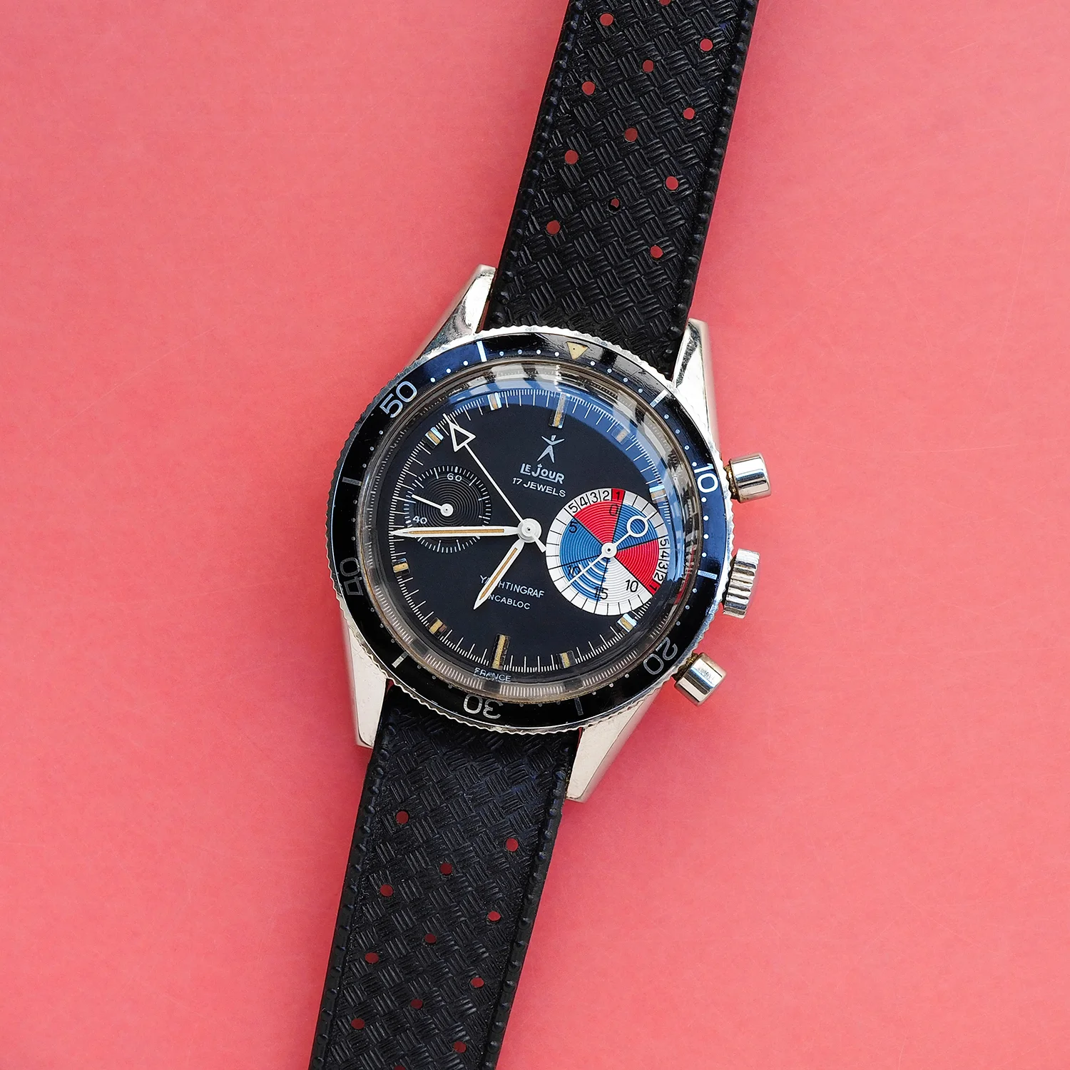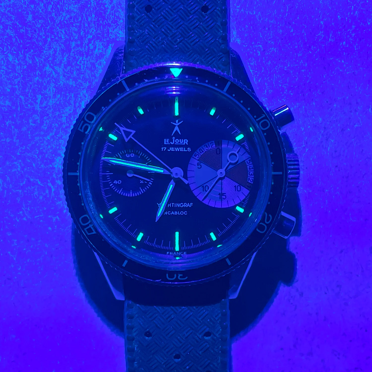 Notes / Condition: This is a beautiful example of the LeJour Yachtingraf. The regatta chronograph Ref. 9312 was manufactured by the French watch company Yema and sold under the LeJour brand for the American market. This particular Yachtingraf Ref. 9312 is an early production model manufactured circa 1967. Two key features indicate its early production: the “count up” insert sets it apart from the later iterations and the Yema crest on the caseback is an additional clue. I was fortunate to acquire this timepiece from the family of the original owner in 2016. The watch is in all original, excellent condition, even the rubber bracelet is original to the watch. The Valjoux 7730 movement is extremely clean. Without any watchmaker’s marks, it’s possible that the watch has never been serviced. The screw heads are pristine. On the dial, the tritium lume becomes uniformly activated when exposed to UV light. Straight lug case is sharp and likely unpolished; it shows a few minor blemishes from wear. The watch winds and keeps accurate time. The chrono hand resets to 12:00.