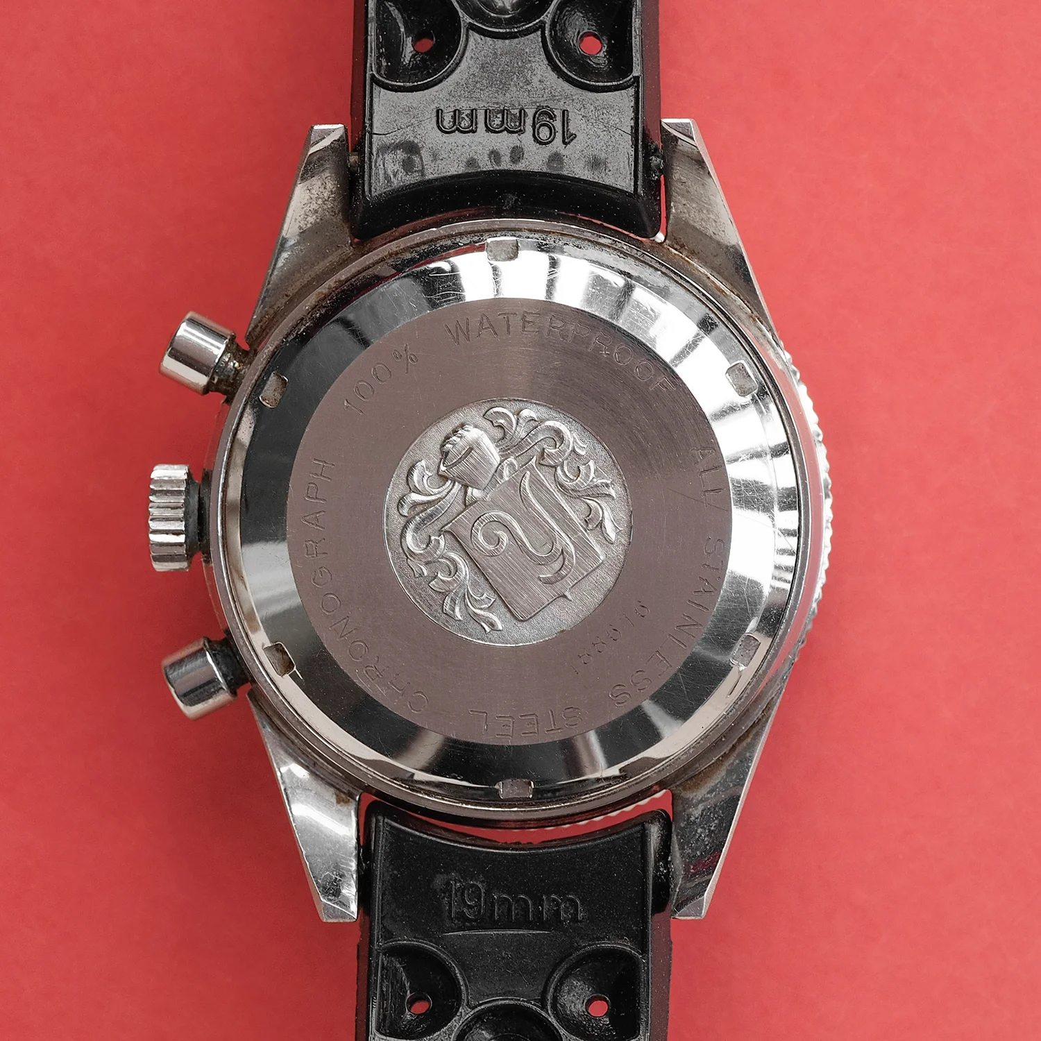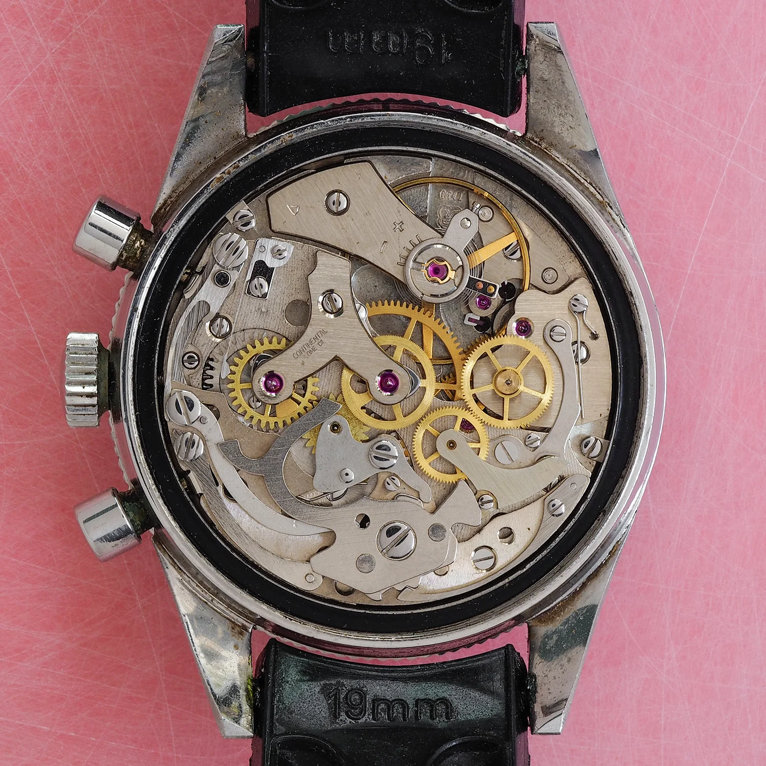 Case / Caseback: Straight lug case measures 38mm diameter with a lug width of 19mm. Early production Yema crest caseback with Continental Watch Co, France 9312 stamped on the interior.
