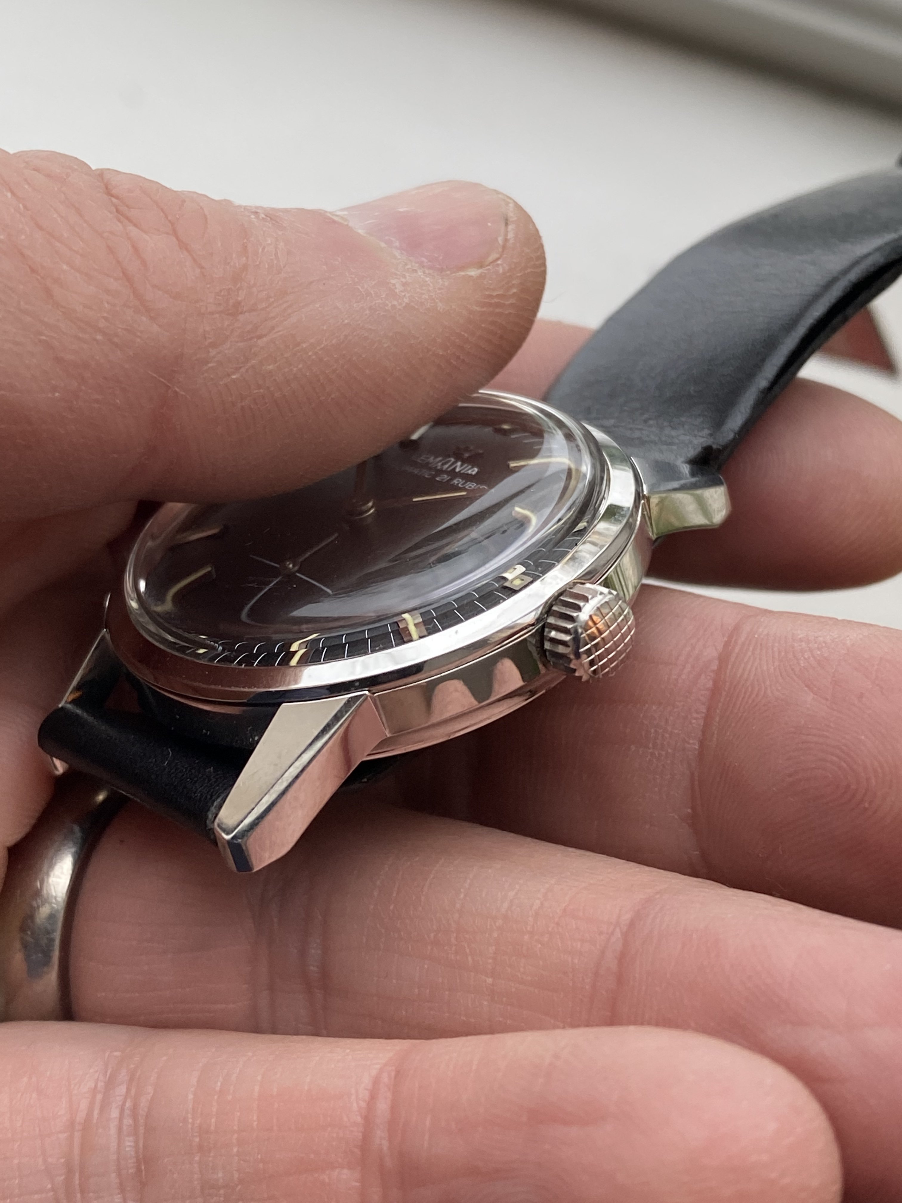 The dial has a small scratch or dust(can't make it out with a loupe myself). From my knowledge the watch has never been opened (and I don't want to do that either) and I wasn't aware of the mark until I looked closer before this post(maybe I'm getting old...). Located under 21 rubis. In my opinion it shows more in pictures rather that IRL.