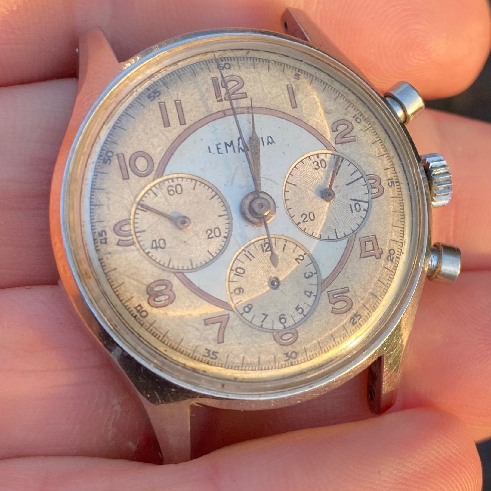 I believe all parts to be original to the watch, except naturally for the missing minute hand and chrono hours hand.