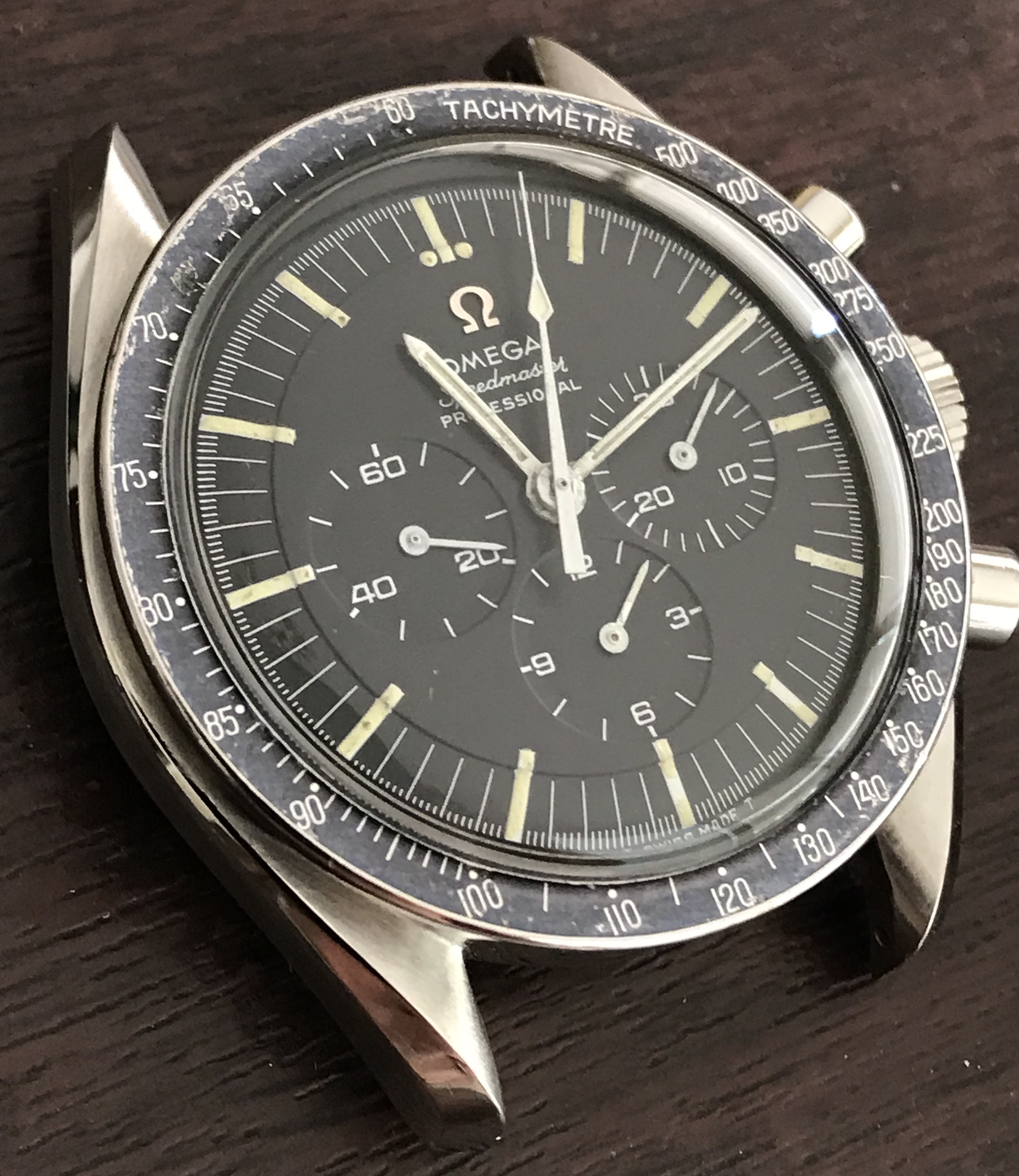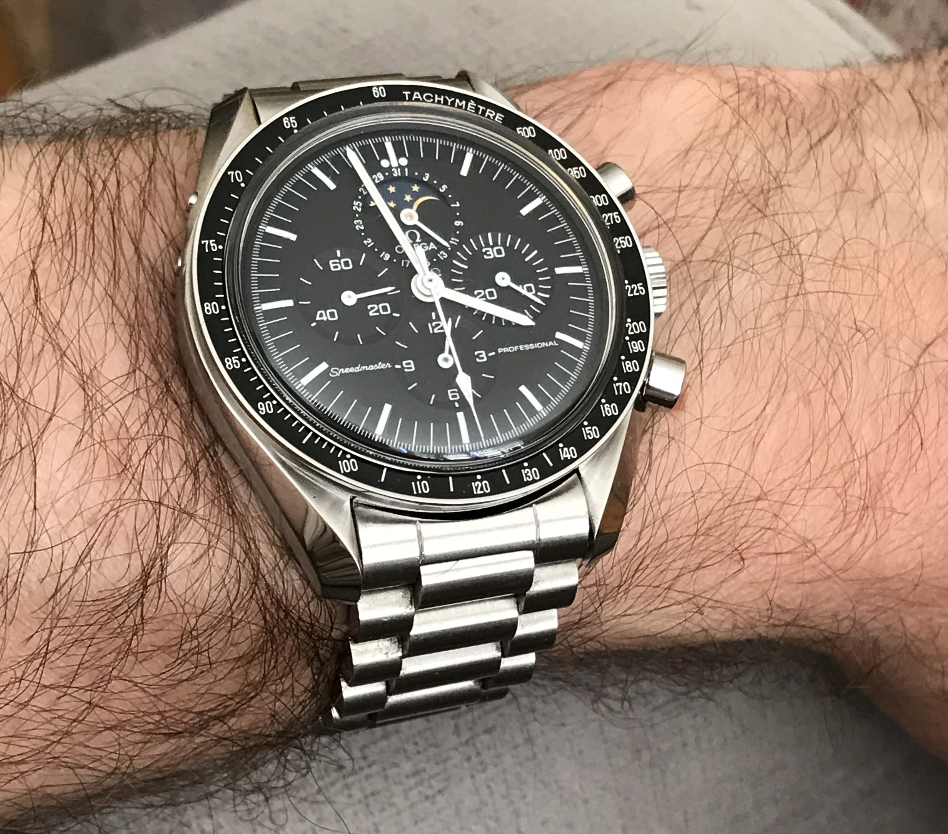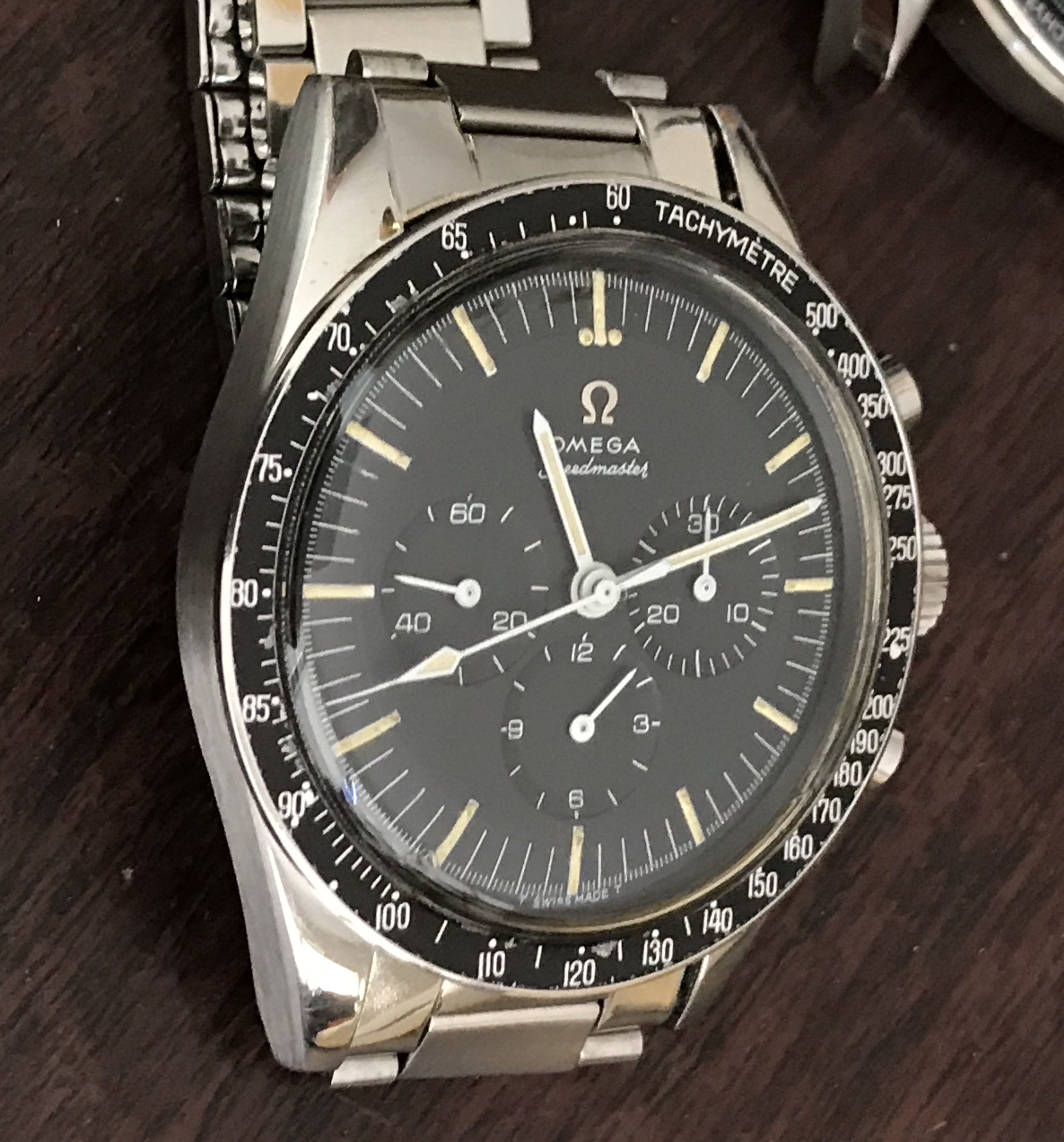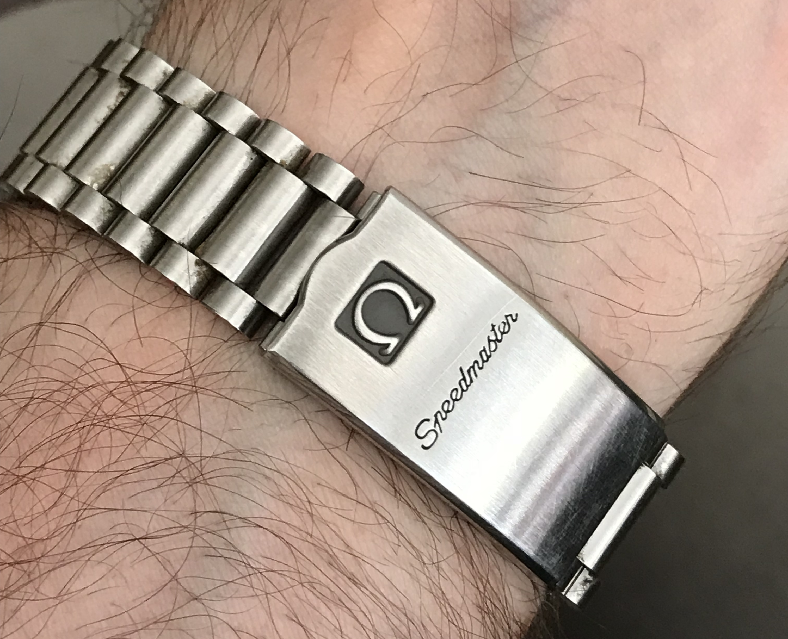 I put the 1450 bracelet on the Lemania-Omega Speedymoon that I sourced on eBay months ago. Had to file down the 808 end links a little. The link pins are cotter pins for goodness sake. Worse than pins in sleeves or those tiny screw caps. Anyway, looks nice I think.