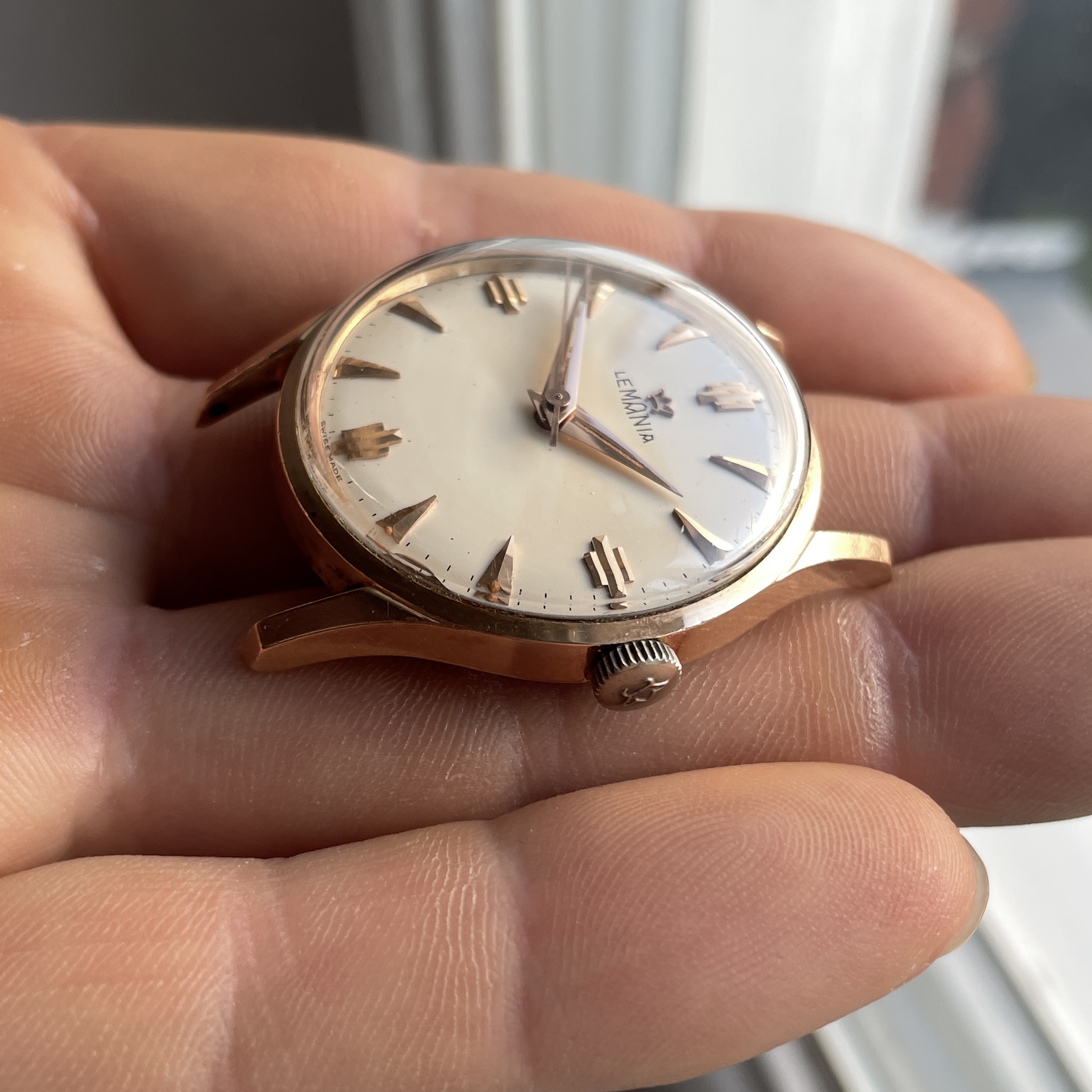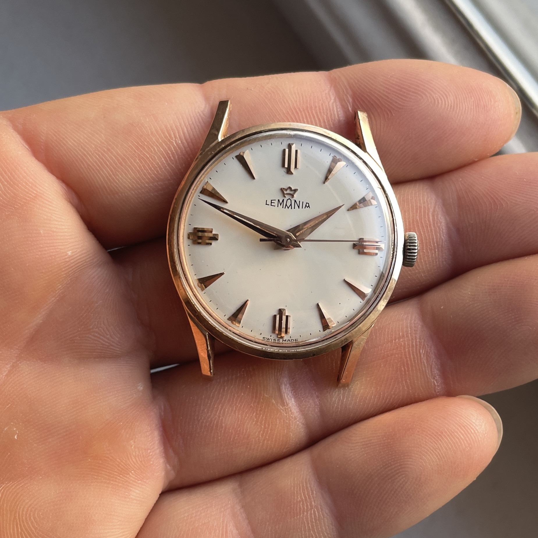 ·Nice looking 50s rose gold capped Lemania with very cool indices and cream white dial.