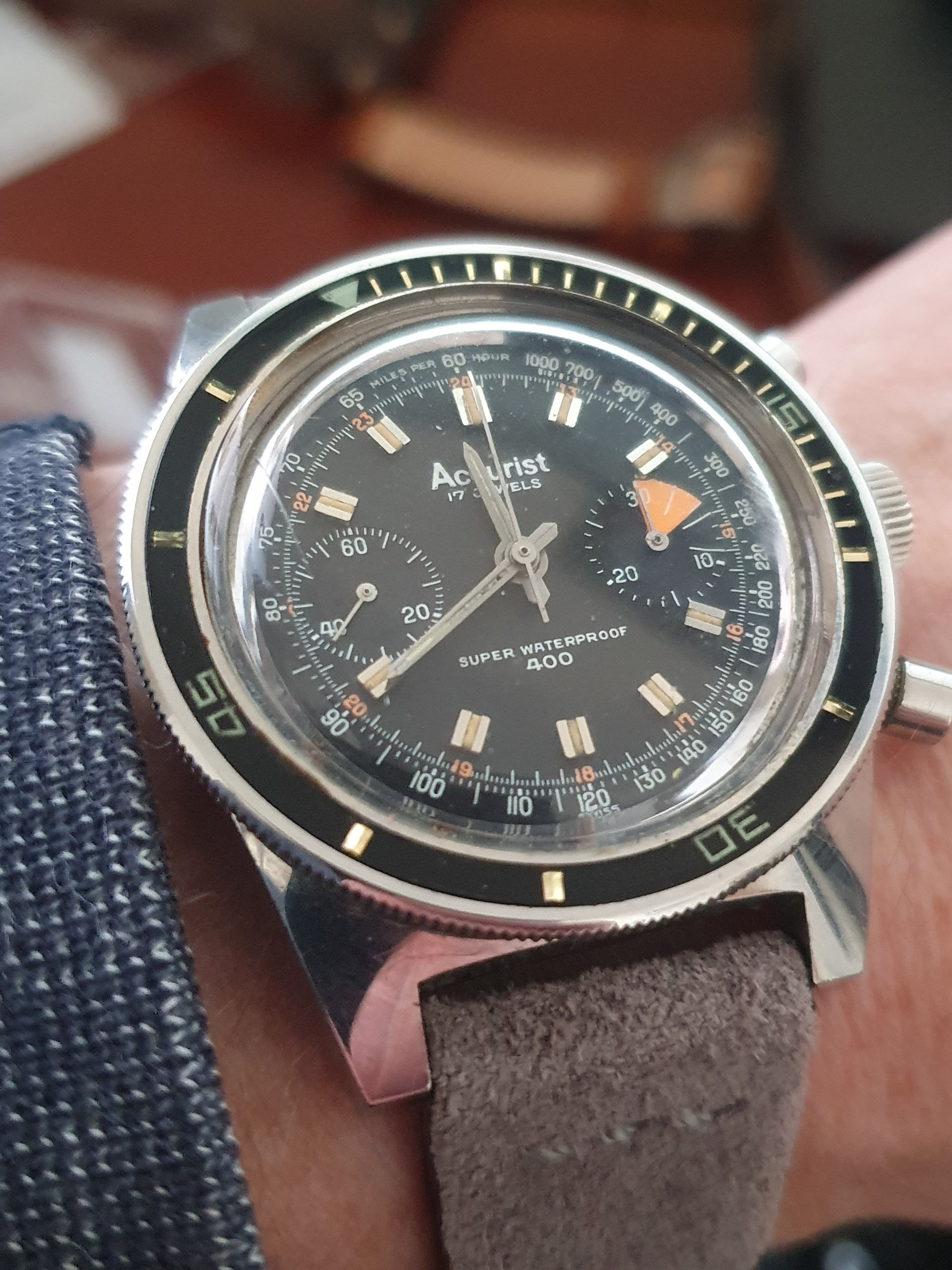 ·Grabbed one of these recently, since I've always had a weakness for bakelite bezels and the ref 2002/Jenny cases. Really happy with the "digital" numerals on the bezel, the tapered batons, the furniture, the regetta timer, and the red-orange 24 hr. numerals. Attached a grey-suede band from bandsrbands in lieu of a metal bracelet or tropic rubber, eh voila!