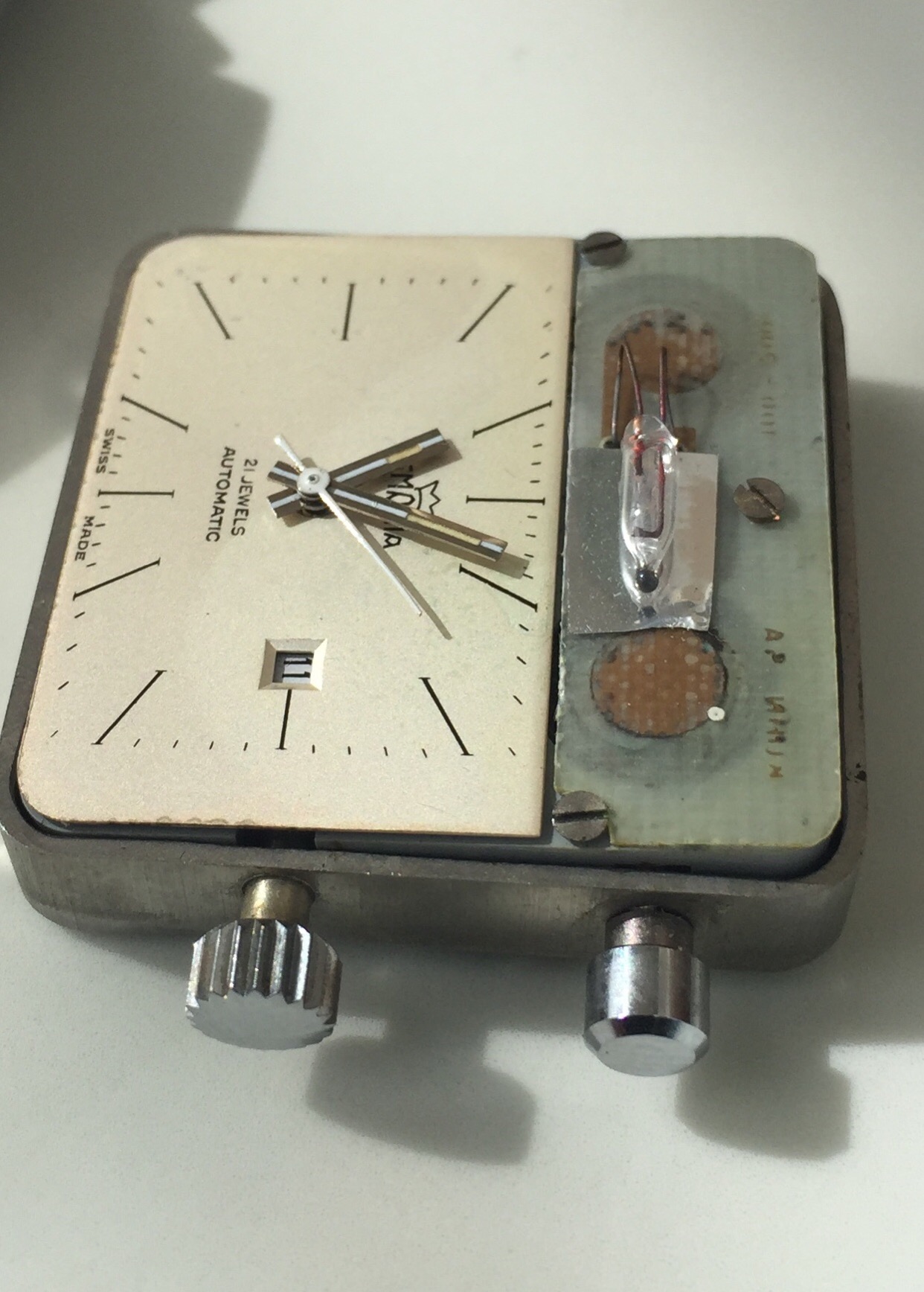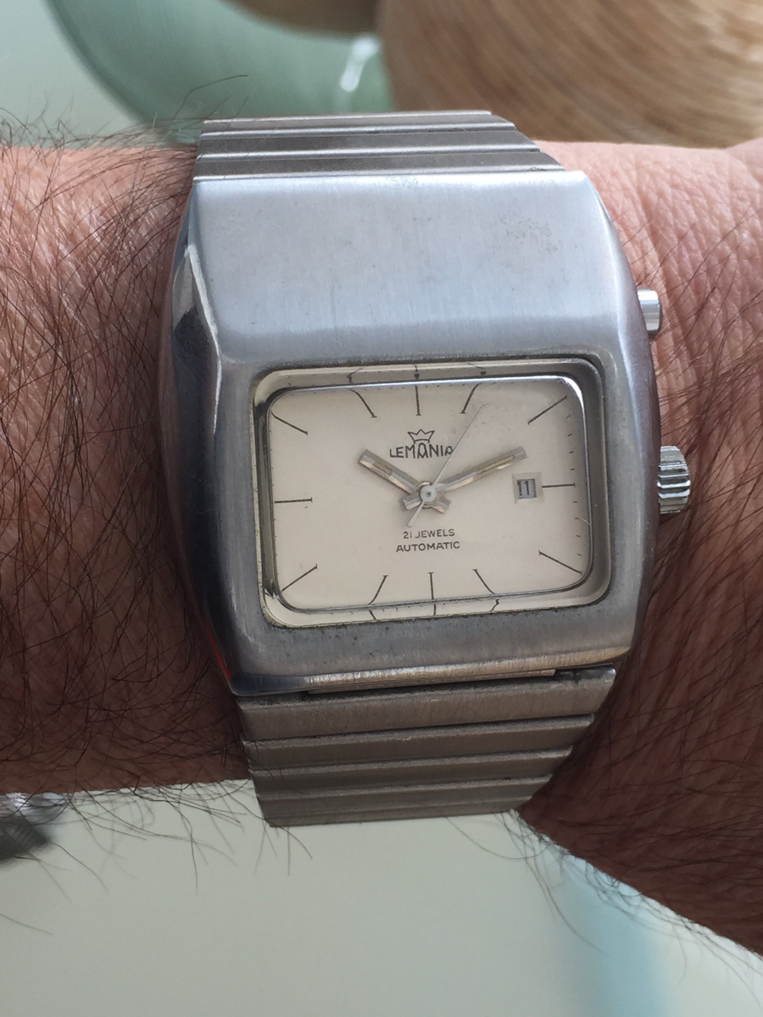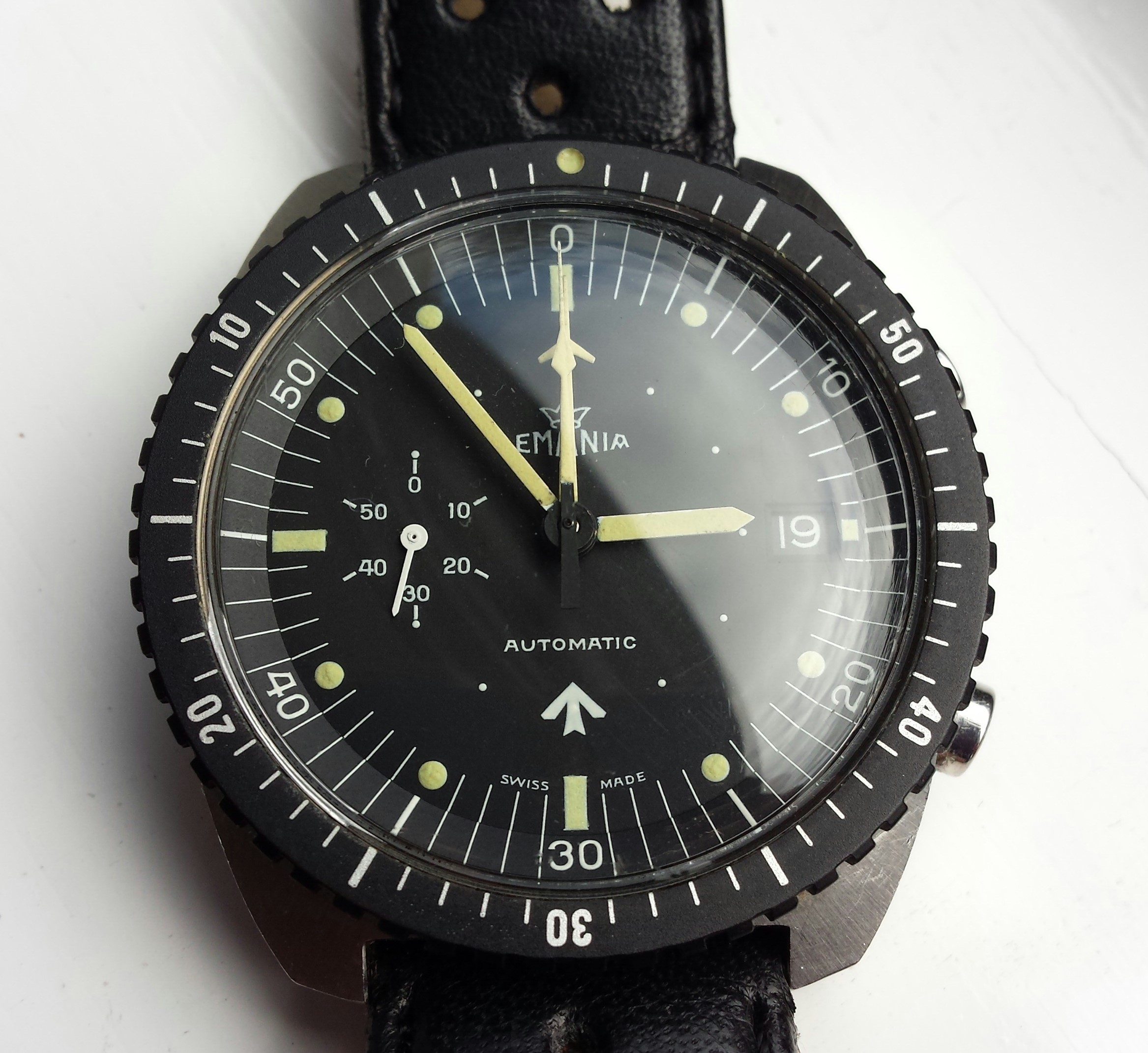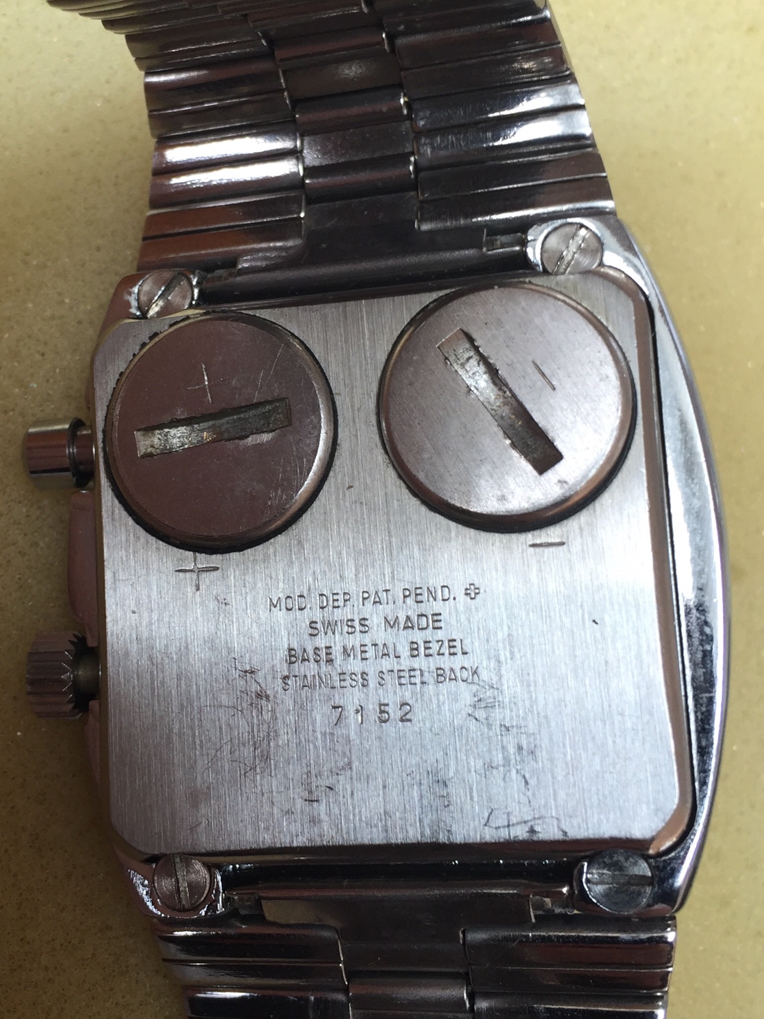 I’ve been keeping this big boy under wraps for years so nobody gets too excited! The top button is for an internal dial illumination driven by two batteries accessed from the case back. Watch is an auto.