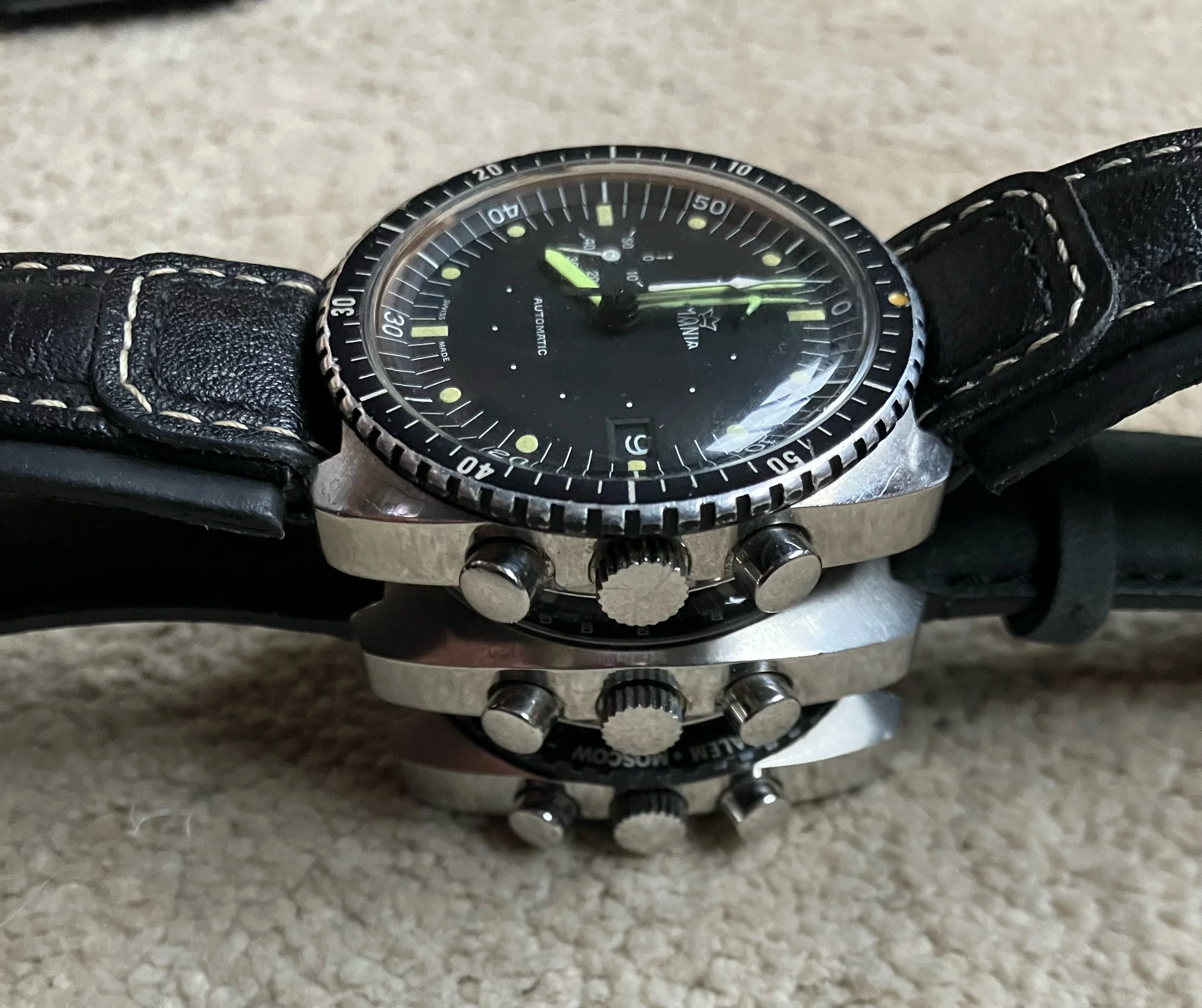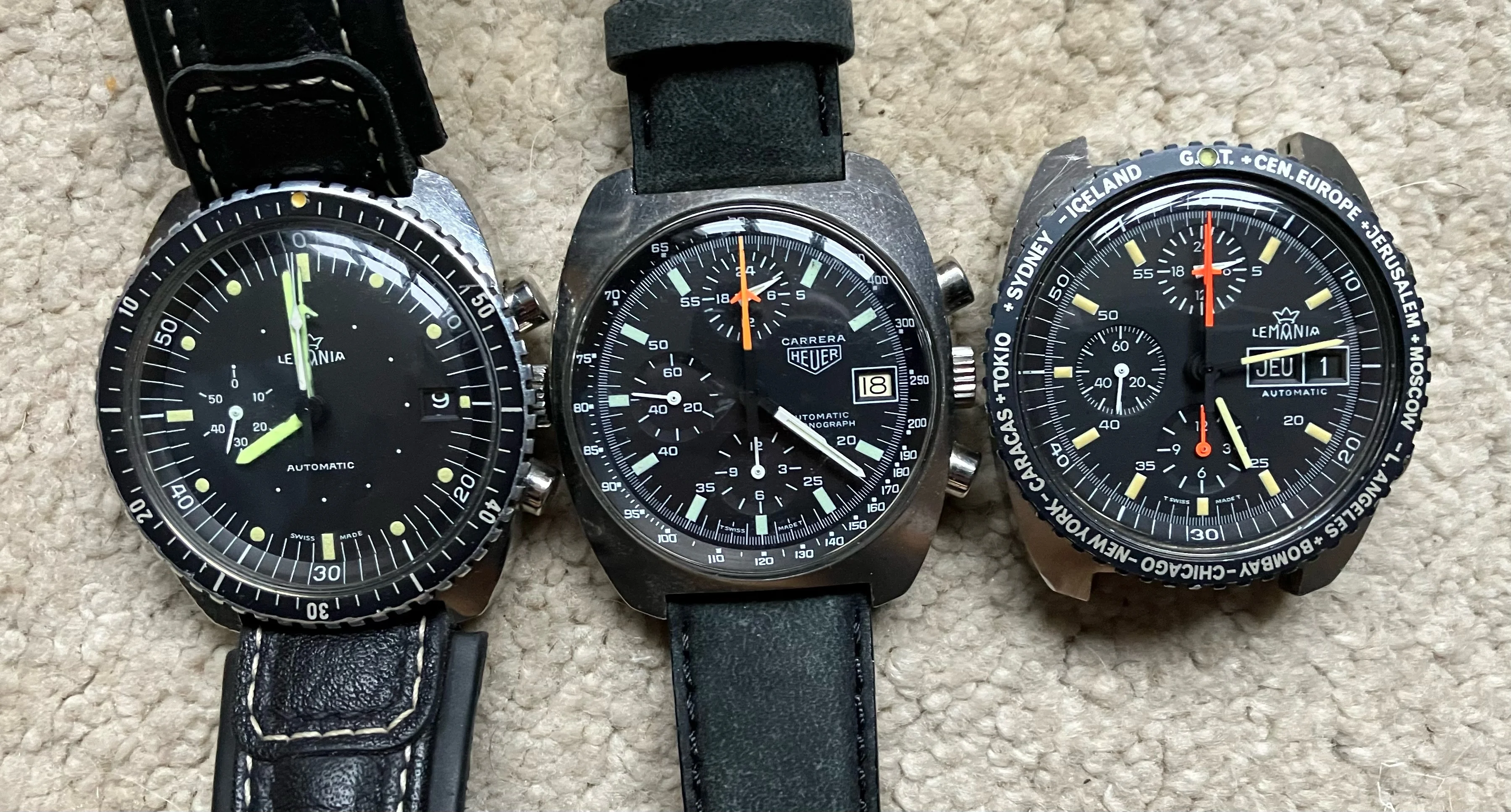 Here is the same case, made at the same time but for different people - the SAAF Lemania we all know, the Heuer Carrera 510-523 and my recent new one, a Lemania World Time.