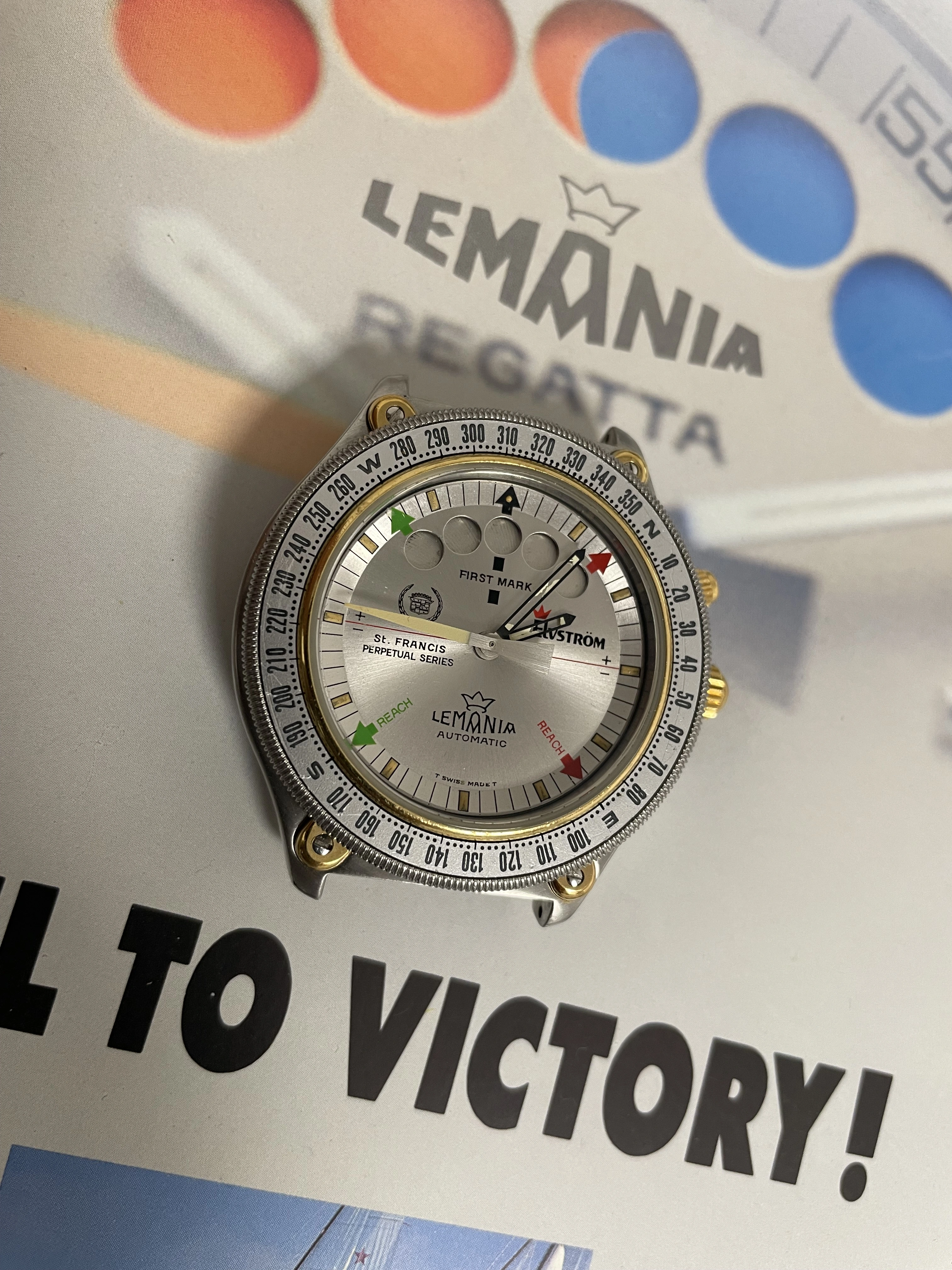 I guess that on that particular year, the St. Francis Perpetual trophy was sponsored by Cadillac, explaining the presence of their 1980's logo on the dial.
