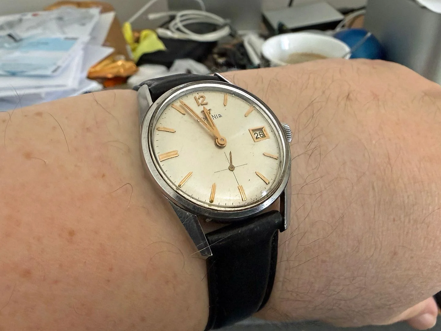 The case back has service markings indicating it was serviced in September 2024 (not long after it was listed here); during that service it likely received the missing hands and at least one screw in the movement. That said, when it came to me 5 months later via the eBay auction it still had some problems. Some issues were easy enough to fix, i.e. the movement wasn't properly secured in the case, but other issues with winding and inconsistent time keeping prompted me to send it in for service again. Happy to report that the 2nd service seems to have done the trick! She still shows her age a little (or maybe I just tend to baby her), but she is now fully functional and has survived days on the wrist.