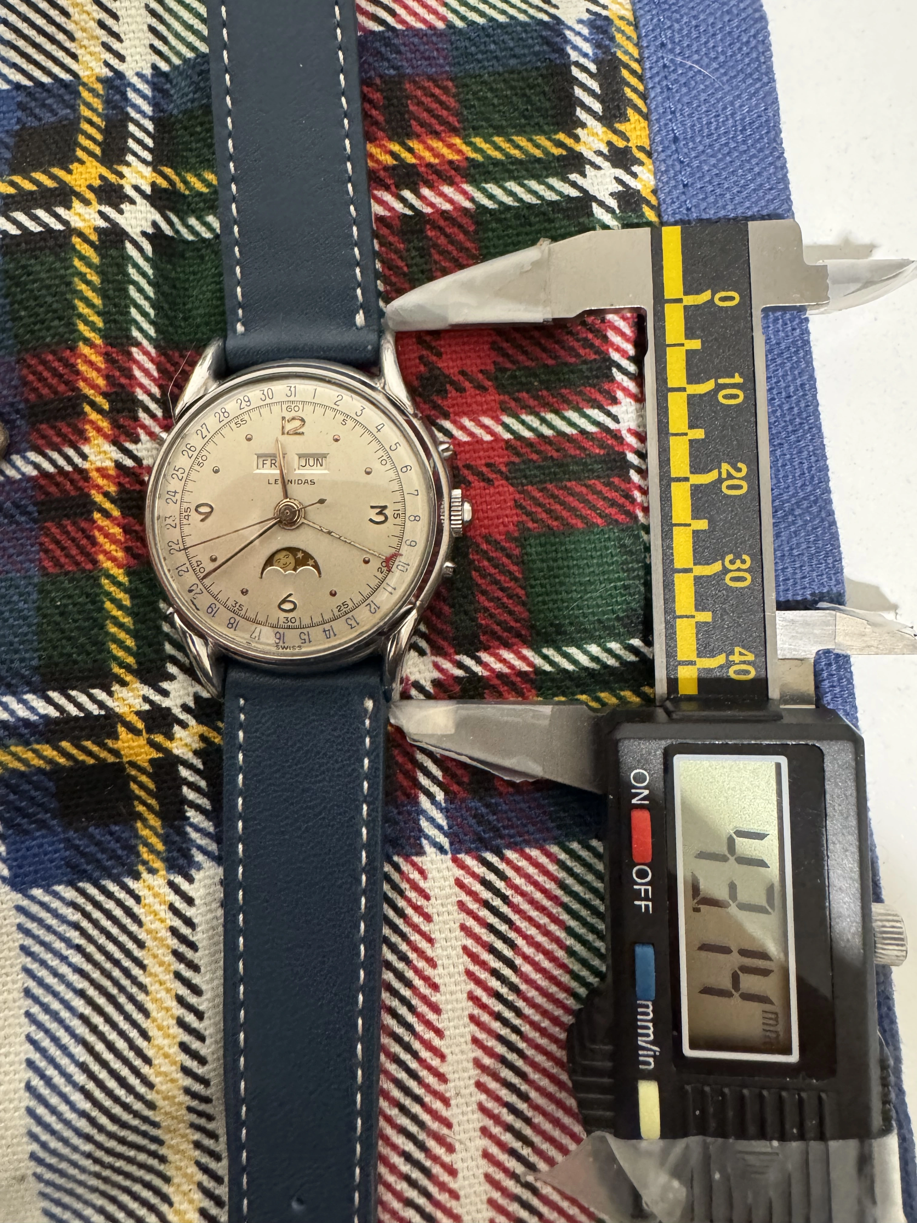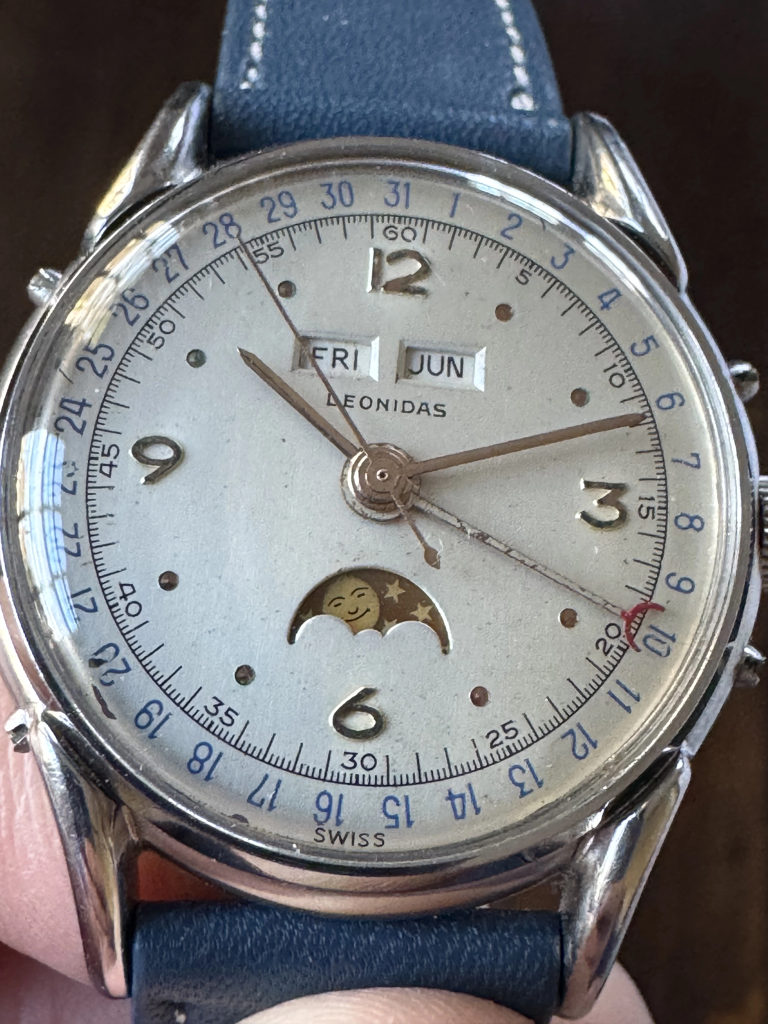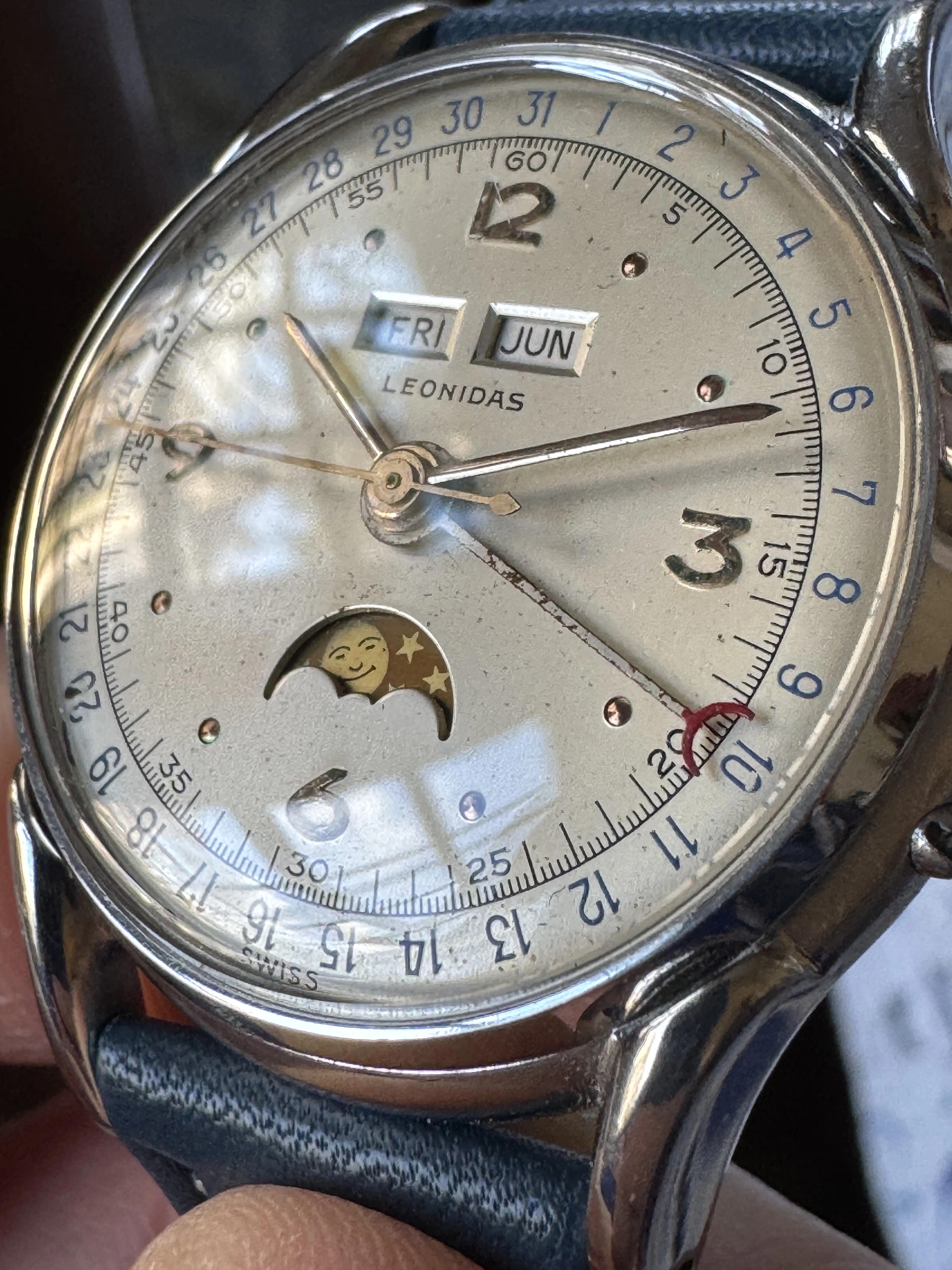 ·This is a very nice Leonidas moonphase triple calendar watch. Leonidas was later bought by Heuer but any connection to that brand in this era is a bit misleading from my point of view. The watch is steel, has fancy “cornes de vache” style lugs that make it wear larger. The dial has a really nice patina and it has the cool pointy original crown. All functions/correctors are working at the time of posting, has not been checked for accuracy but is running strong.