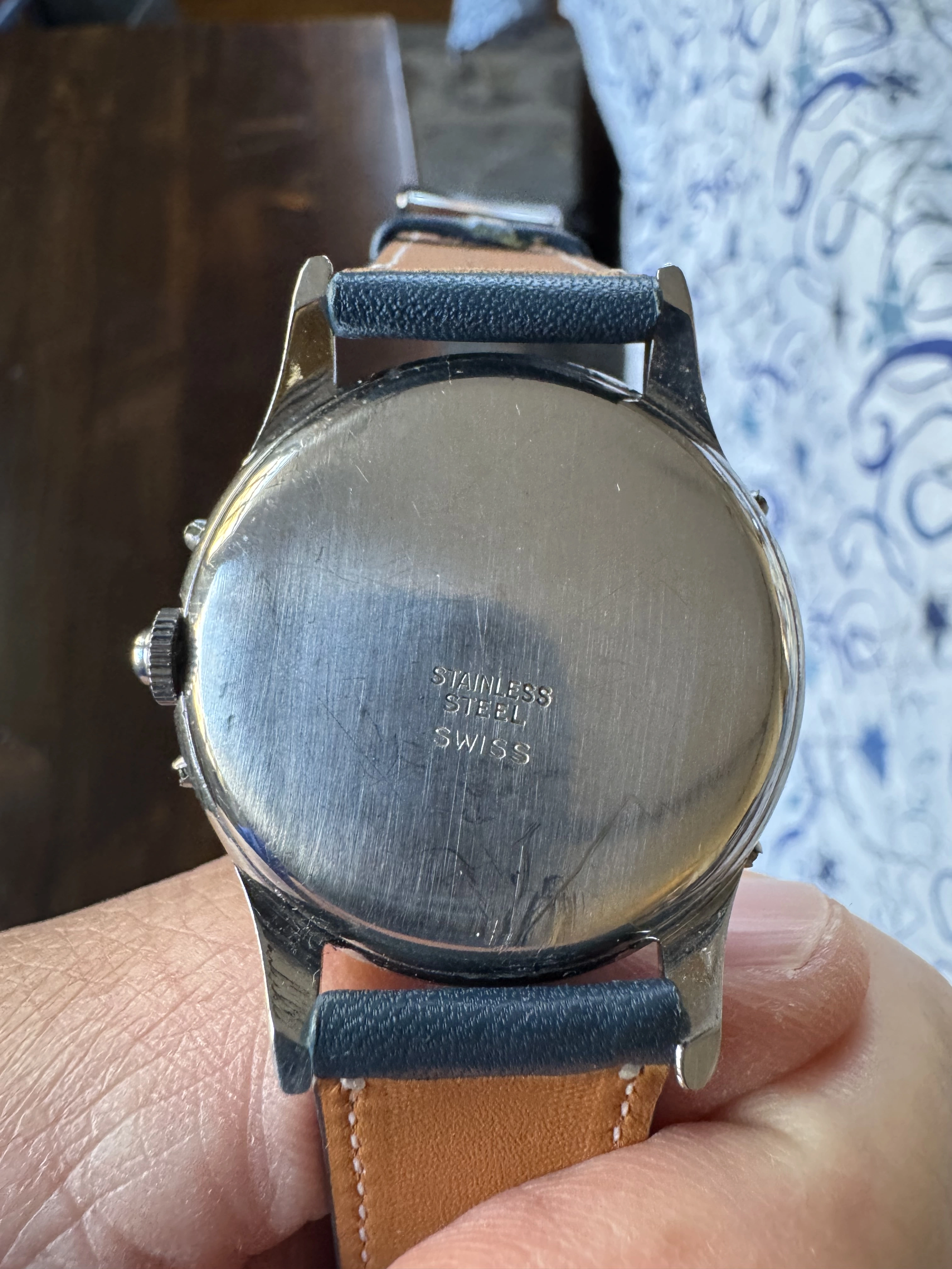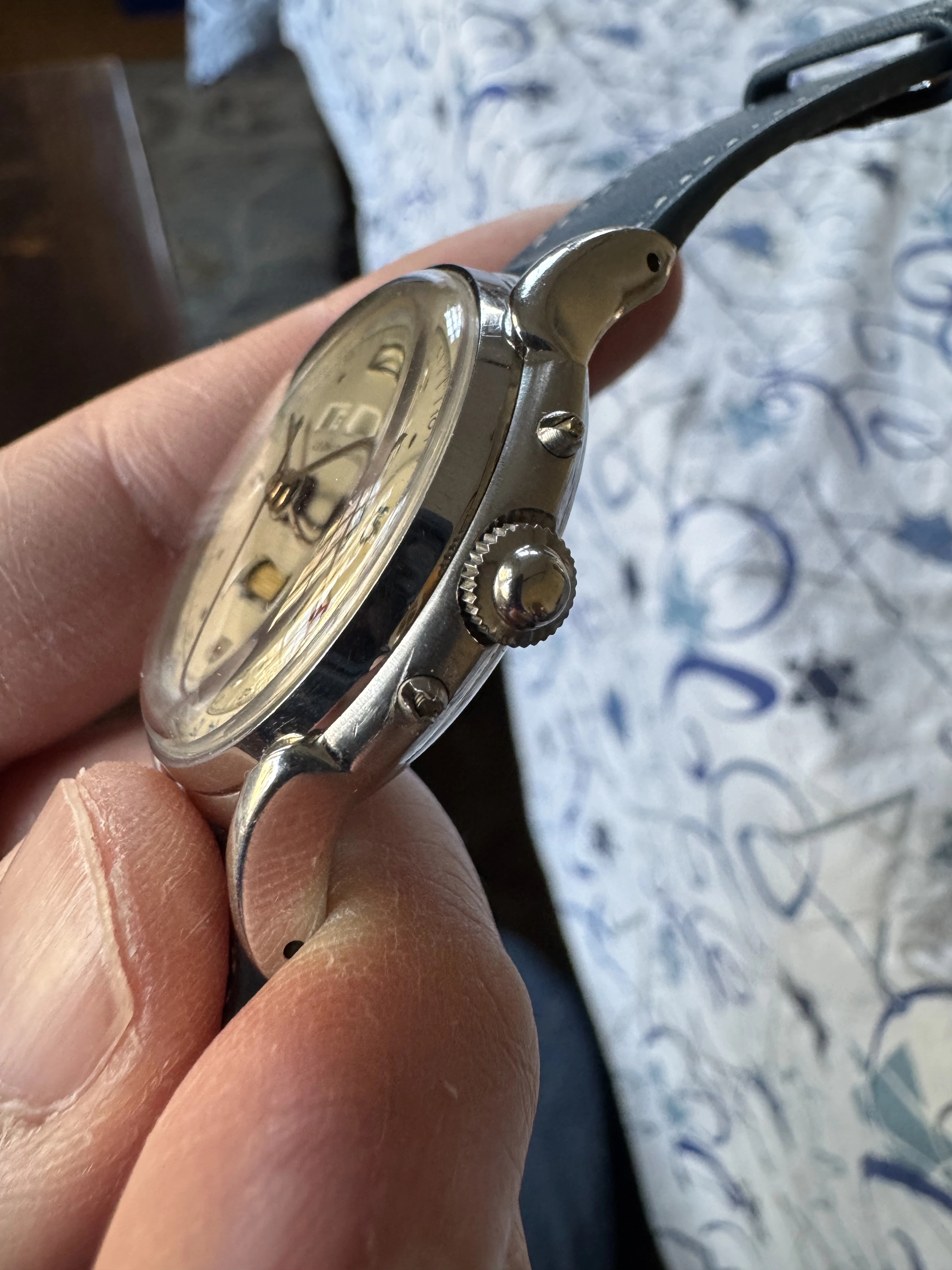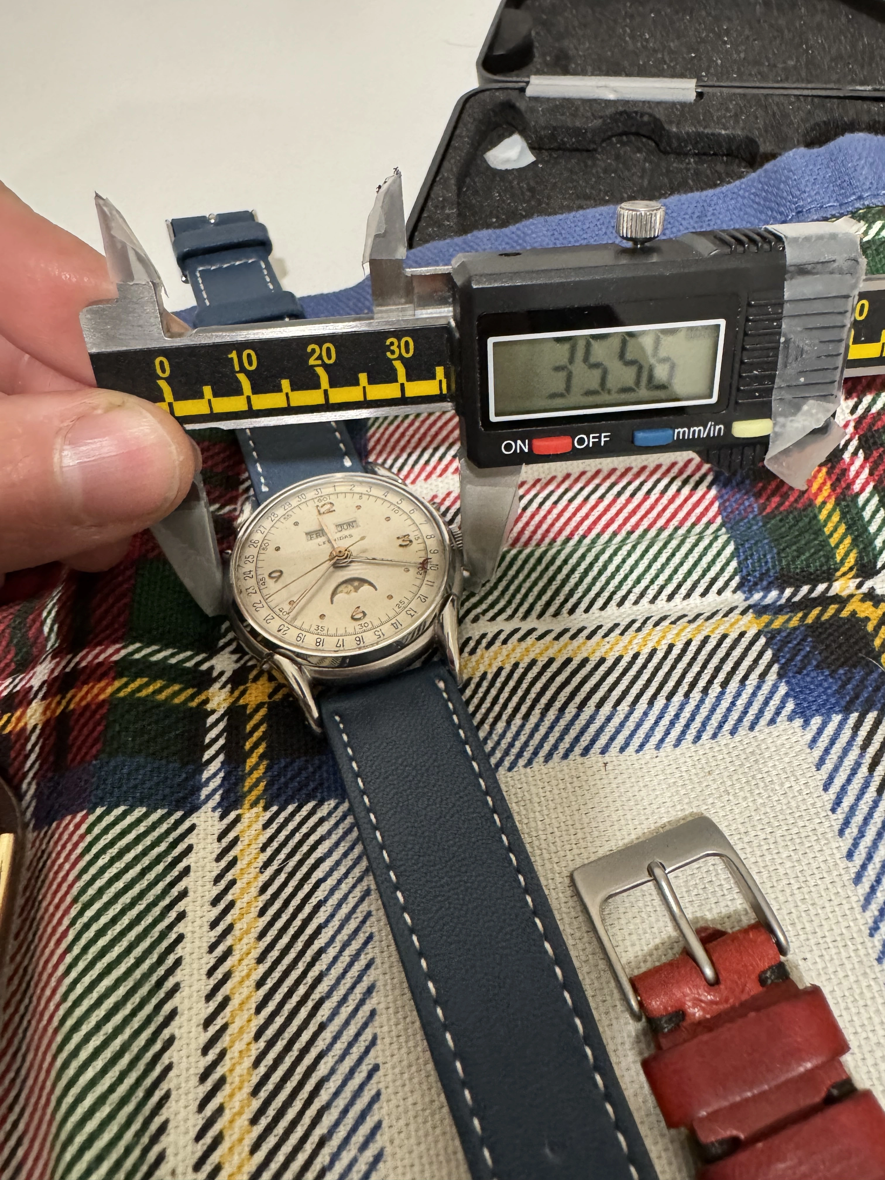·This is a very nice Leonidas moonphase triple calendar watch. Leonidas was later bought by Heuer but any connection to that brand in this era is a bit misleading from my point of view. The watch is steel, has fancy “cornes de vache” style lugs that make it wear larger. The dial has a really nice patina and it has the cool pointy original crown. All functions/correctors are working at the time of posting, has not been checked for accuracy but is running strong.