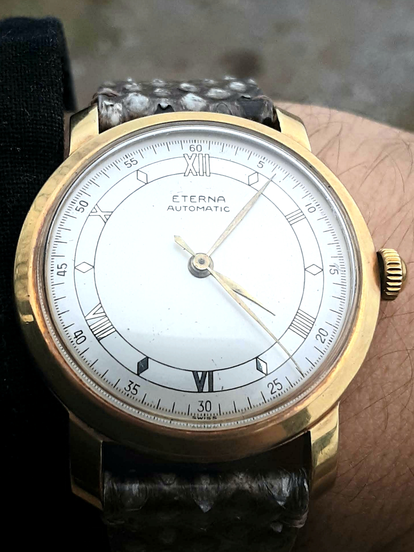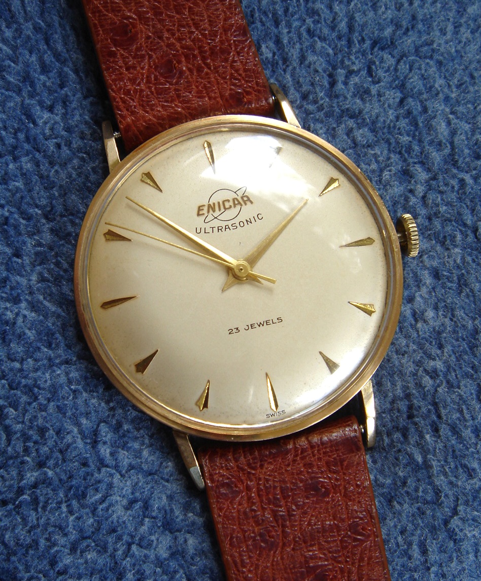 Nothing fancy but I do love the understated and well-balanced dial of this Enicar.. The simple incused gold indexes, the slim case and narrow bezel make the watch look much bigger than it's 35mm. Looks elegant to me.