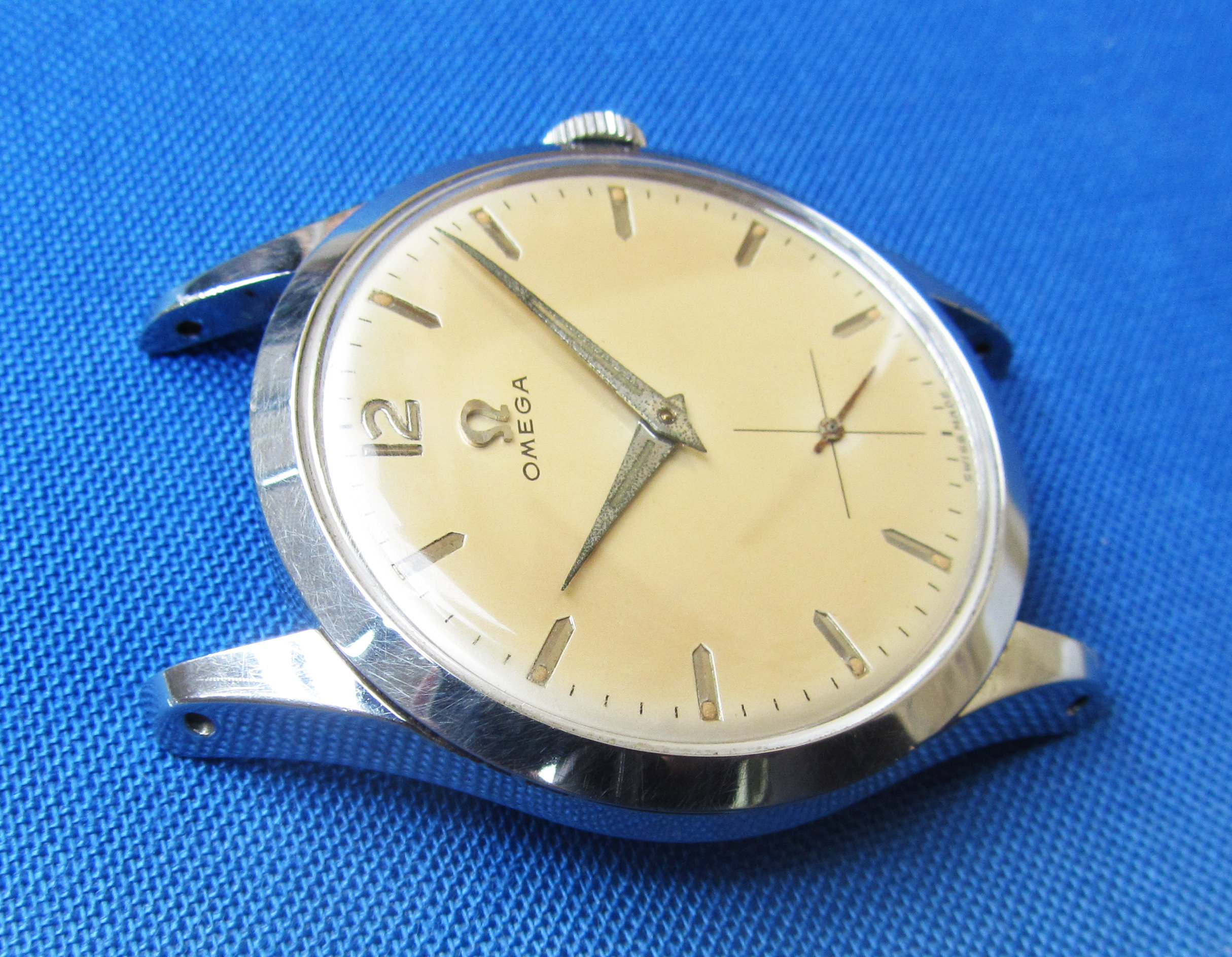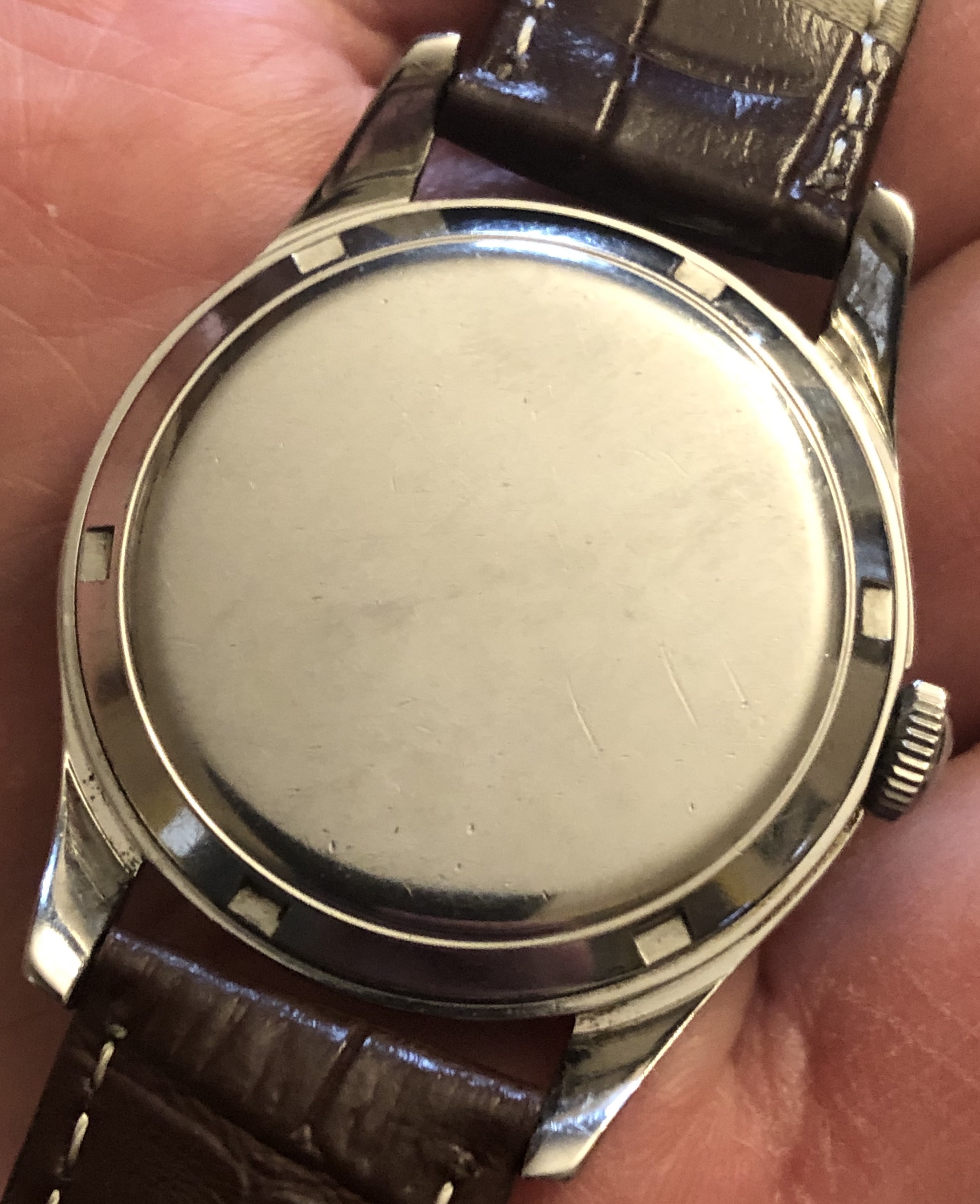 This ref 2640 (circa 1955) with cal 283 has a speckled dial that reminds me of the fauxtina that brands are sometimes putting on vintage re-issues. But it appears to be all original, including crown and signed crystal, with nice sharp case lines. The similar sub-second 2639 is much more frequently seen; both references are a perfect 36mm diameter.