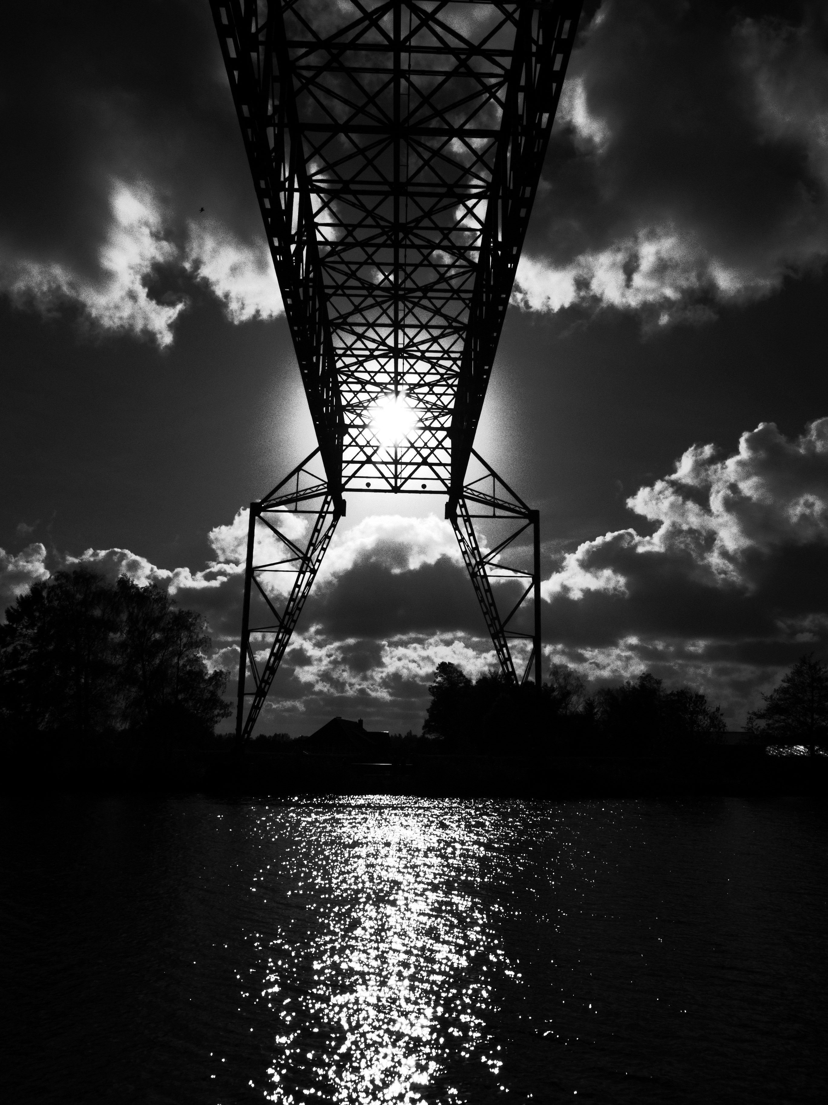 This is the "Schwebef盲hre Osten鈥揌emmoor" an electrically driven hanging ferry-bridge over the river Oste in north west Germany. It was built in 1909 and is over 20m high to allow windjammers to pass under. The sun was just starting to go down and I thought it would look far more interesting in black'n'white.