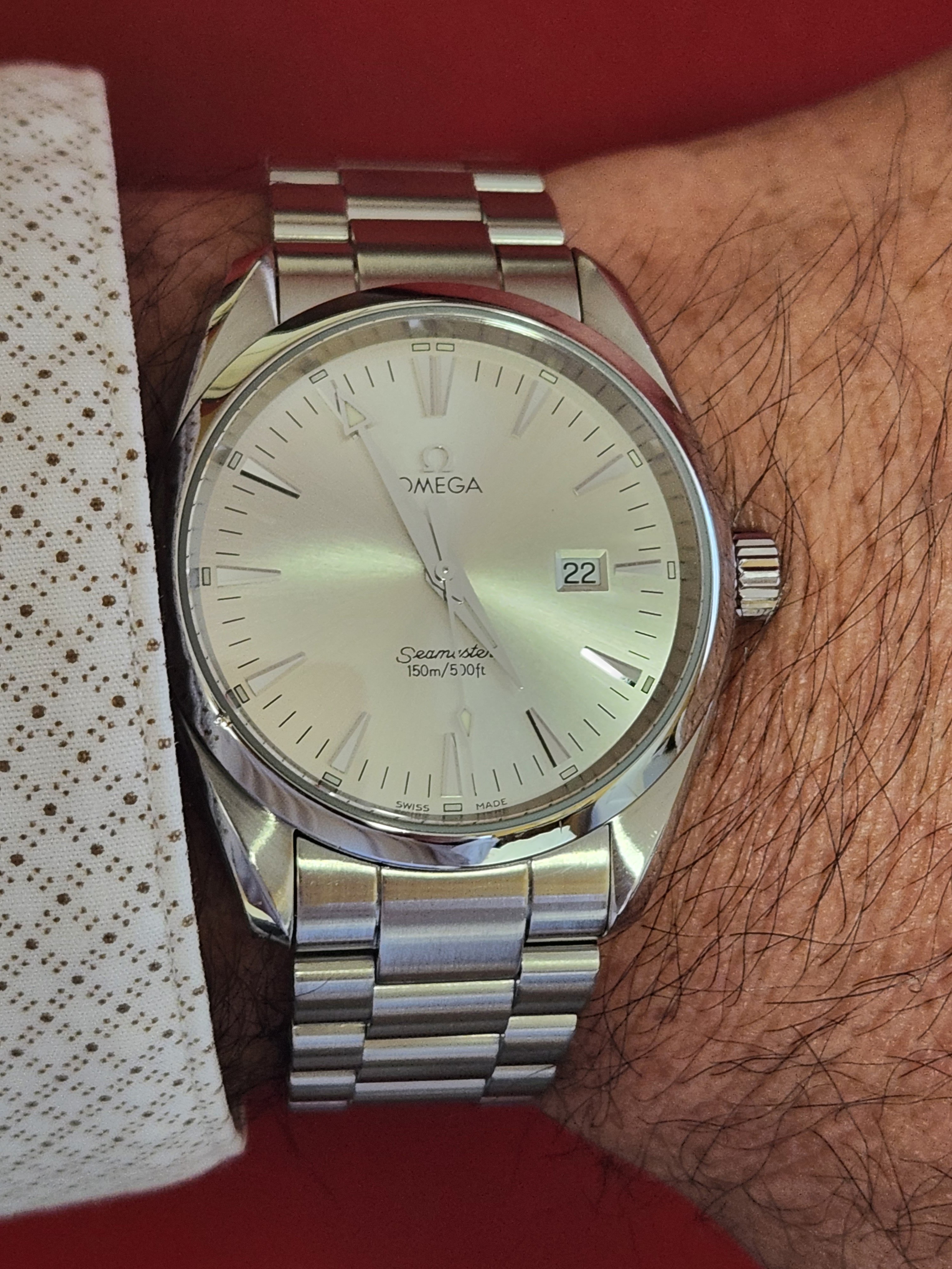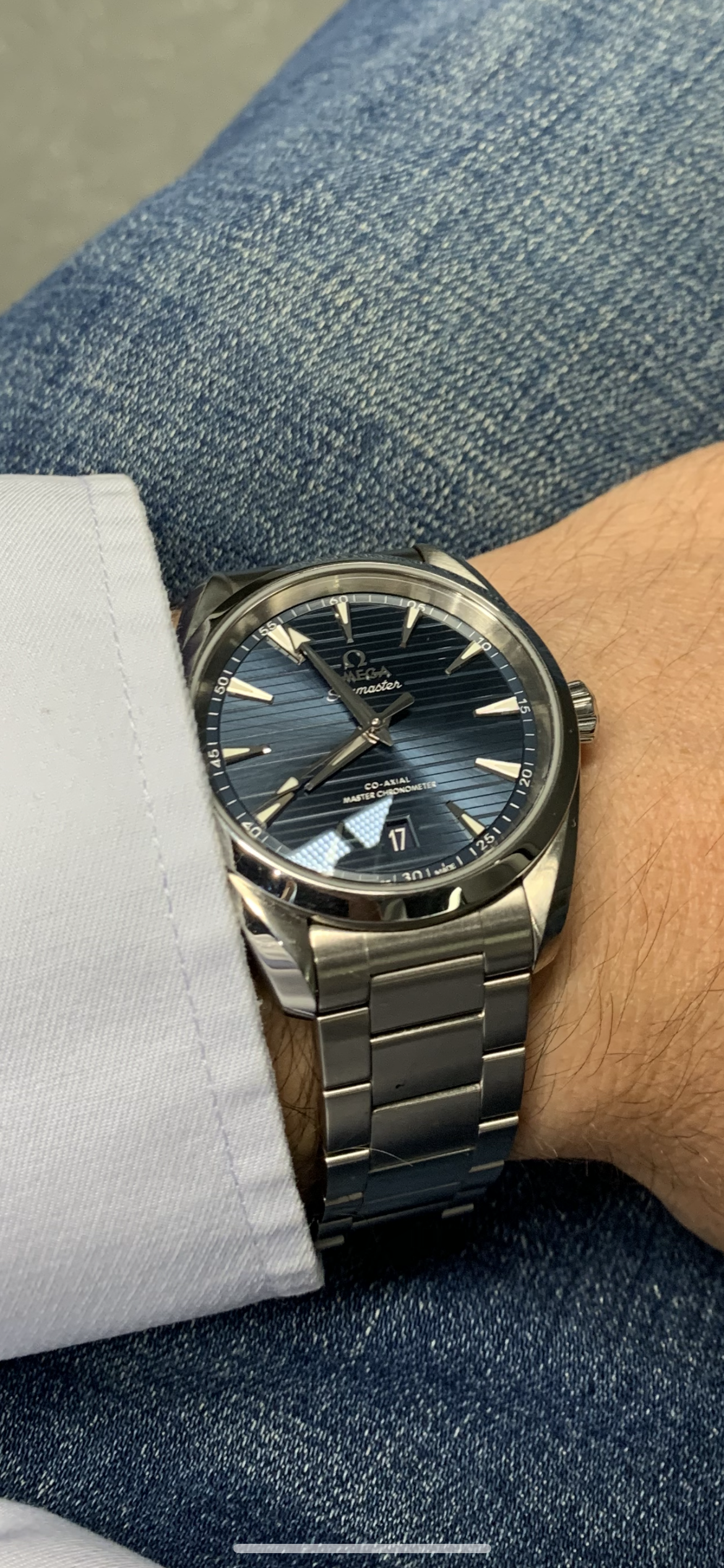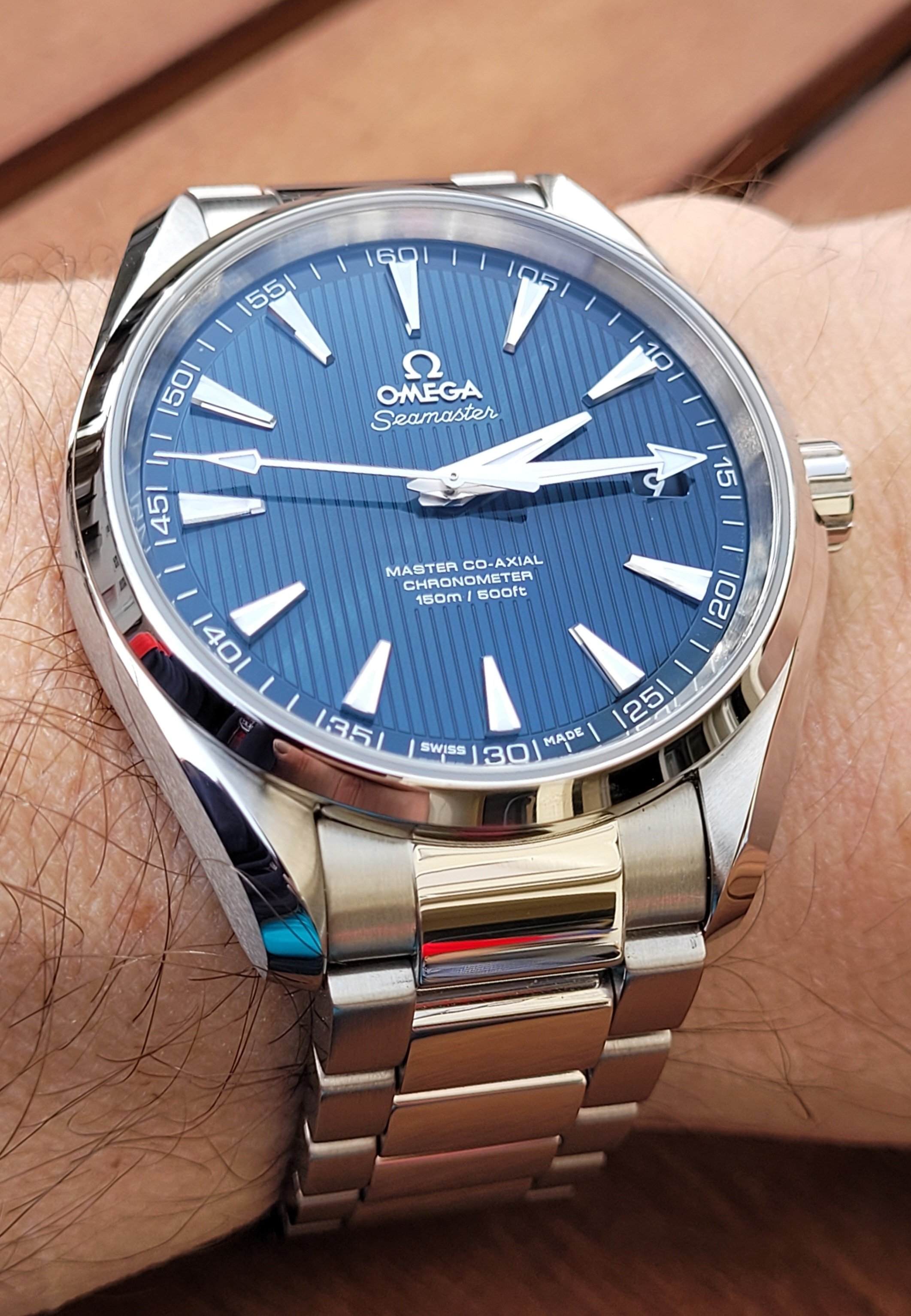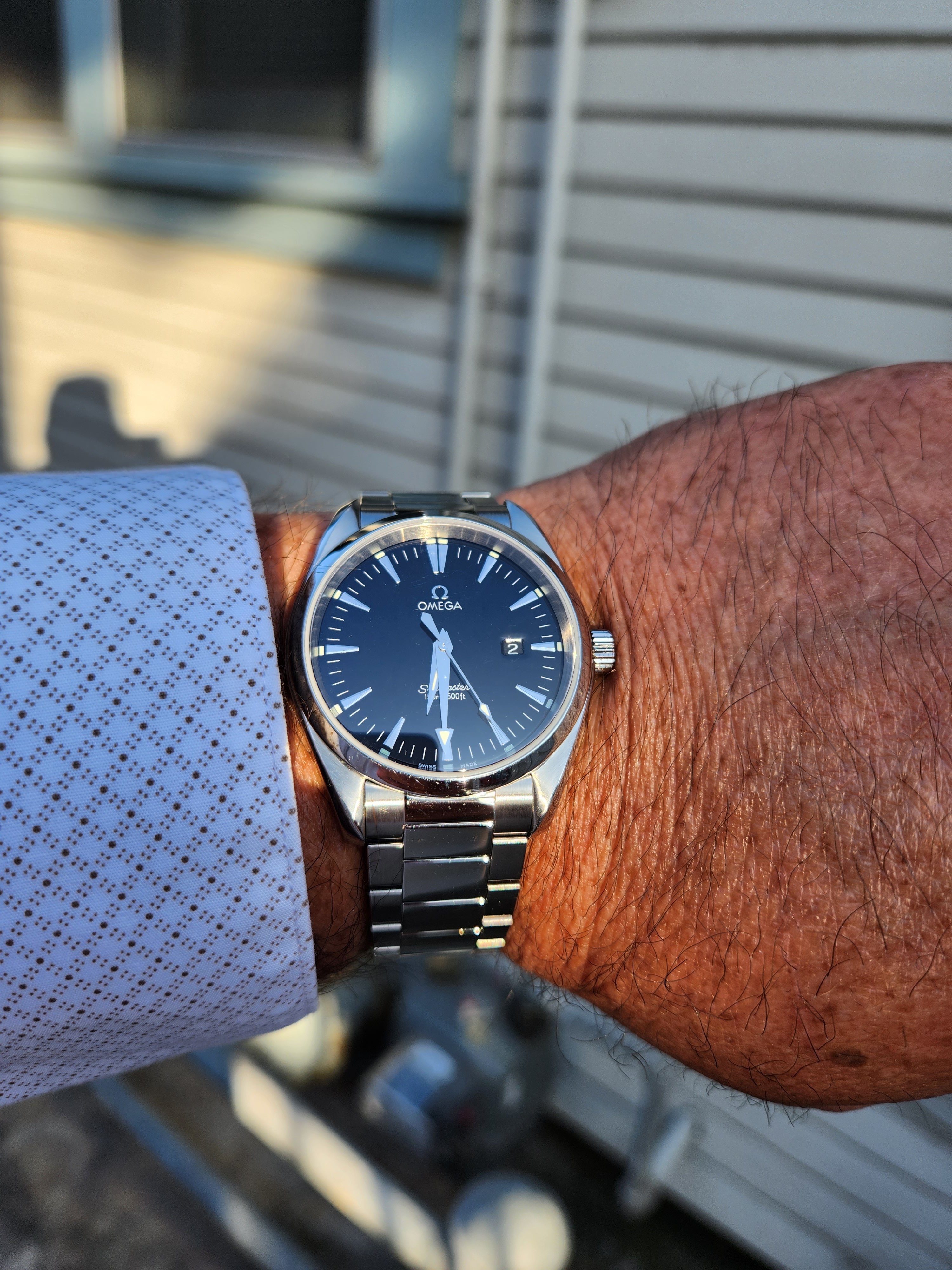 Greetings. You're right, those are the 1st generation in 42.2mm and the second generation in 41.5. The first one was a gift from my wife, and it was my first good watch. I recall there was an ad in a printed magazine and I couldn't stop staring at it! When my wife suggested a good watch should come from her as a gift on a special occasion there was no question it would be the Aqua Terra. When Omega updated the model with Caliber 8500 ten years later I began to squirm a bit about wanting to upgrade a watch that had been a gift from my wife. As another special occasion was approaching we happened to be in a nice jeweler's shop together, and this was around the time the blue dial was first introduced in the second generation watch. She loved it, I suggested the upgrade (as a gift from her again) would be a great way to mark the upcoming special occasion, and she agreed!