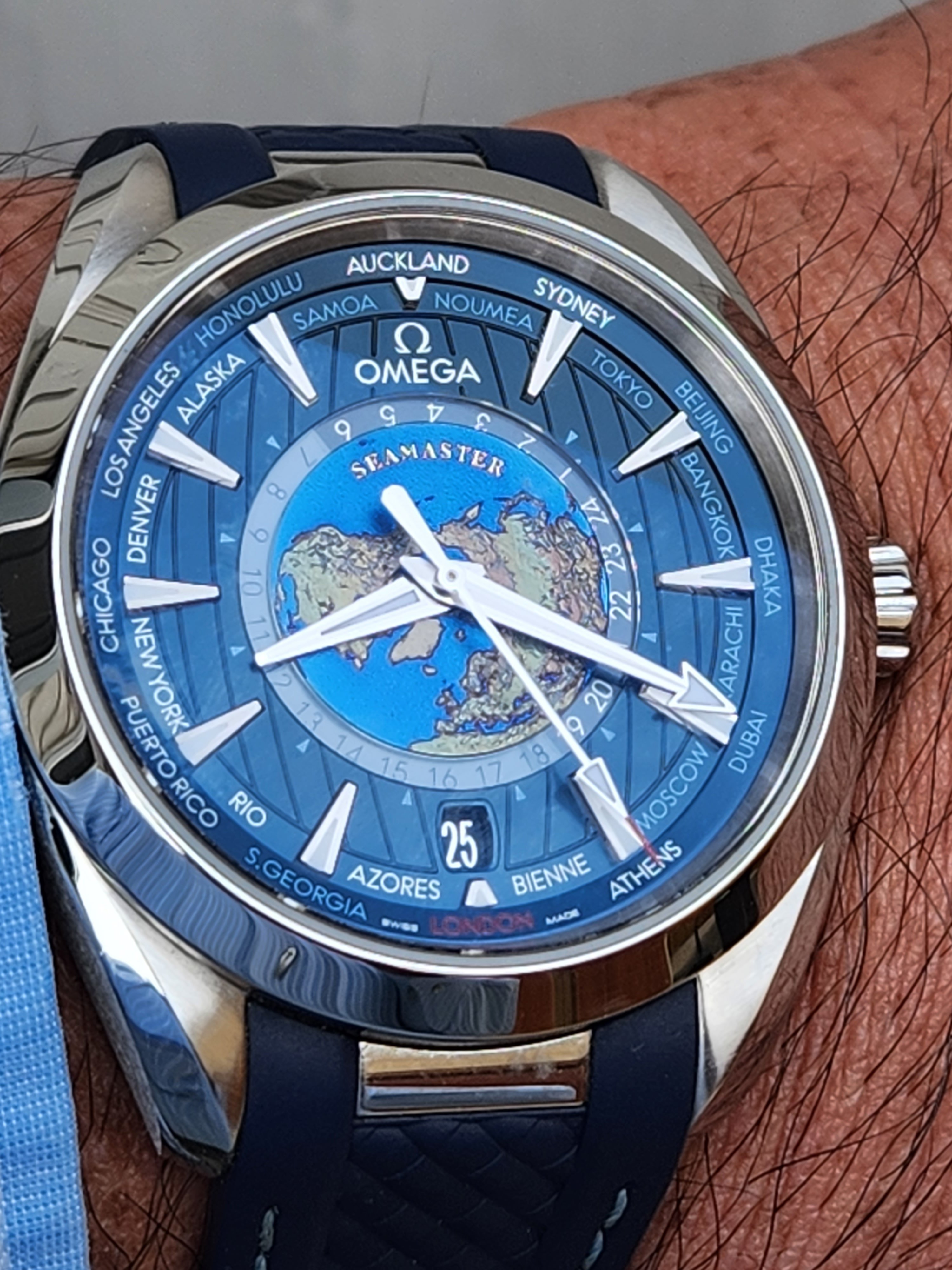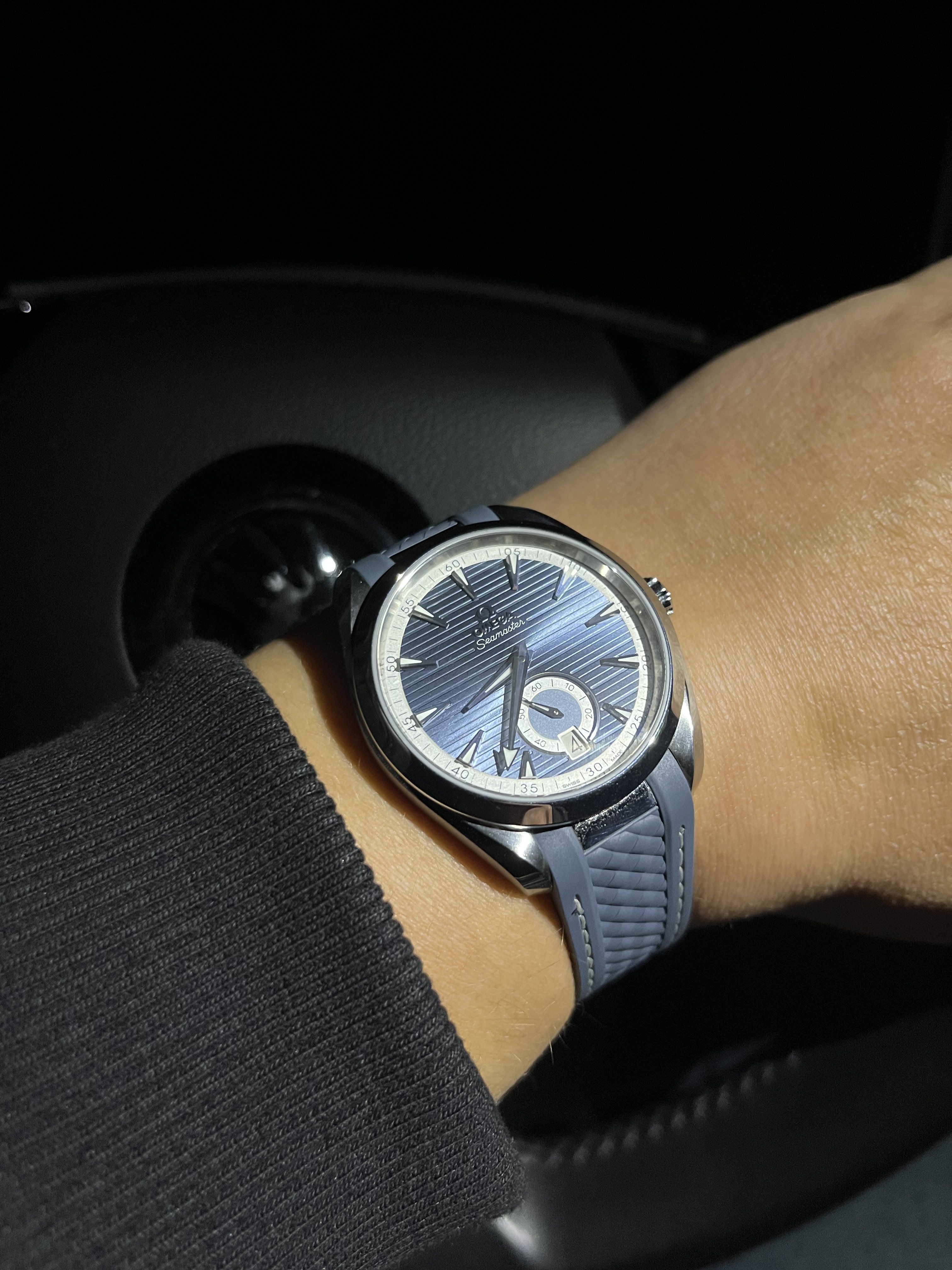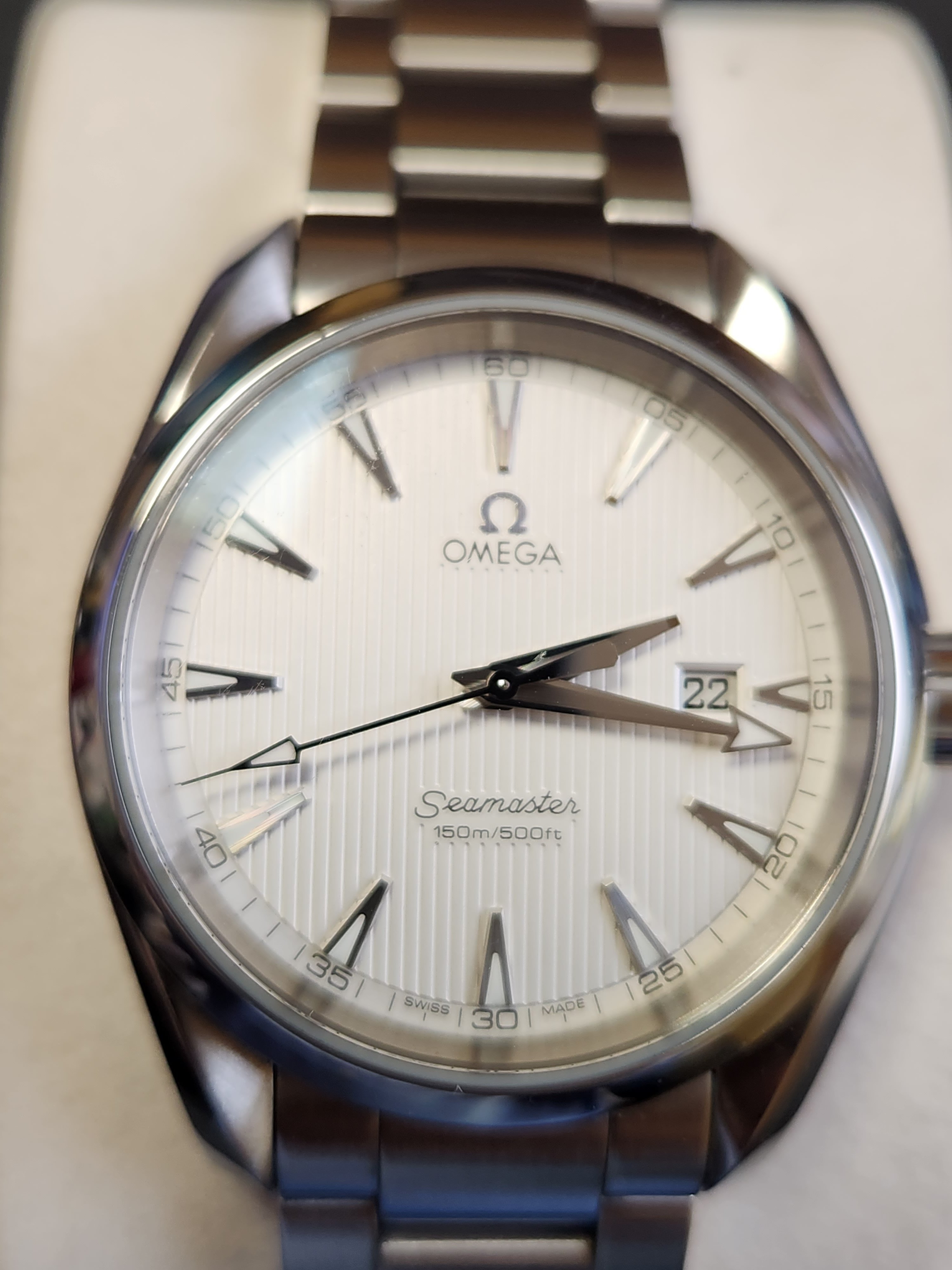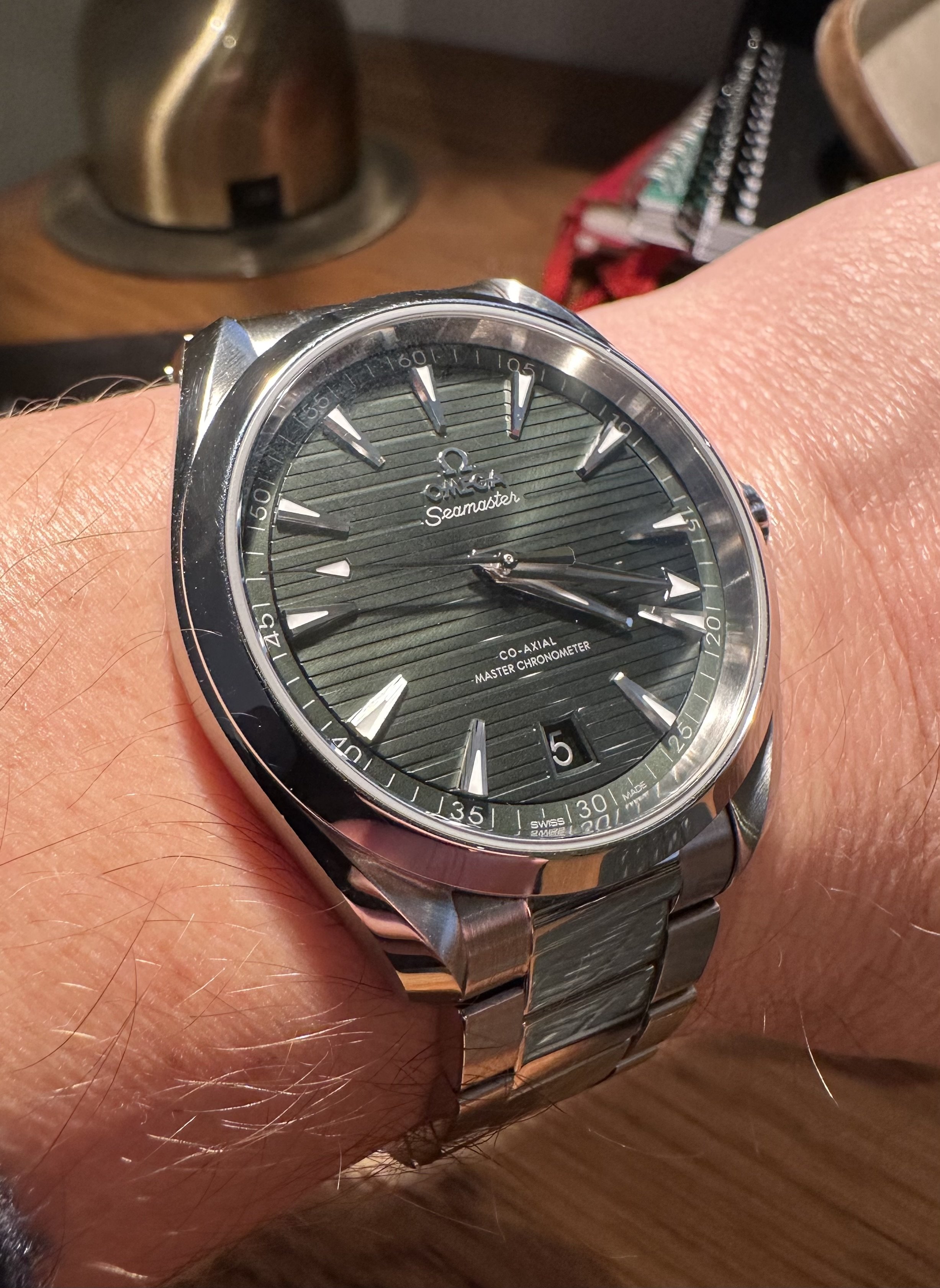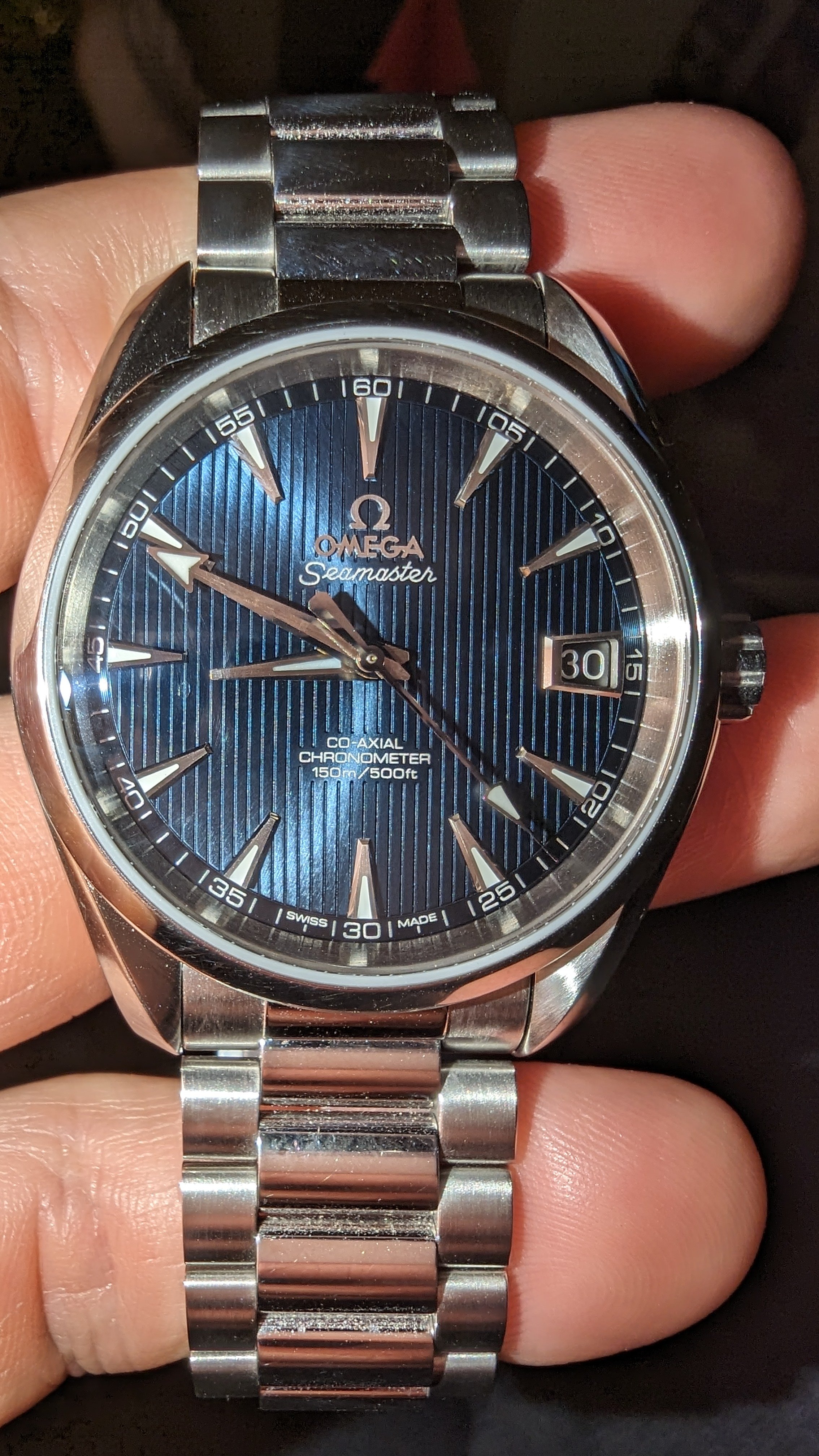 Greetings. You're right, those are the 1st generation in 42.2mm and the second generation in 41.5. The first one was a gift from my wife, and it was my first good watch. I recall there was an ad in a printed magazine and I couldn't stop staring at it! When my wife suggested a good watch should come from her as a gift on a special occasion there was no question it would be the Aqua Terra. When Omega updated the model with Caliber 8500 ten years later I began to squirm a bit about wanting to upgrade a watch that had been a gift from my wife. As another special occasion was approaching we happened to be in a nice jeweler's shop together, and this was around the time the blue dial was first introduced in the second generation watch. She loved it, I suggested the upgrade (as a gift from her again) would be a great way to mark the upcoming special occasion, and she agreed!