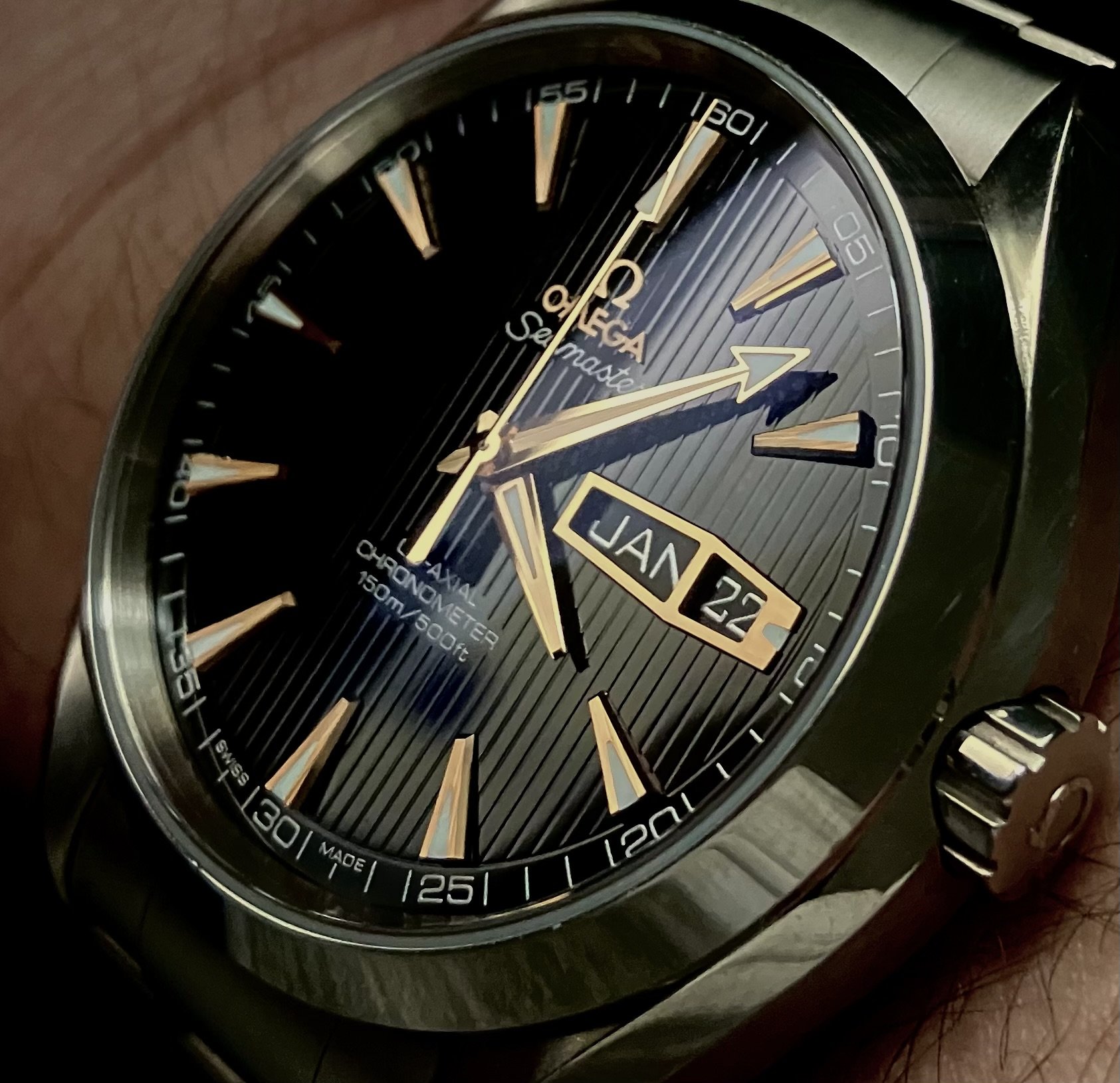 Pros for the first generation watch: white gold furniture under the crystal and slightly slimmer profile. Cons for that watch: legibility was okay, but there were times when the hands were invisible against the gorgeous but somewhat glossy black dial. Also, the Co-Axial components in Cal. 2500 are prone to go off in a way that affects timekeeping and requiring service from a qualified watchmaker.