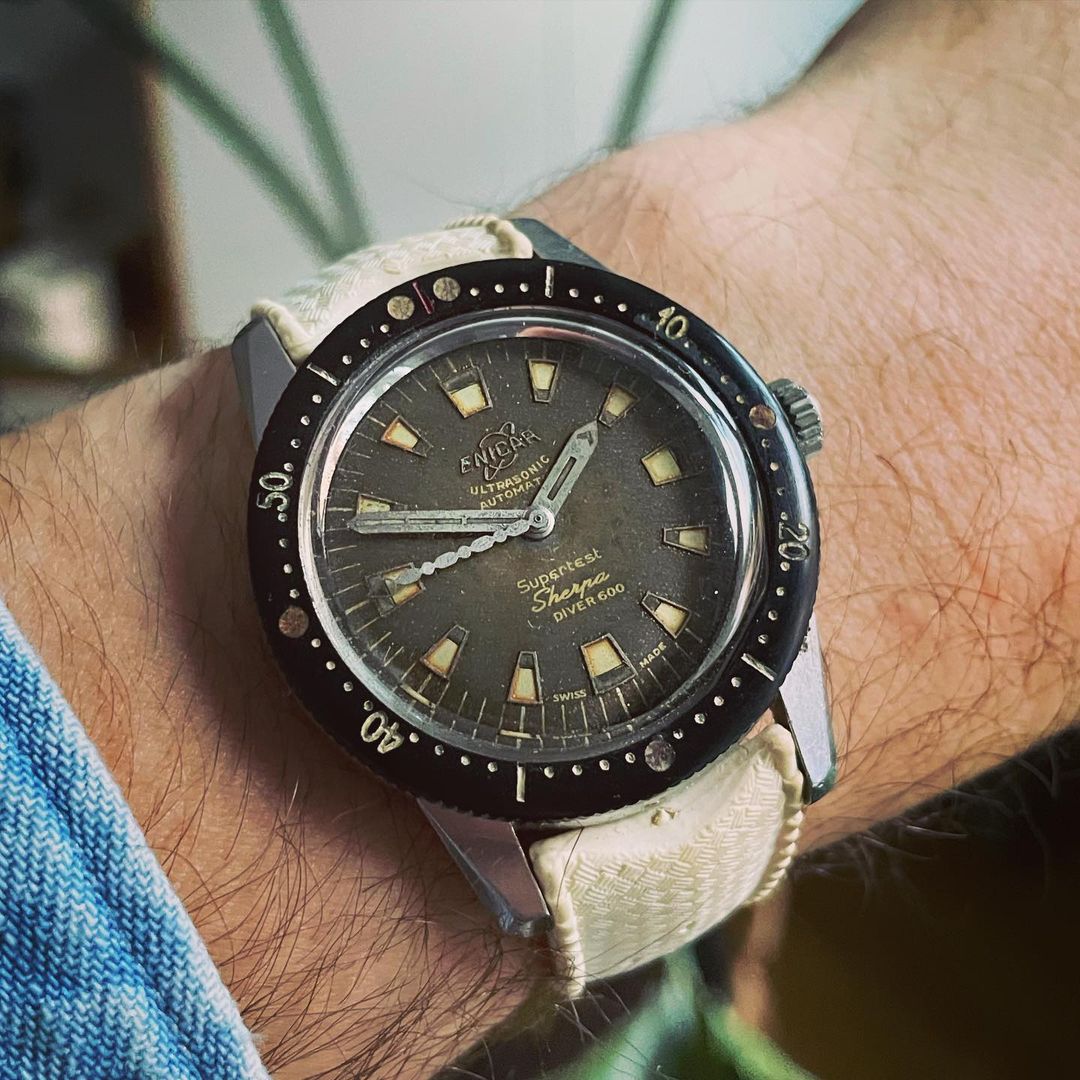 Second is a 40mm Sherpa Diver 600 with bakelite bezel. I like the wabi sabi look a lot. True Toolwatch 😁