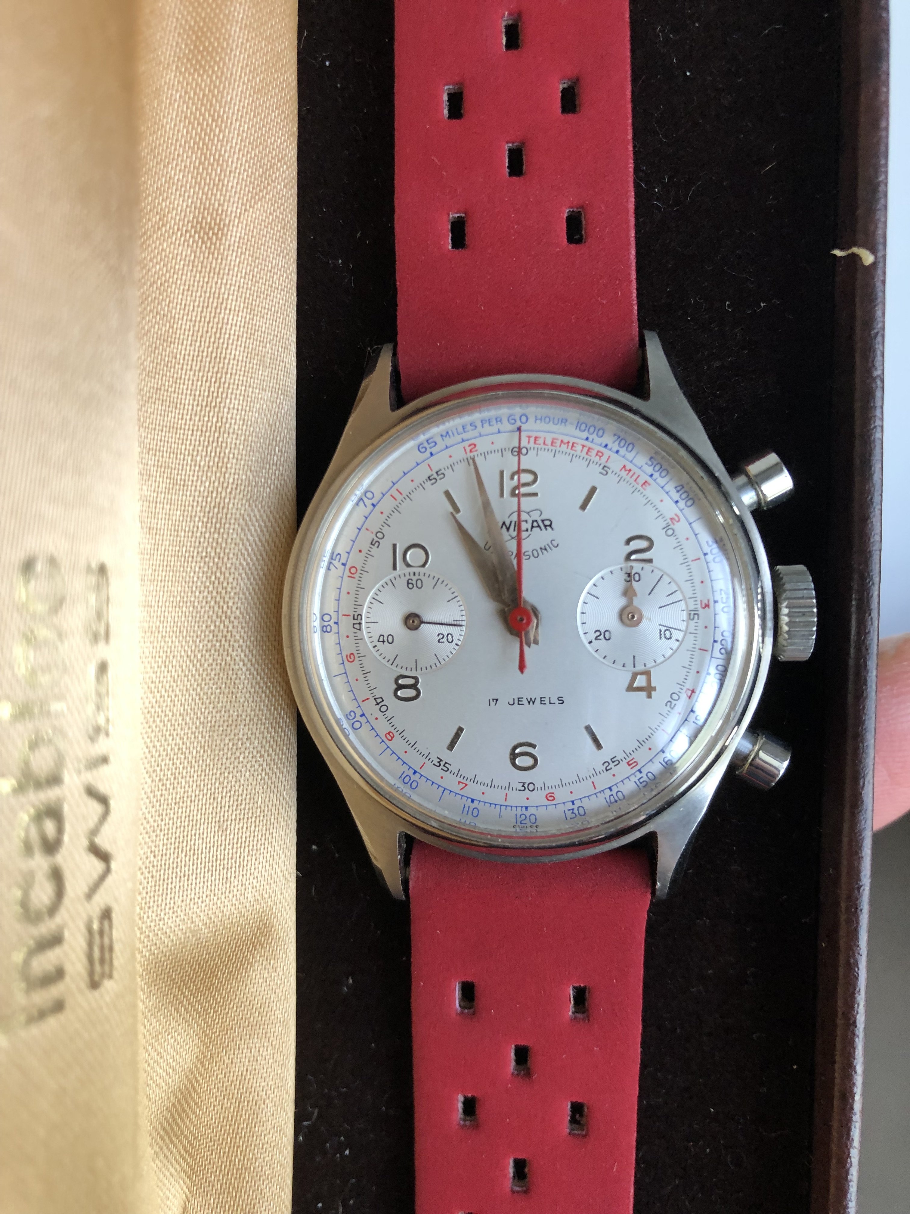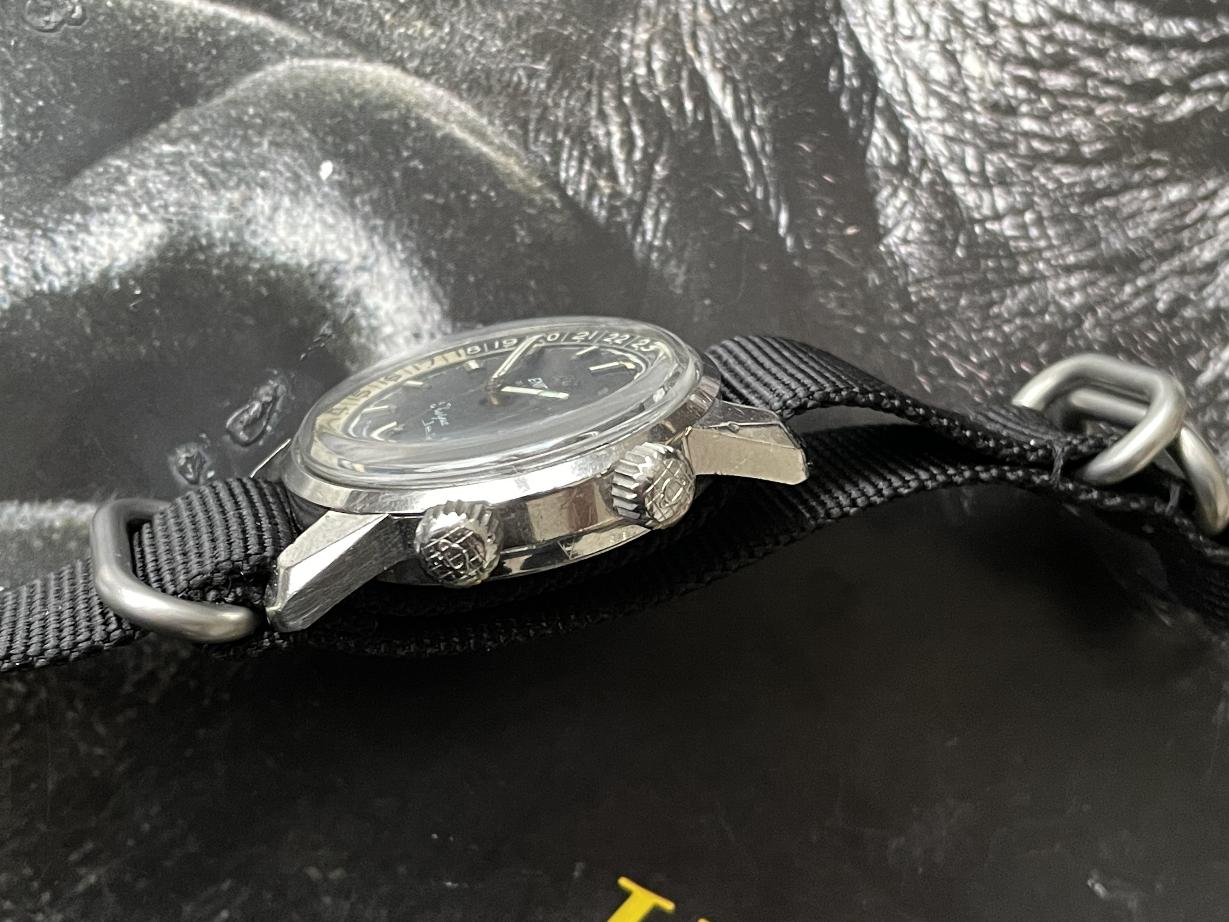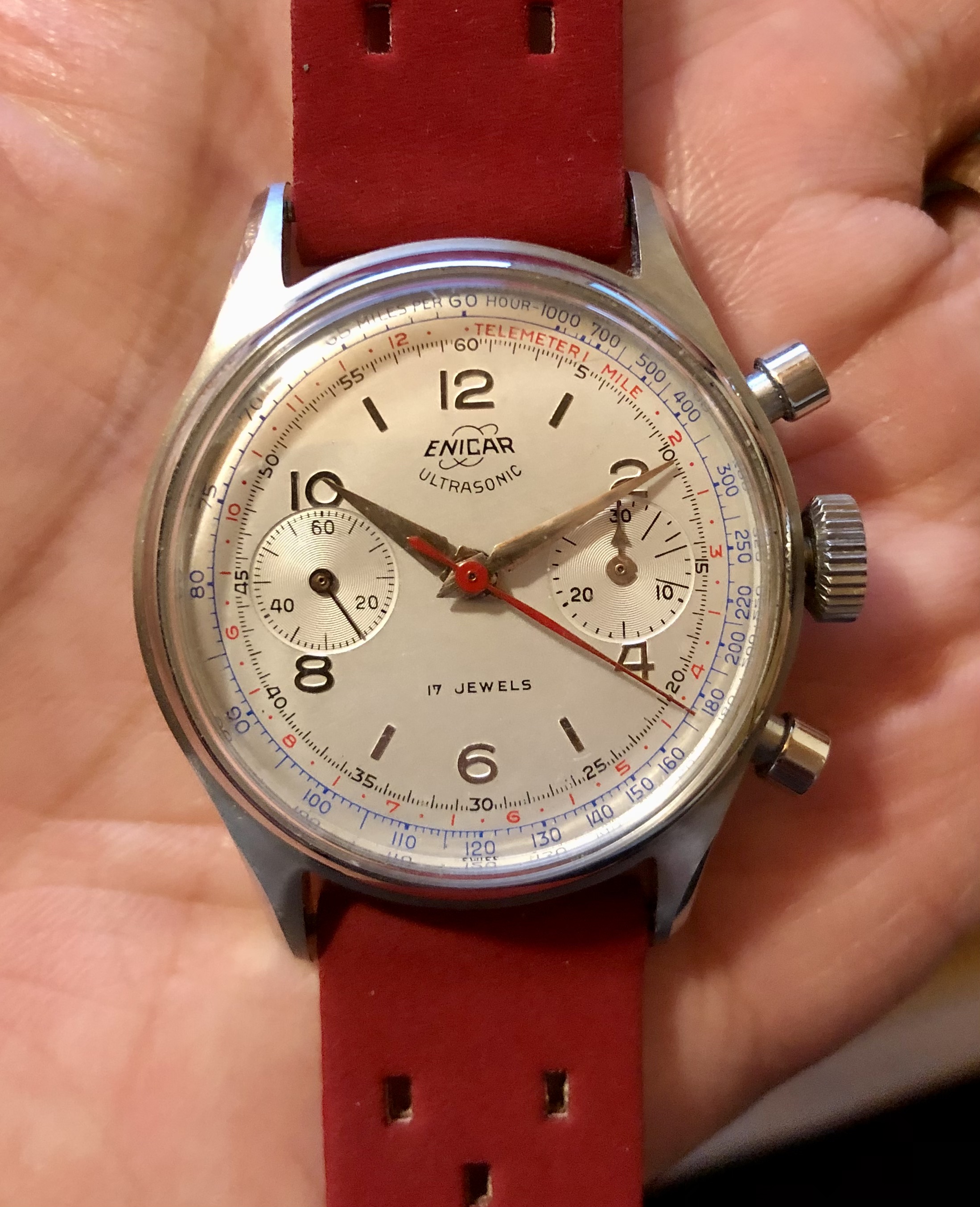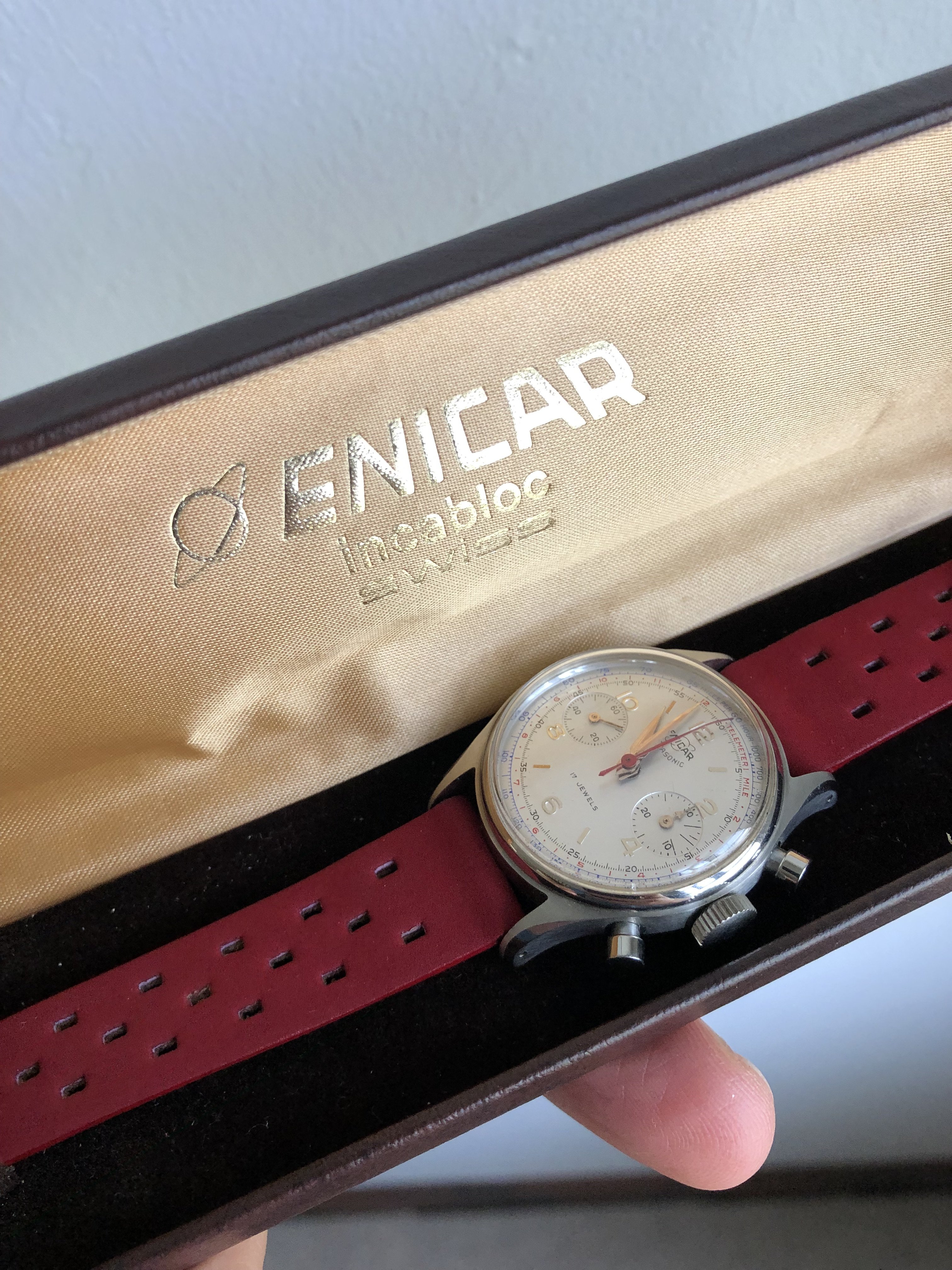 My pick-up at a local watch fair on Sunday. Enicar Ultrasonic chronograph with Valjoux 92 incl. box, original strap and buckle.