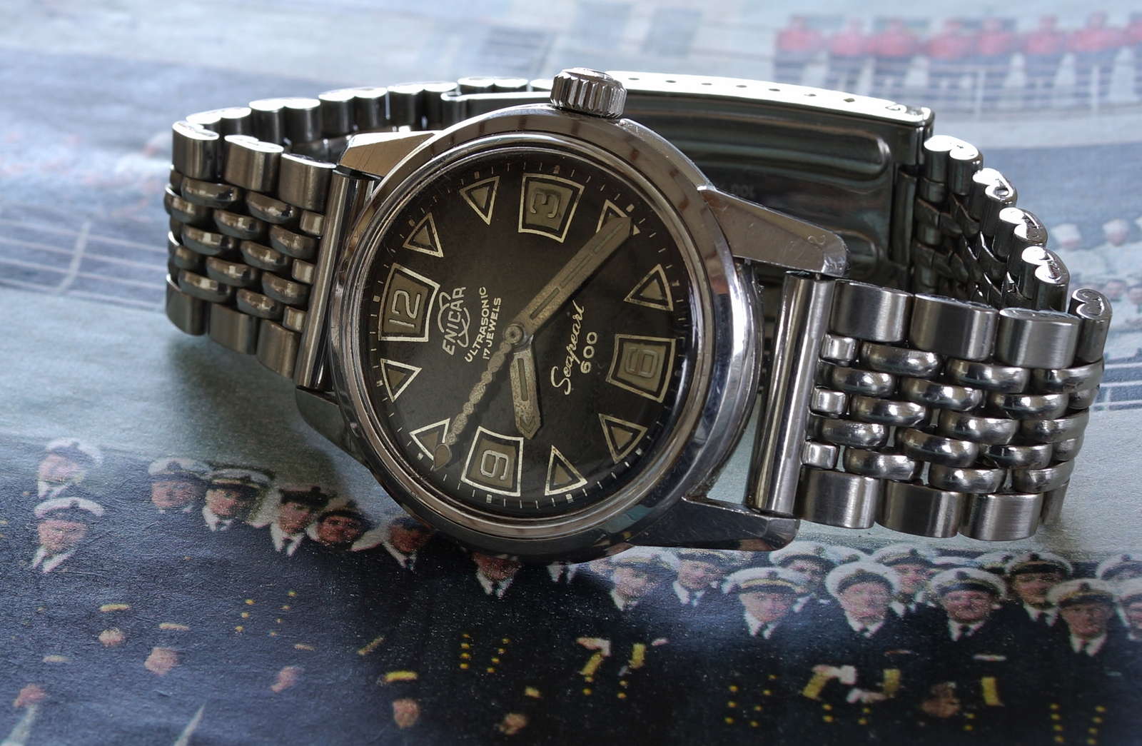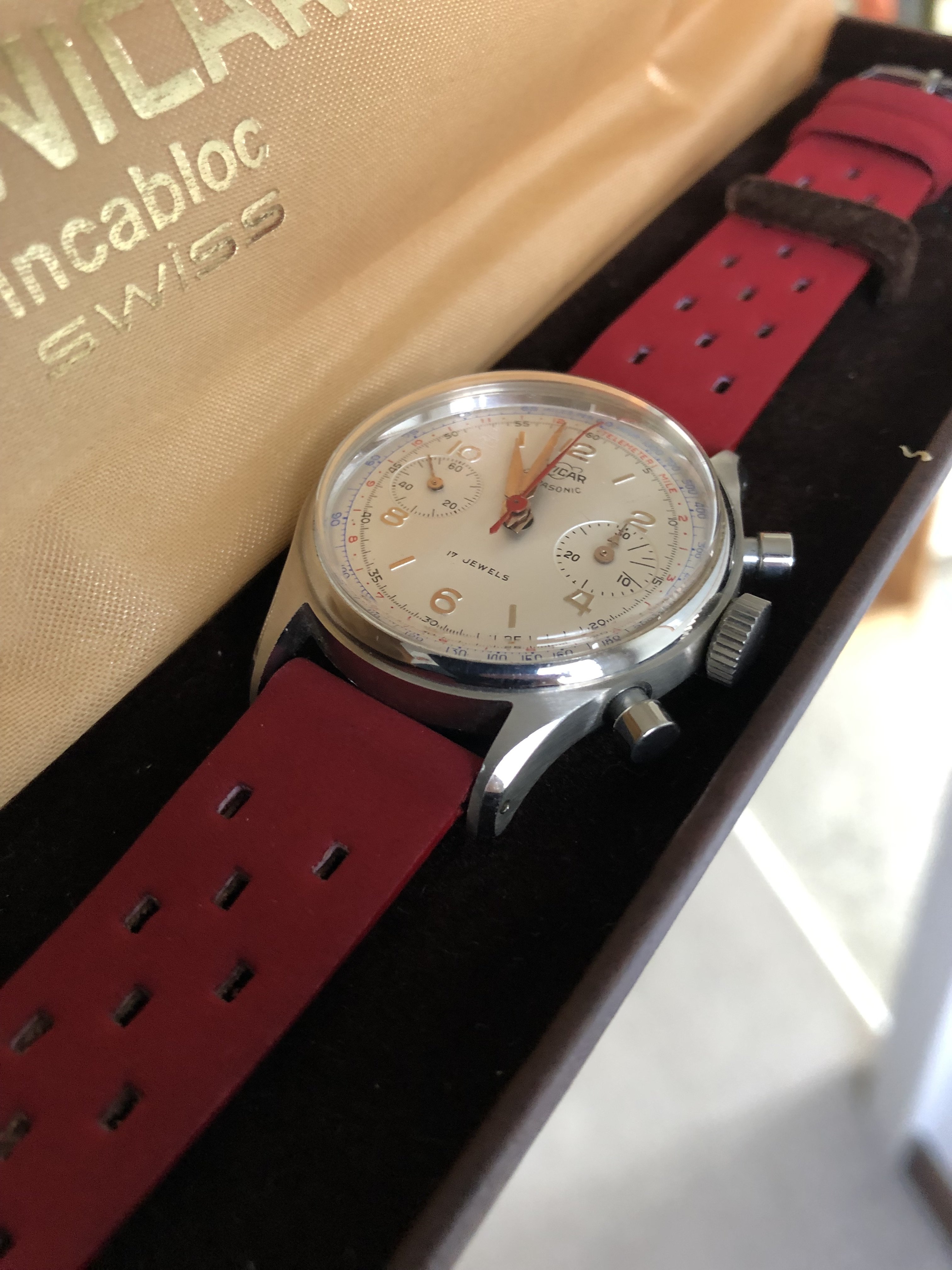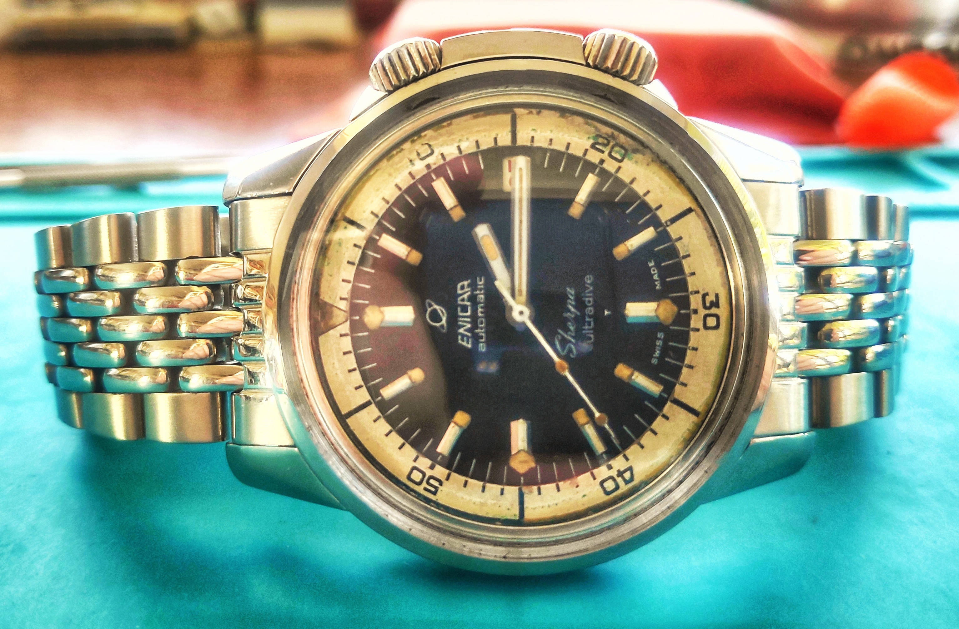 My pick-up at a local watch fair on Sunday. Enicar Ultrasonic chronograph with Valjoux 92 incl. box, original strap and buckle.