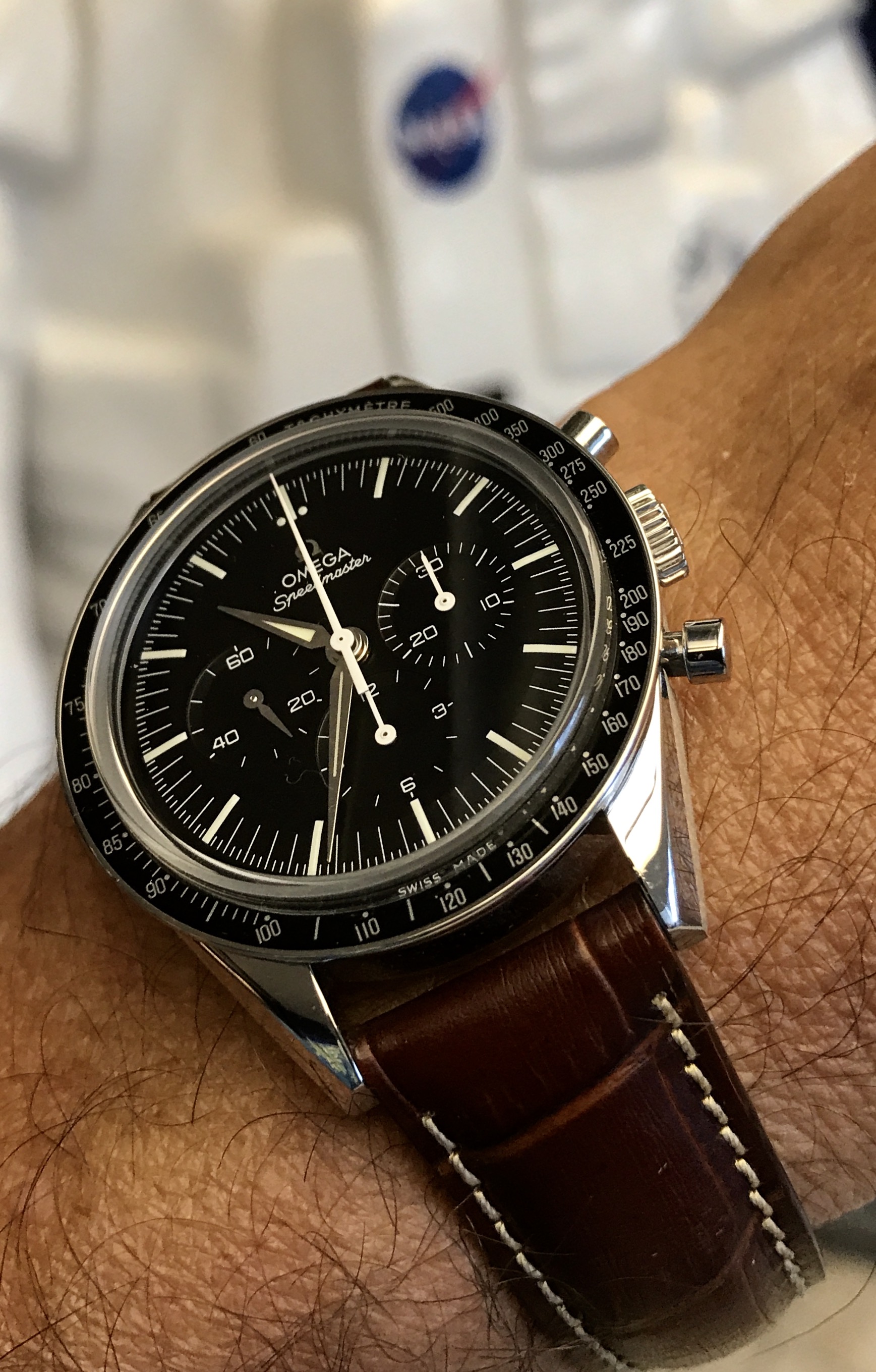 My new favorite [which displaces the (Wile E.) coyote brown Rothco Commando pictured previously] non-Omega strap for my modern Speedmaster Pro Moonwatch is a generic [no brand markings] sage green velcro/nylon strap that was given to me by @ChuckMK23 a while back. I really dig it because it’s extremely comfortable during hot/humid weather and it [sort of] goes with my mil spec CWU-36/P NOMEX flight jacket...