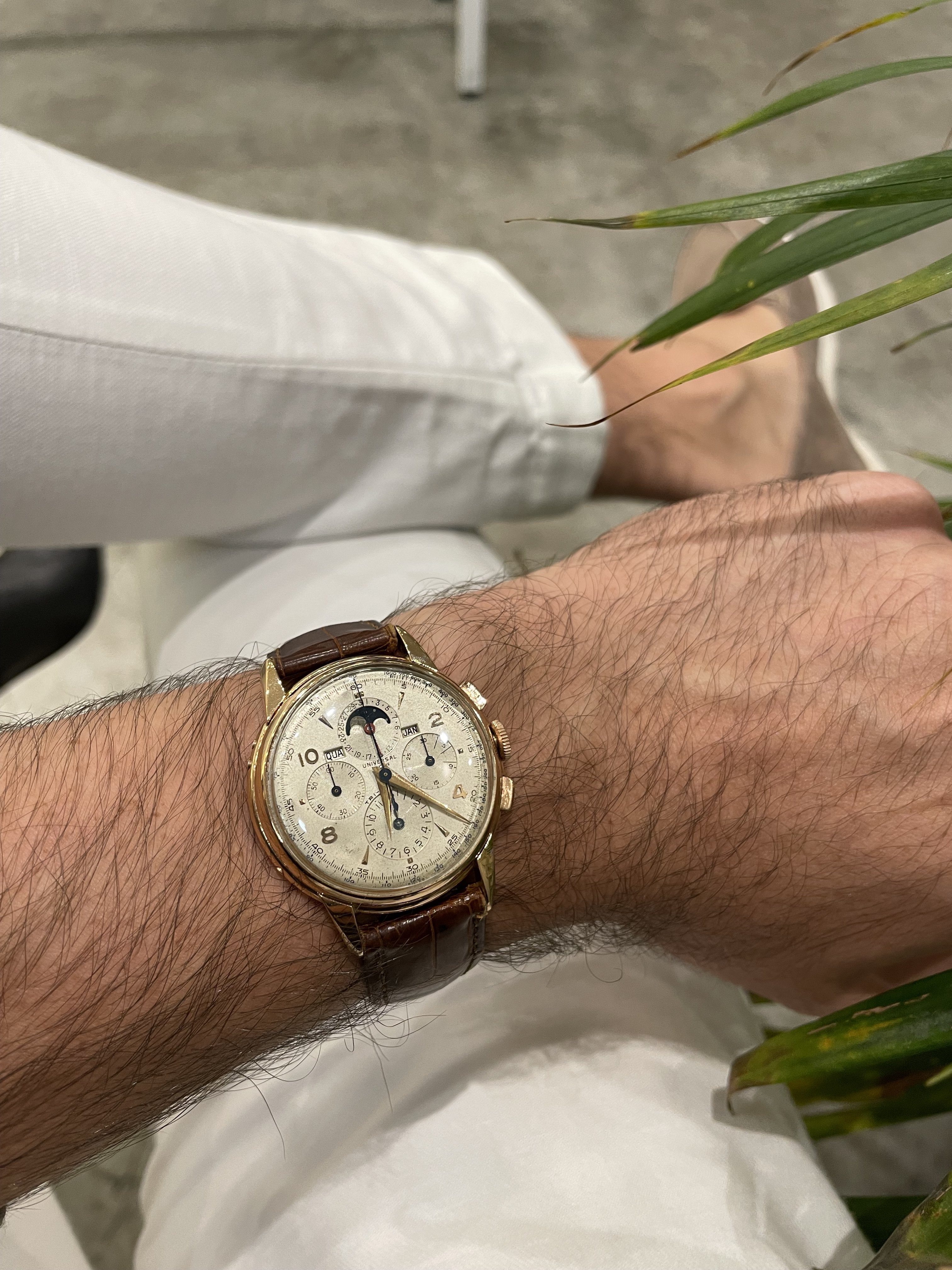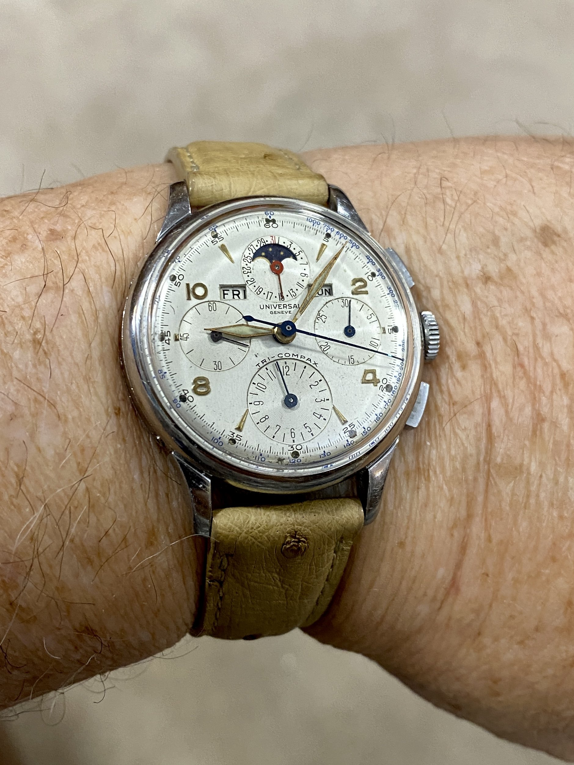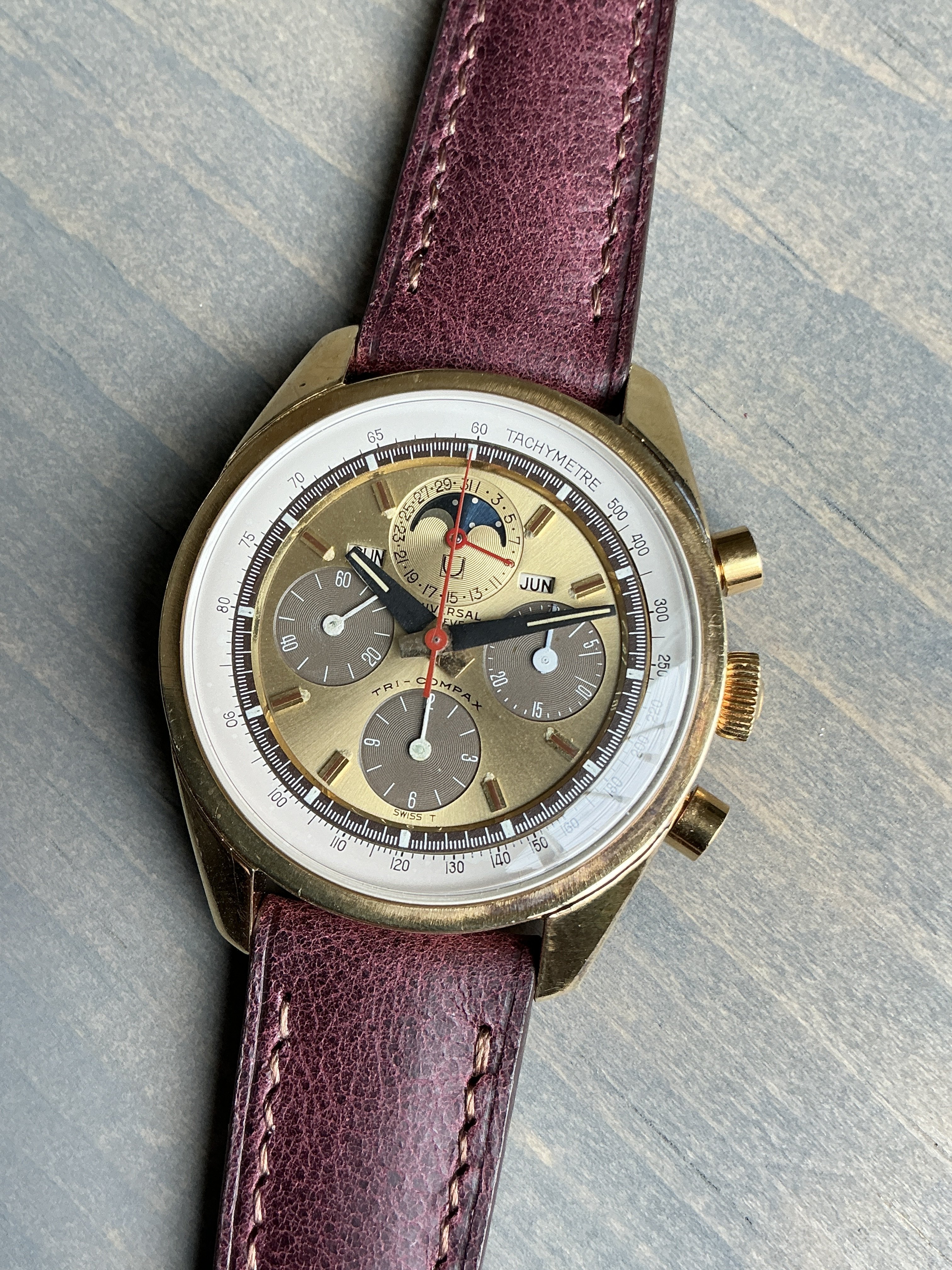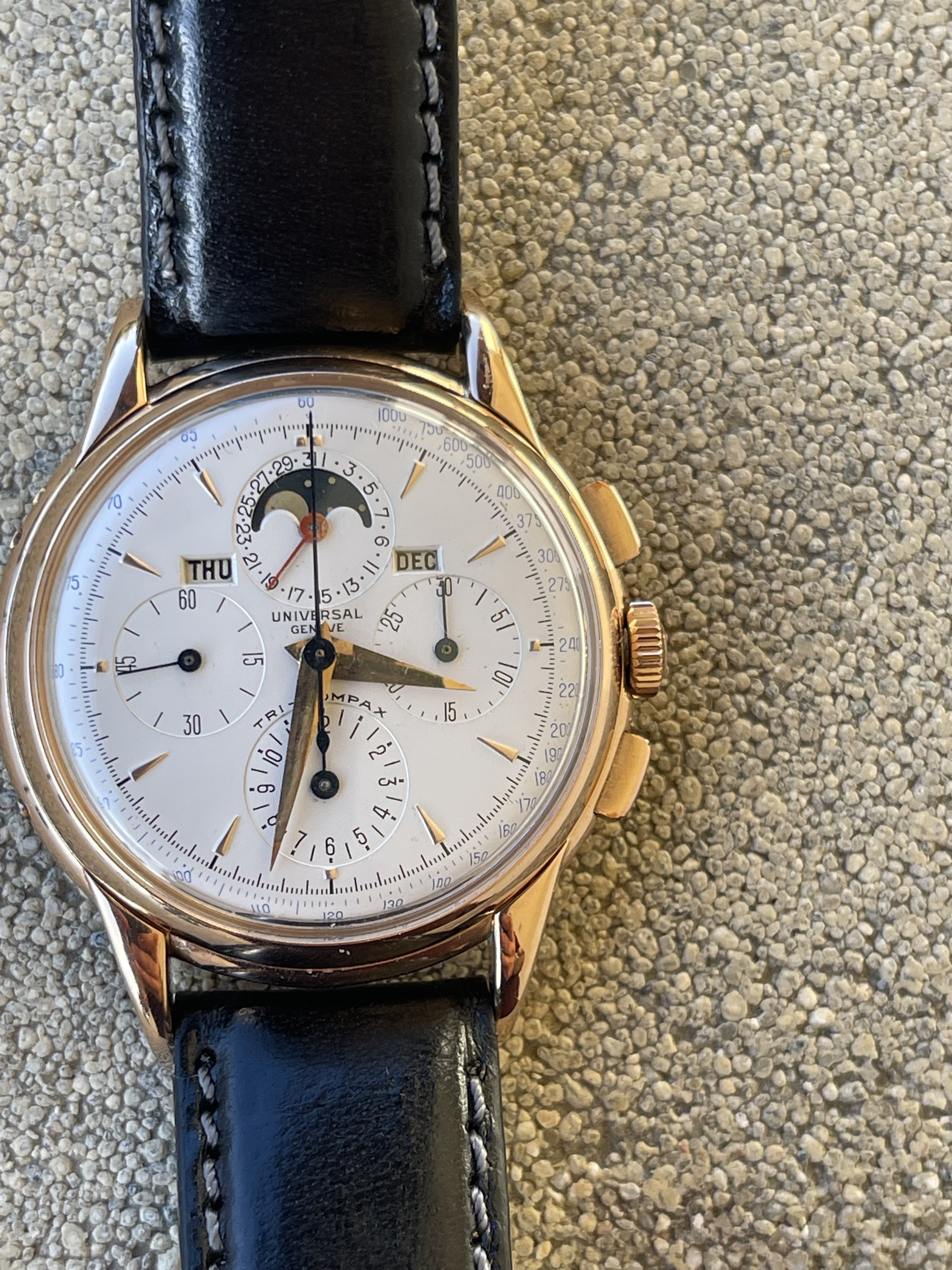 So this just happened, and after last month’s post/acquisition, I swear it came out of complete left field when I got a totally unexpected message on Instagram inquiring about my potential interest in this grey slate dial “Exotic” Tri-Compax (reference 881101/03 ). “Um, YES PLEASE!!” I don’t think I’ve ever said this about any piece in my collection before - but its condition is as close to mint as any example I’ve ever seen of this reference. In fact, it’s heading straight to the spa for some TLC, since the seller/watchmaker in Idaho (!!) who reached out to me said he suspects it has never been serviced…and perhaps never even OPENED…in 50+ years. No toolmarks are evident on the pristine movement. Reference and serial numbers are clearly etched into the case back. The crystal is signed. The crown is correct, the dial and bezel are impeccable, and the case sparkles. And in the coming weeks, yes, it will be mounted onto a UG-signed Gay Freres bracelet. My new best friend in Idaho apparently was helping the nephew of its original owner who recently inherited it and wanted to monetize what he knew was a special piece. I couldn’t be more appreciative and excited that he thought of me, and found me worthy of being its next caretaker. Viva UG! 😀