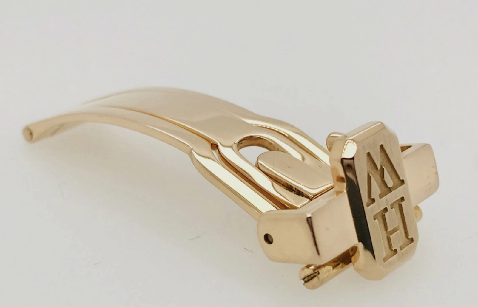 Took a bit of work to find a clasp as there were no solid gold generics that I could find. I got lucky with this NOS HW clasp that was for sale essentially for its weight in gold. The jeweler then fitted a gold plate over the HW initials and laser engraved the logo on the brushed plate.
