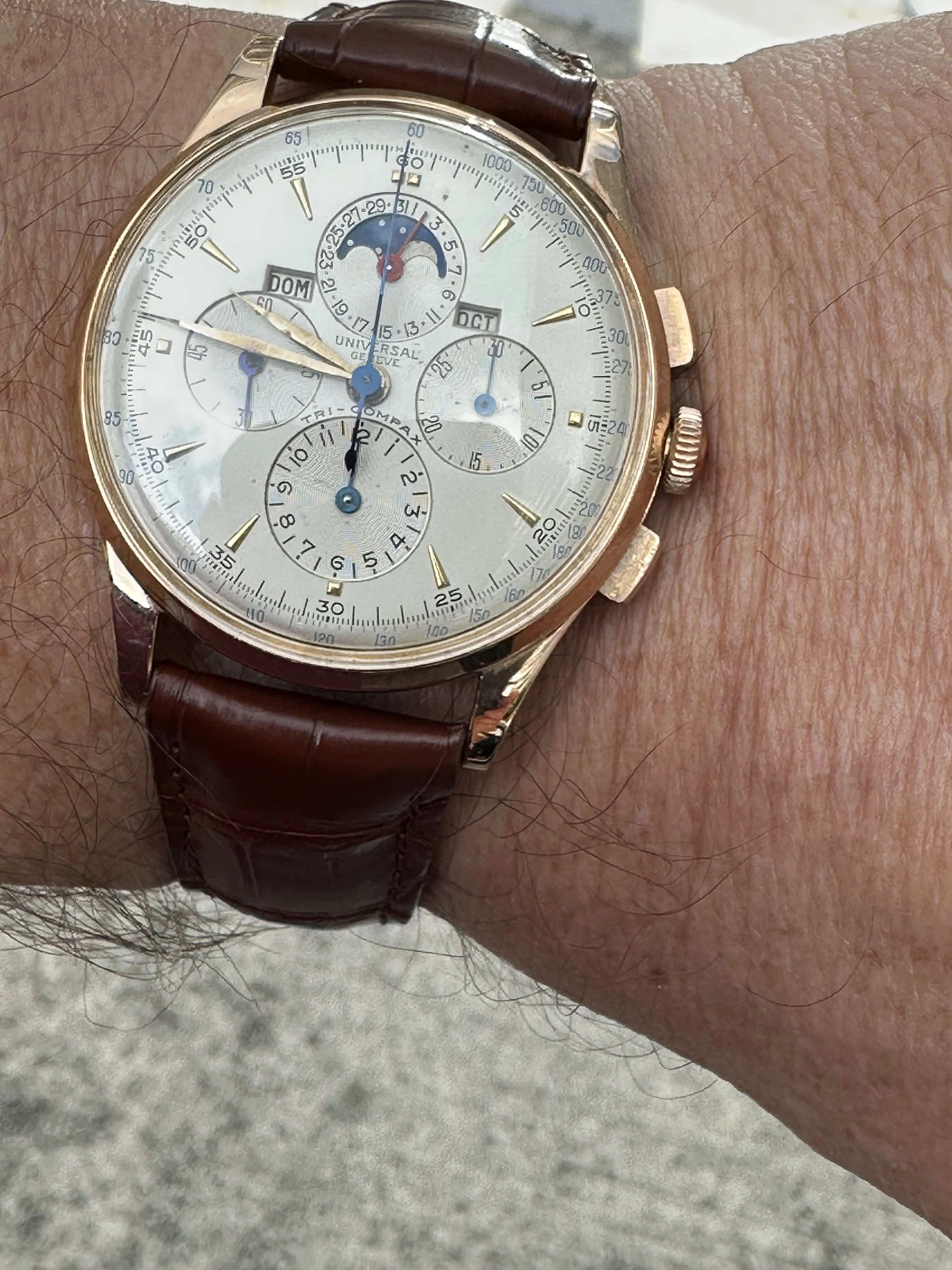 My Tri-Compax was manufactured in the early 50s, perhaps 2-3 years before this logo was registered, regardless I think "it works well" on the watch. I am a fan of deployment buckles as they seem much safer and easier to use. After some research I learned they were invented by Louis Cartier in 1910, so I felt less bad then putting one on the 1950s UG.