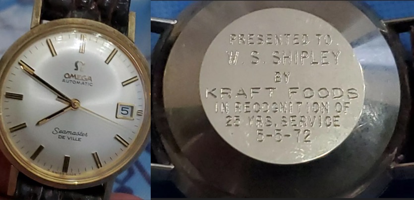 It is listed as a Vintage Seamaster Deville with Omega aluminum box and omega crocodile strap. The seller says that it is an estate sale find. She says it runs, has little to no scratches, and does not appear to have been worn much/at all. She said the strap was stiff. It has a deep engraving in the case back - “PRESENTED TO W.S. SHIPLEY BY KRAFT FOODS IN RECOGNITION OF 25 YRS. SERVICE 5-5-72.” Notably, the seller had a lunchbox listed that was engraved with the same last name. She is not selling other watches currently, just a few other books, board games, and awards from the same estate sale.