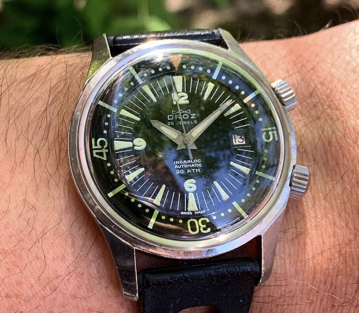 路Pretty excited about this one. I've been on the hunt for what I consider a proper skin diver. Which is something from the early 60's with huge indices, big hands, and a very utilitarian dial layout. This even has a screw down crown.