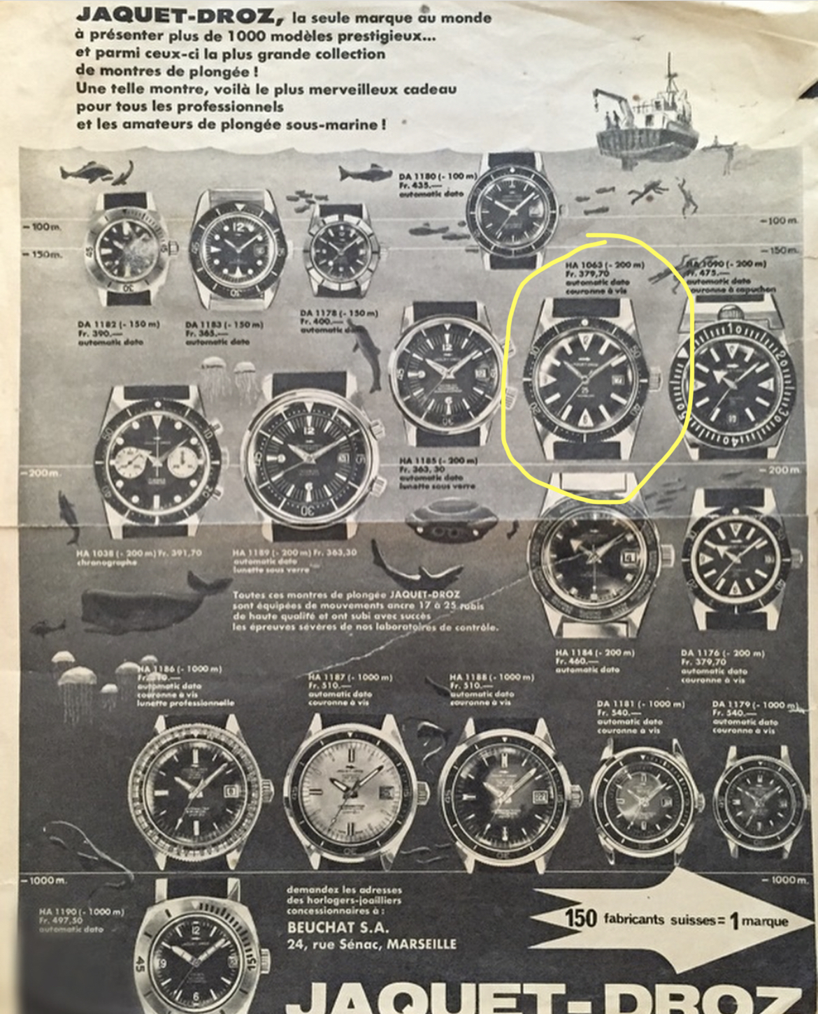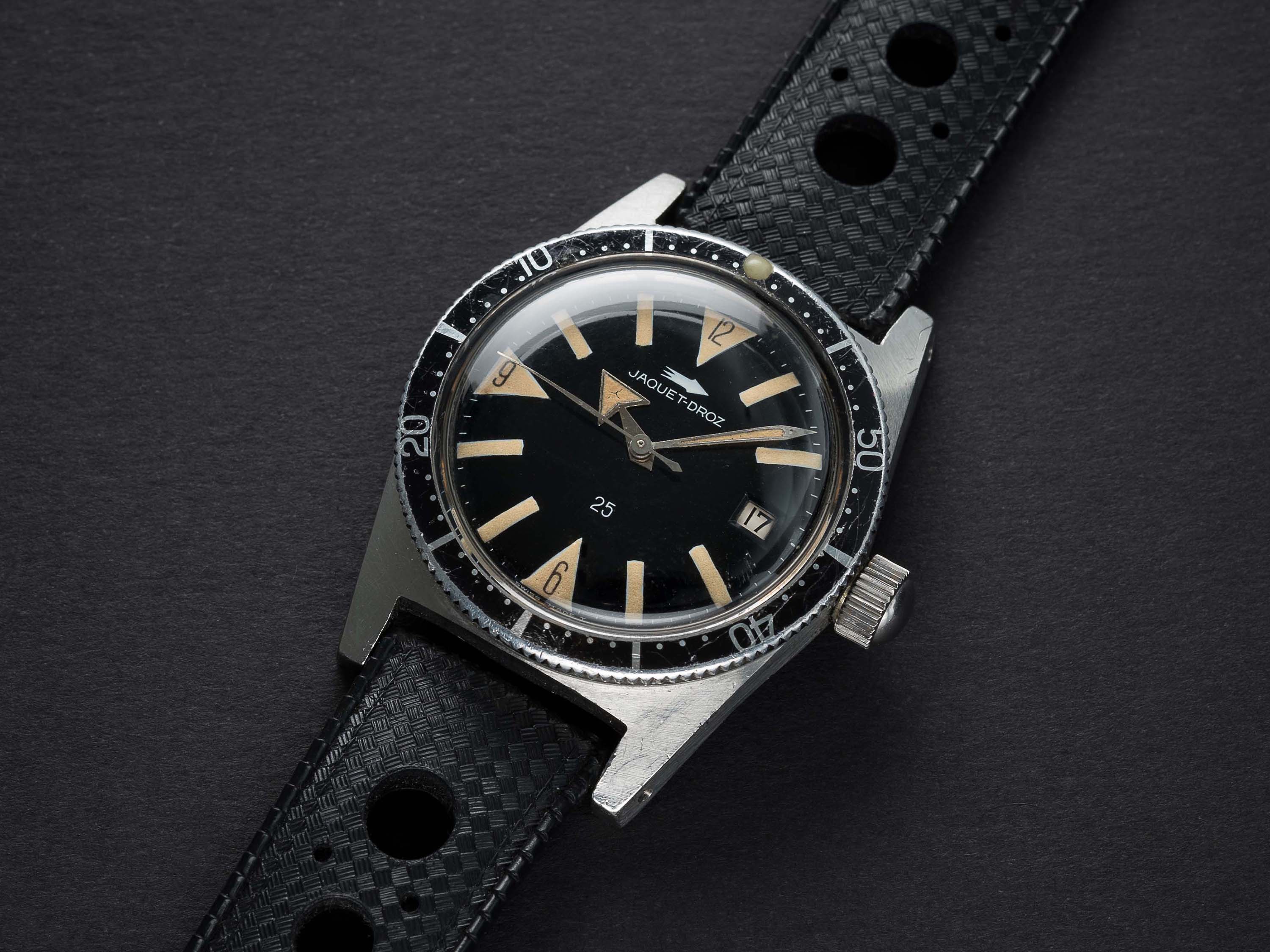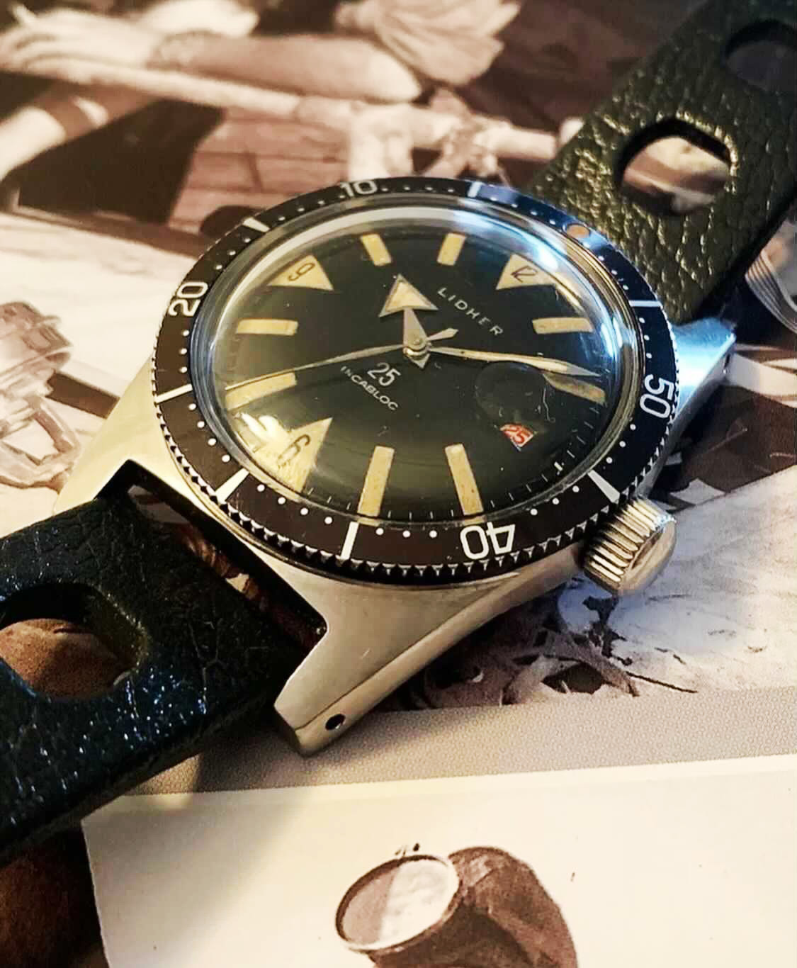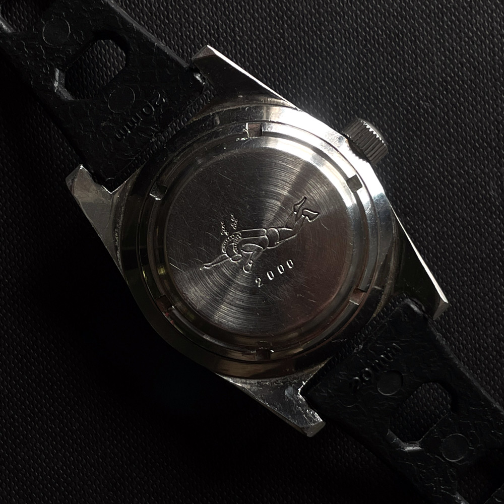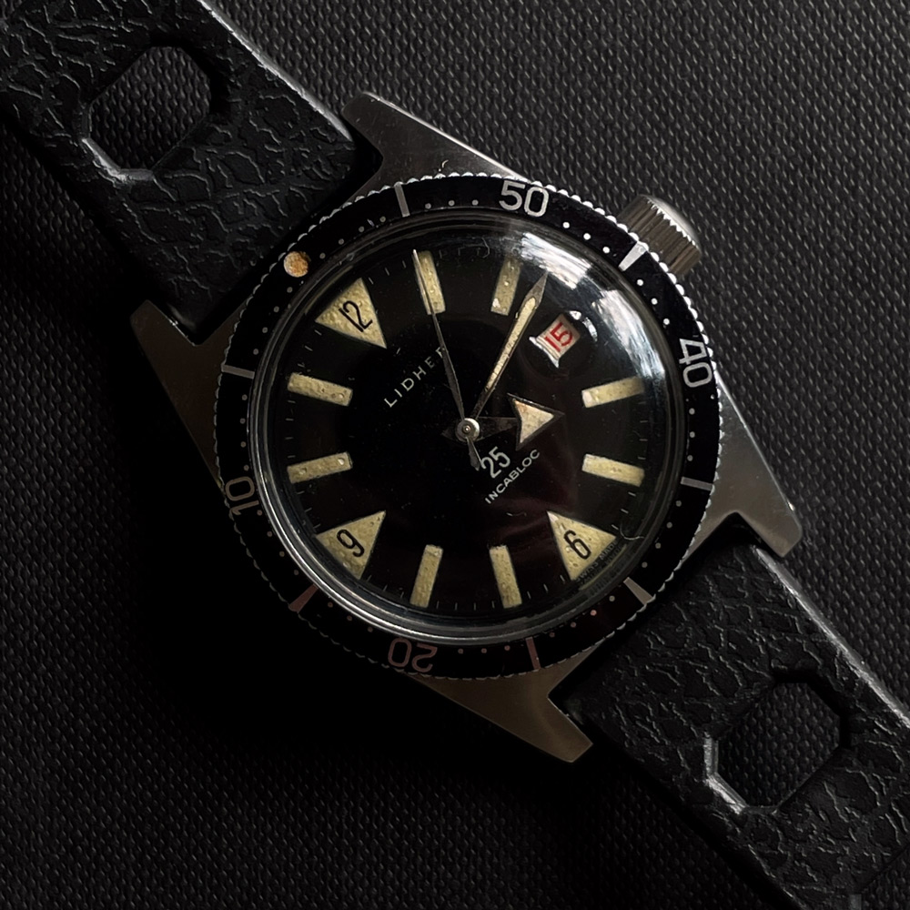 It's the same case and dial from the Jaquet-Droz diver of the same ilk, but was produced for Swiss brand, LIDHER. Inside is a Felsa 692 (25-jewel) housed in the rare 2000 Brevet case鈥攚hich pre-dates the 2002 case used on the Titus Calypsomatic and Technos Sky Diver. This puts the watch around the 1959-61 period. So definitely an early skin diver.