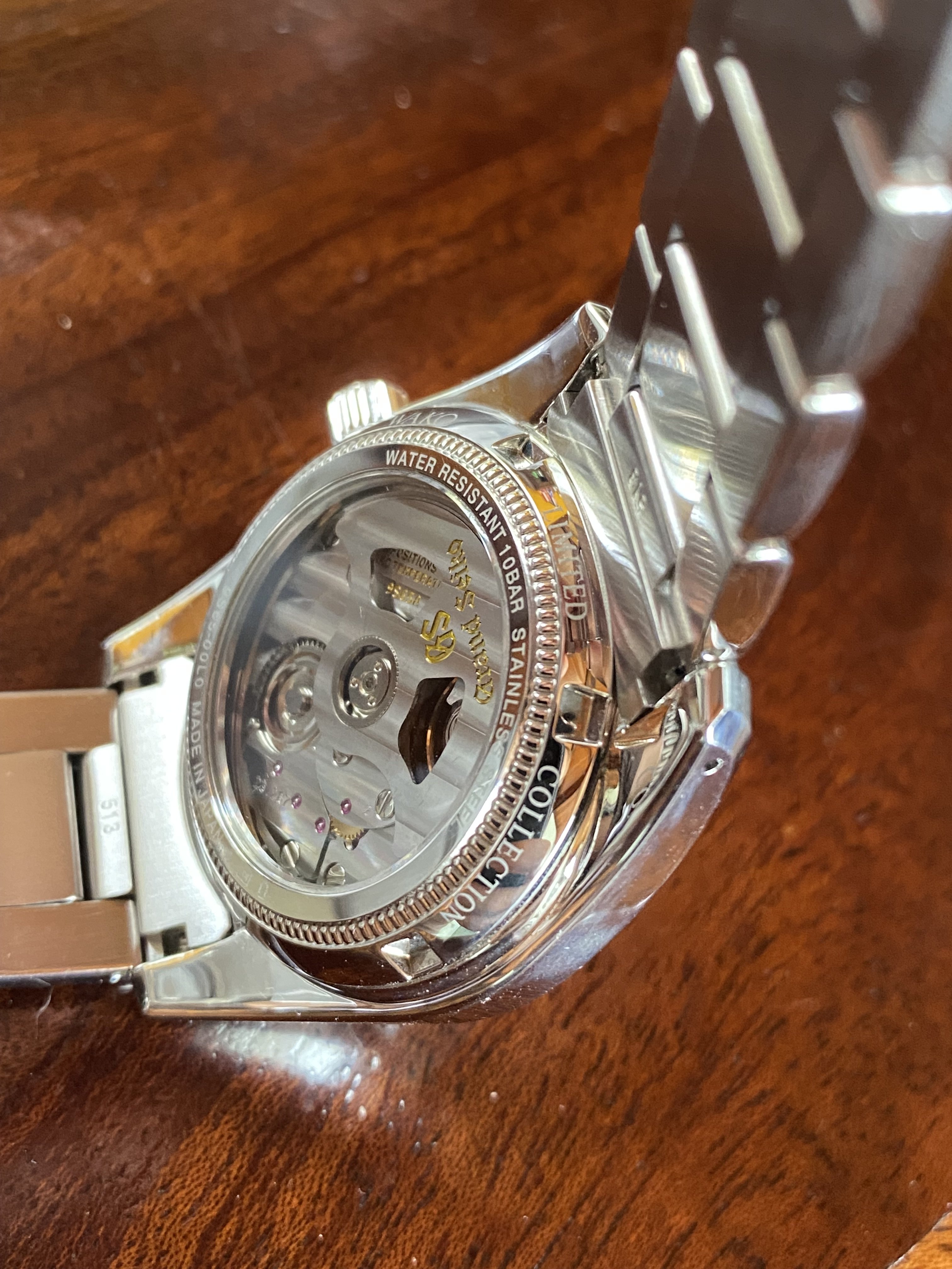 I've worn this watch less than a handful of times. It is essentially unmarked, except for a scratch on the bracelet at the front which is shown in the pictures.