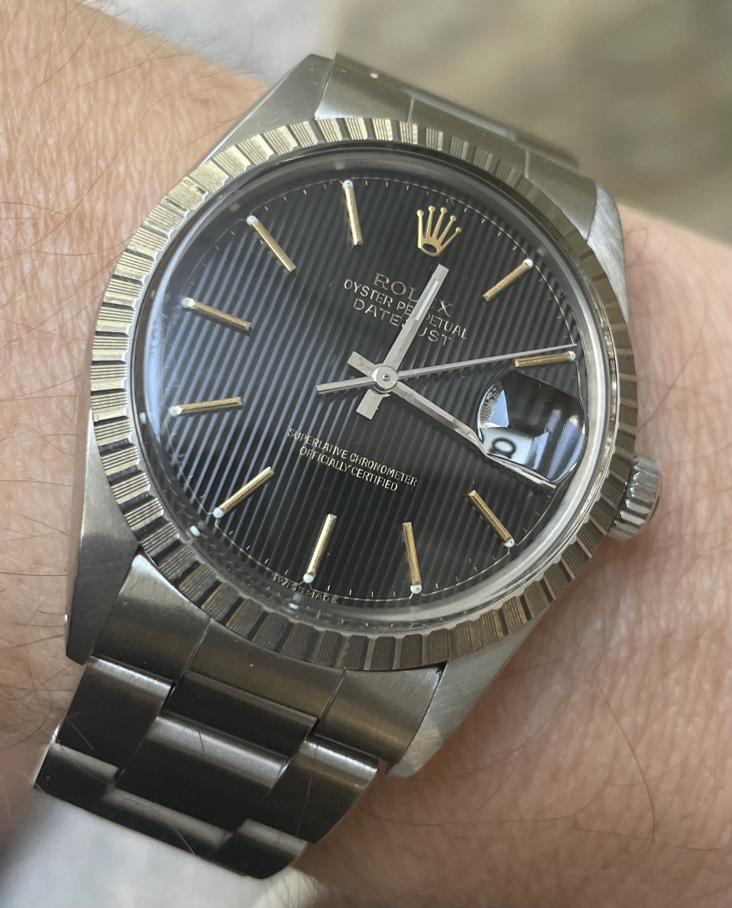 This one turned out to be very appealing in person, also running great and the bracelet is long and solid. I'm actually more of a fan of the 4-digit DJs and engine-turned bezels, and I've also picked up a couple of those. But there's certainly something to be said for the 5-digits like this one. The quick-set date is convenient, and parts are still available for the 3XXX series movements. Unfortunately, Rolex has pretty much stopped supplying parts for the 15XX movements.