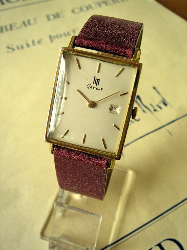 ·This elegant, slim wristwatch is a manual wind piece with an unusual date but no seconds hand dial. The 20 micron gold plated case looks great with it’s original glass crystal. The snap-in stainless caseback bears the Lip shield and case number. The dial is a striking original eggshell white with gold hour markers and hands. Simple and elegant.