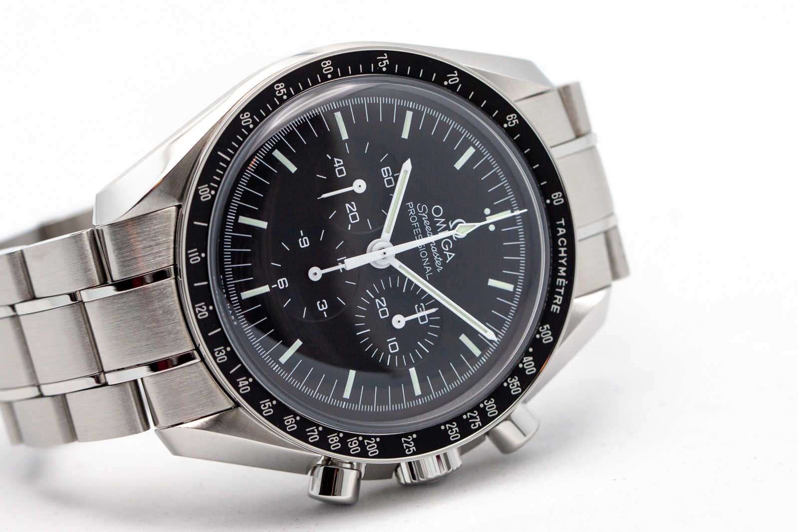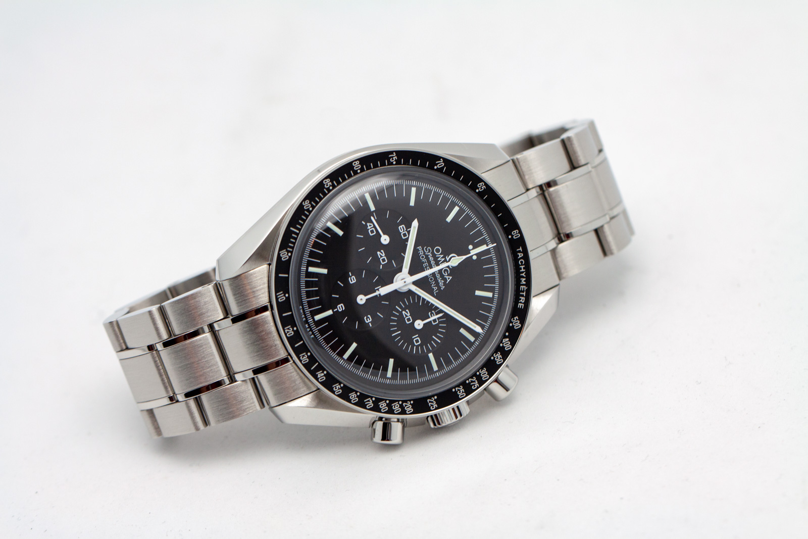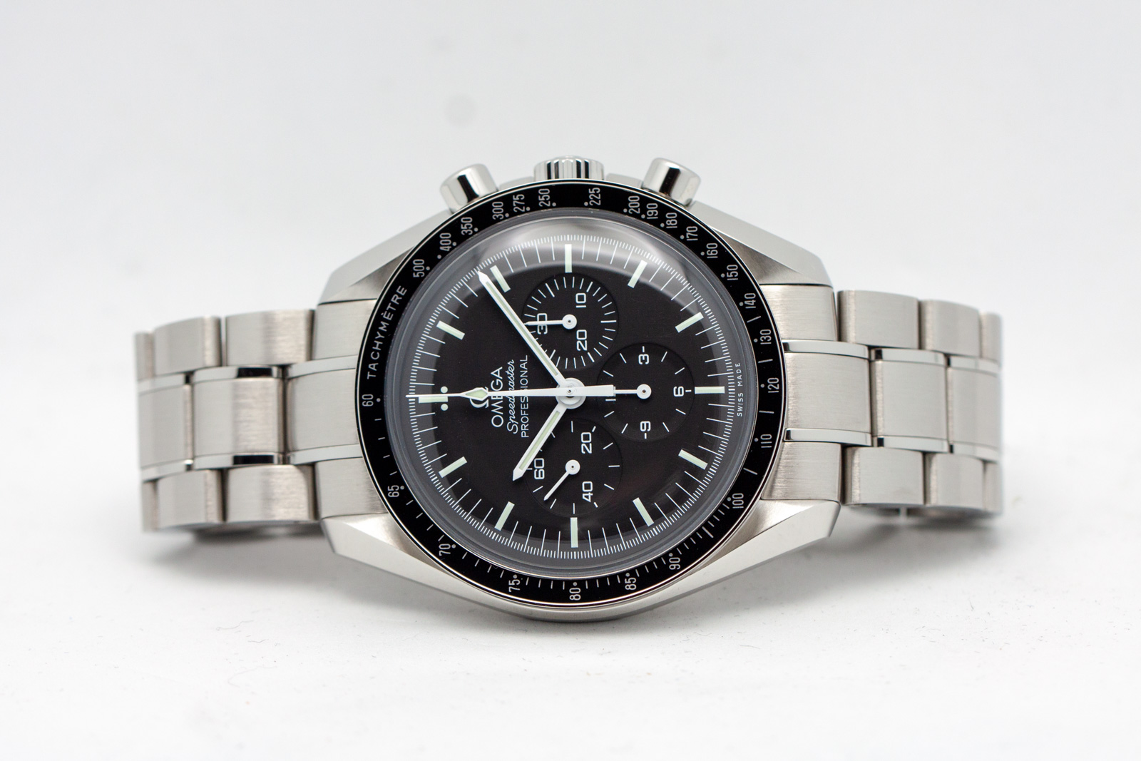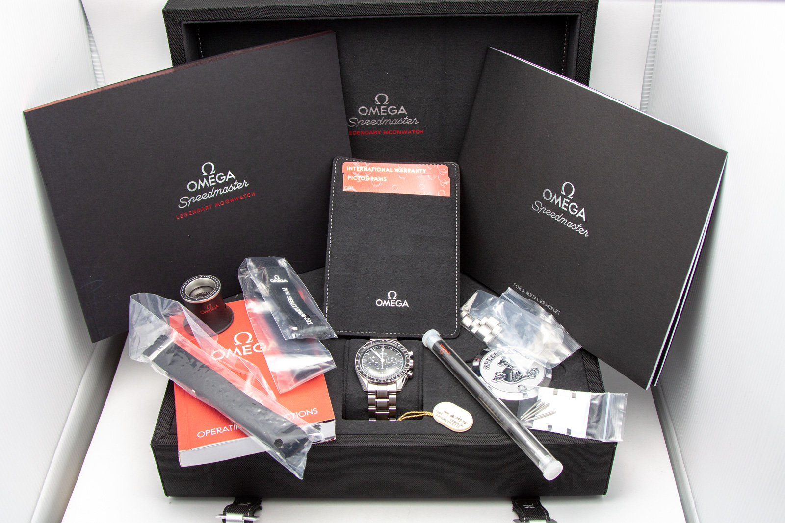 ·Omega Speedmaster Professional, 311.30.42.30.01.005, 42mm, hesalite crystal. 3 months old with plenty of factory Omega Warranty remaining. LNIB condition, crystal is scratch free, runs excellent. Includes full collector set, everything in photos including all 4 inner and outer boxes, special editions books, hang tag, watch manual, Omega Loupe, Omega Watch Tool, both special Omega edition NATO straps, all bracelet links, Speedmaster SS Coin/medallion, Pictogram and Omega International Warranty Card stamped/dated by Omega AD, July 2018 (still under Omega Warranty). Photos are of actual watch for sale, serial numbers blurred in photos, but intact and matching on actual watch for sale. I am a watch collector and independent seller and not affiliated with Omega, guaranteed authentic. Accepting trades on Rolex, IWC, Zenith, Breitling, Omega, Tag Heuer and most luxury brands.