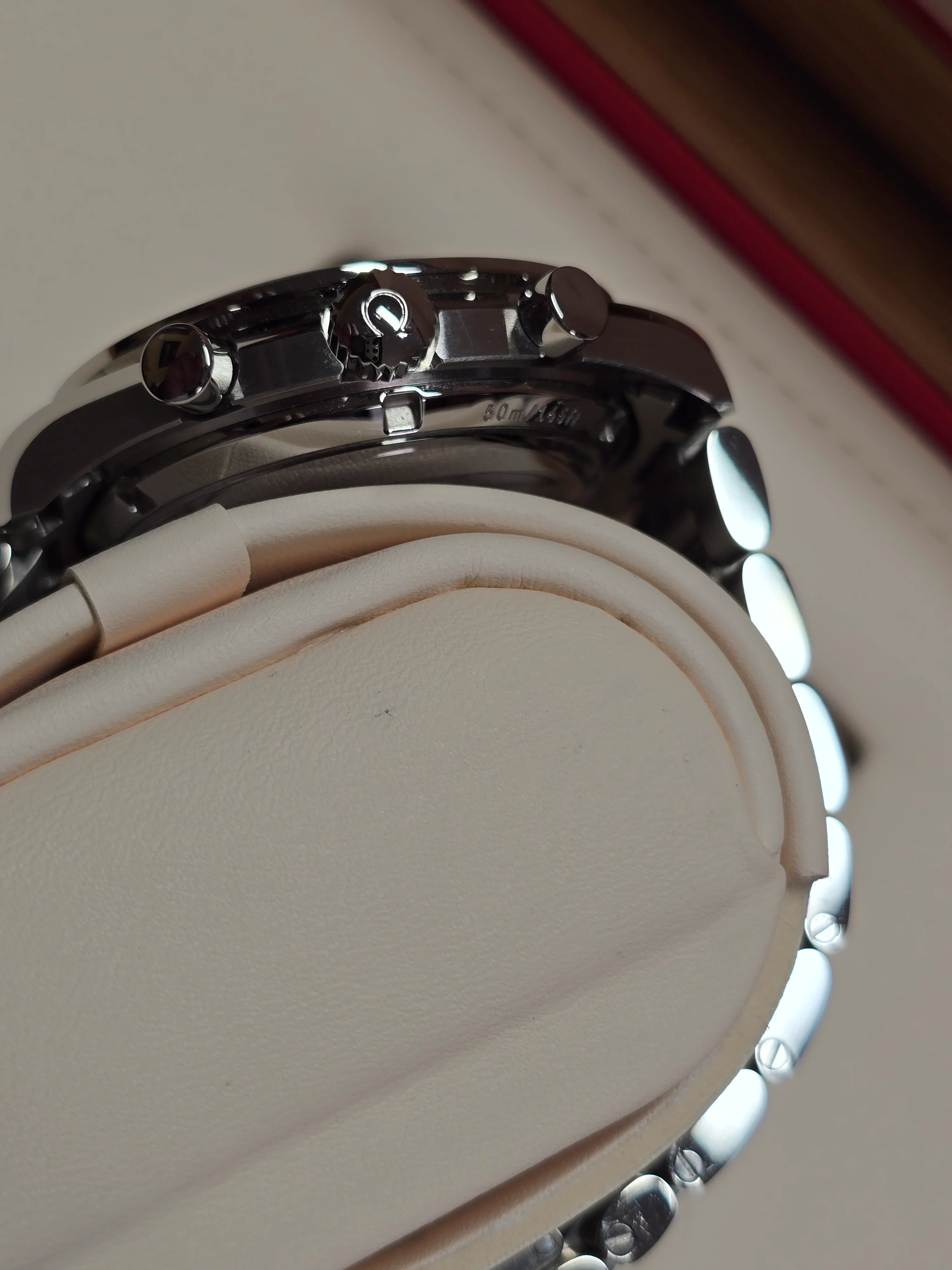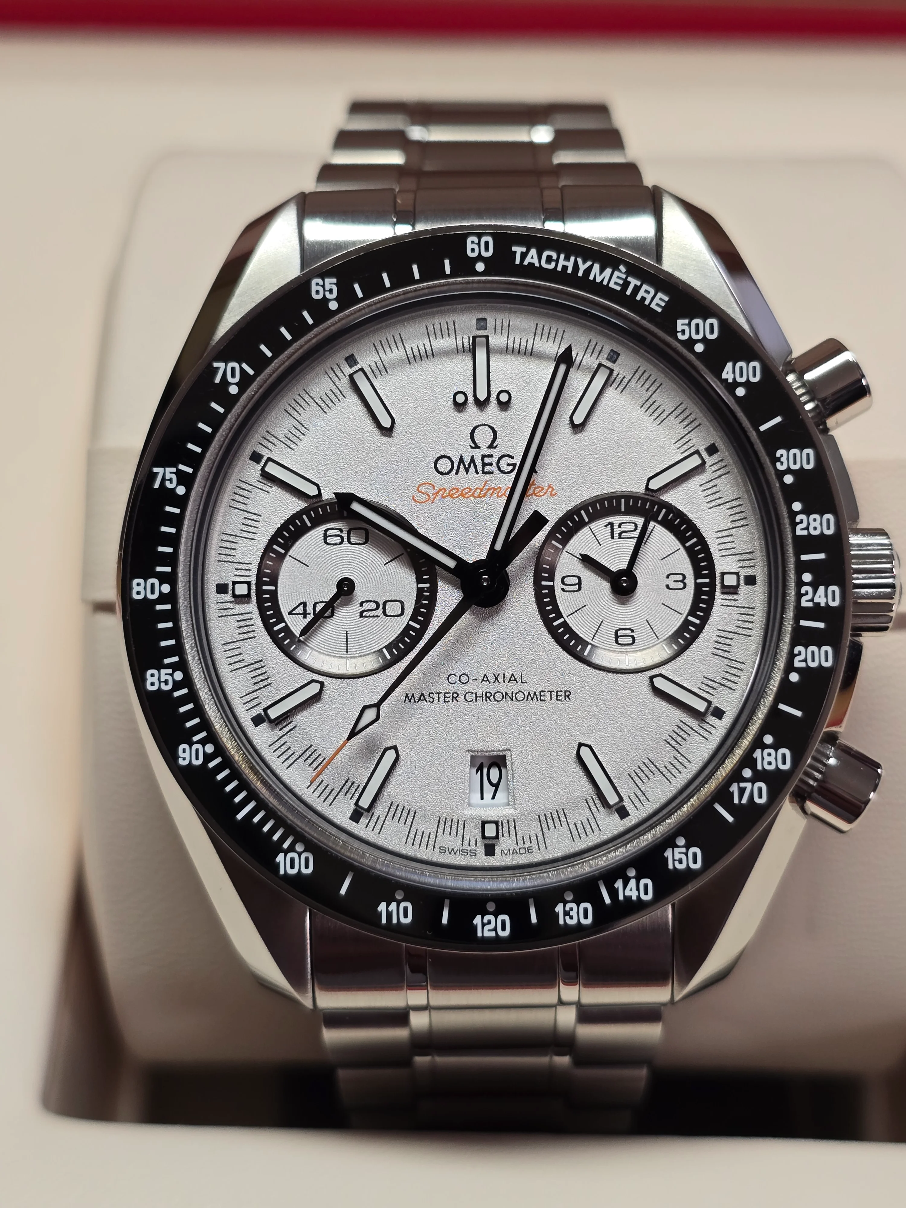 ·Up for sale is my like-new Omega Speedmaster Racing White Dial 329.30.44.51.04.001. Warranty card is dated 6/10/2024. Worn a handful of times in very gentle environments, most of the time on a strap. No scratches, gouges or any damage whatsoever. Keeps very accurate time. Although I haven't taken any measurements, it certainly seems to be within COSC specs (MC certificate reports 2.9 spd). Full link set, plus one additional half-link to comfortably fit on my 8.6 inch wrist.