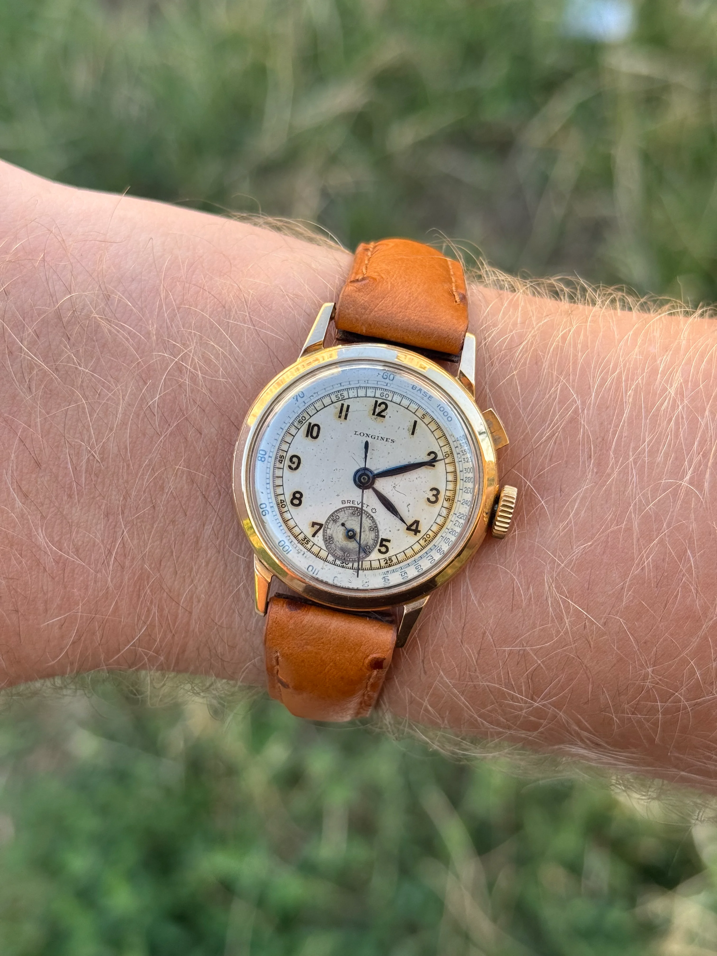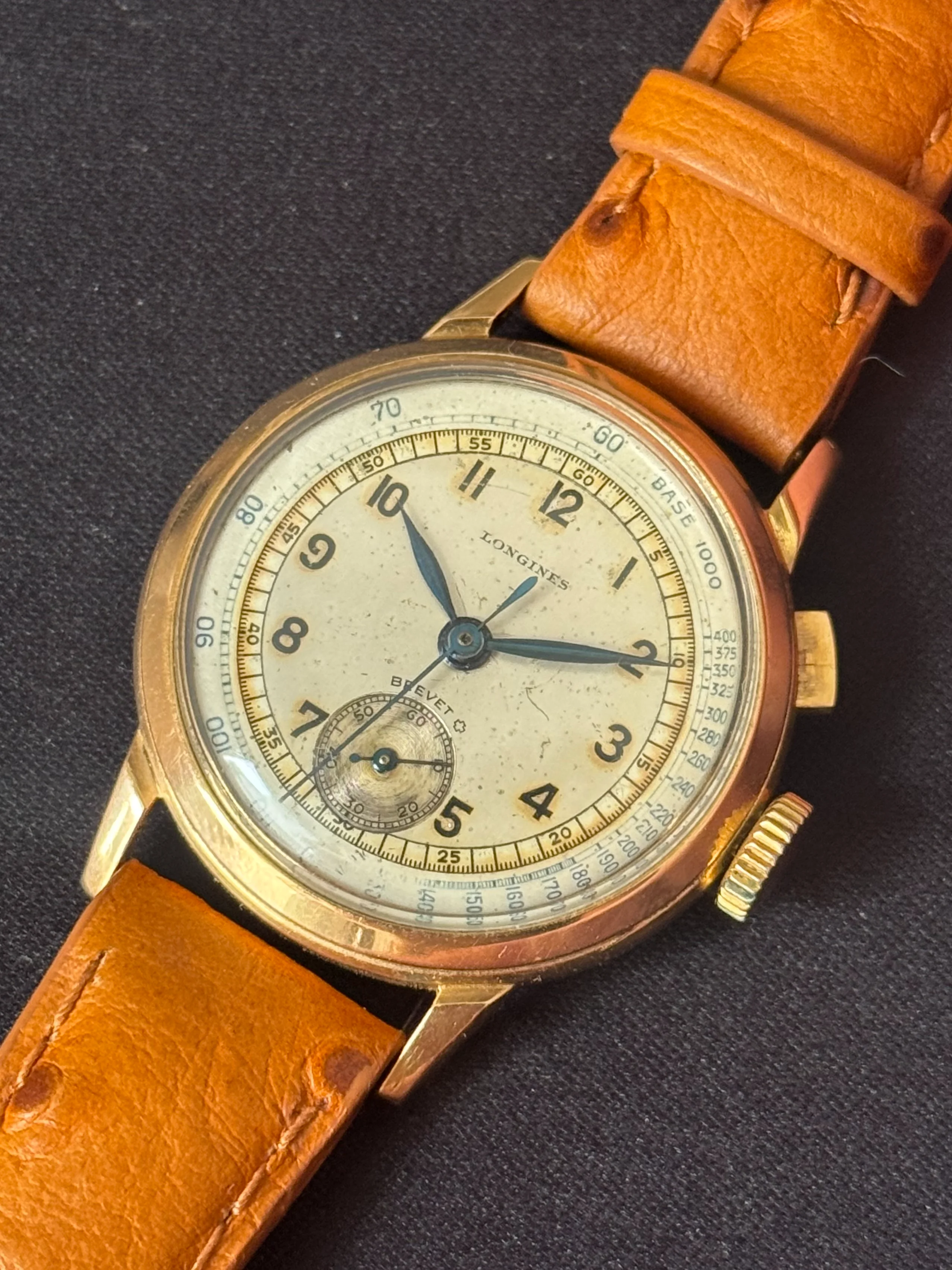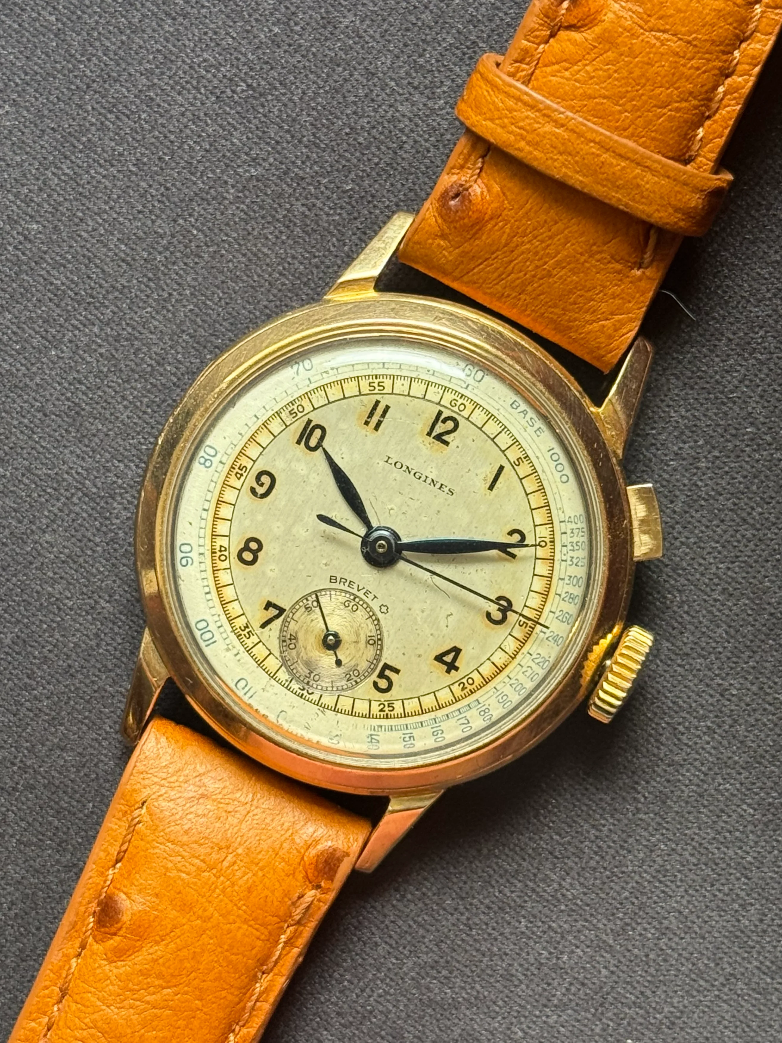 I purchased this watch from a French vintage dealer, who acquired it from an Italian gentleman who had inherited it from his grandfather. Based on the serial number, the watch was produced in 1937 and features the Longines caliber 12.68Z with a continuous flyback chronograph.