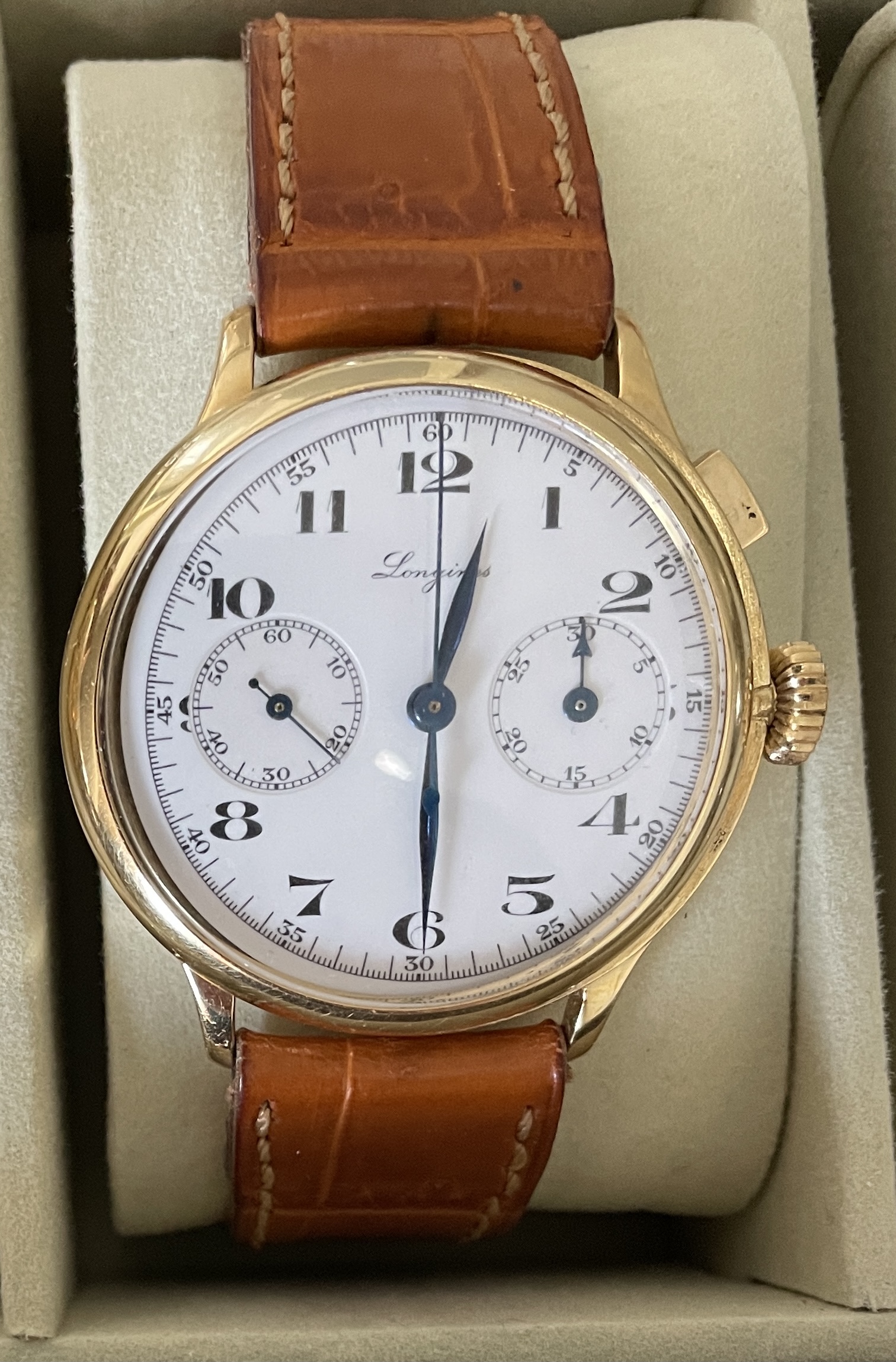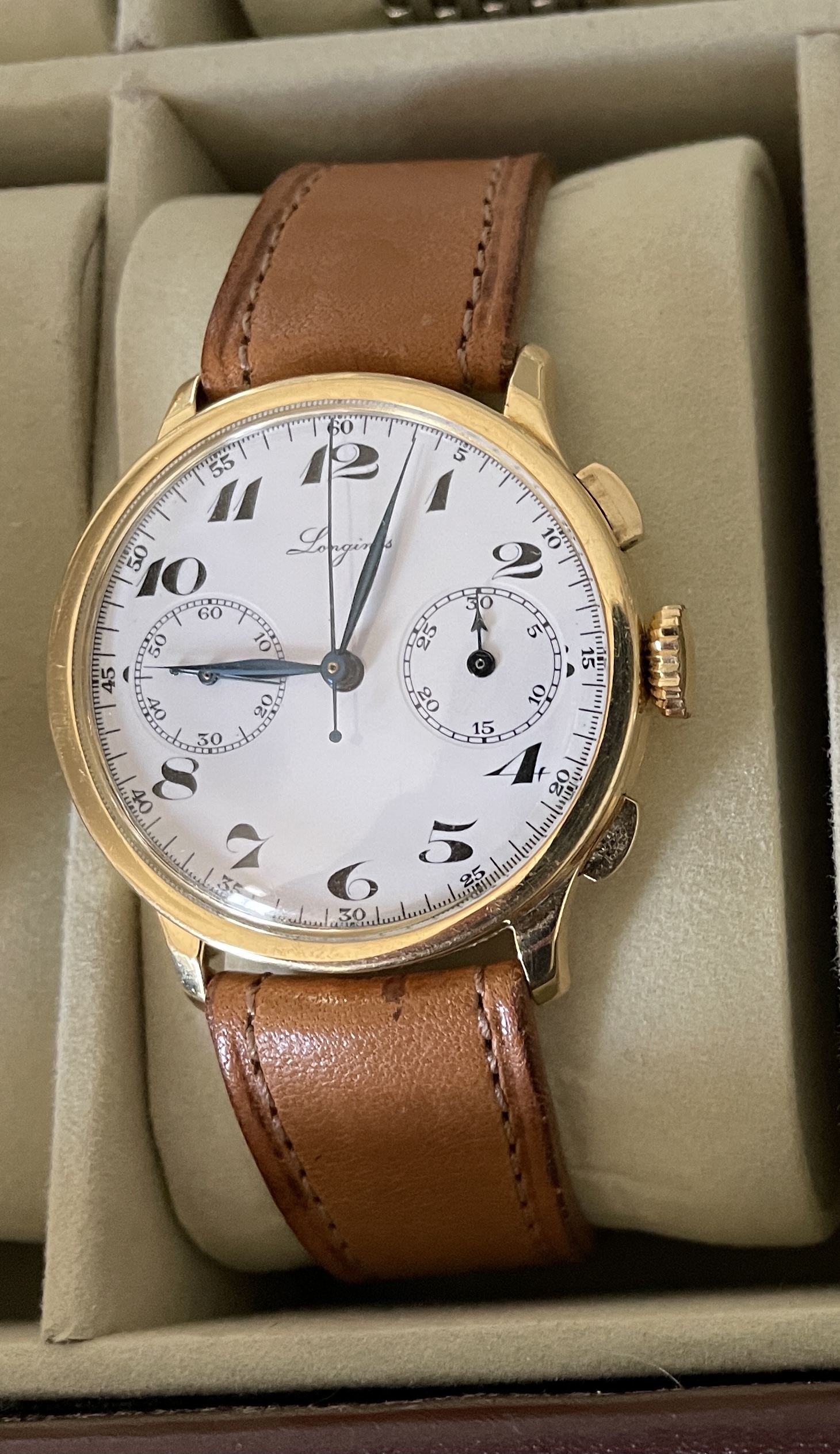The last one I also bought from a Longines collector, a fixed lug, 18k case with the Kilometrique enamel dial. It is different from the other 4 as it it's also a flyback. Amazing to think that Longines produced an instantaneous second chronograph with a flyback function in 1935.