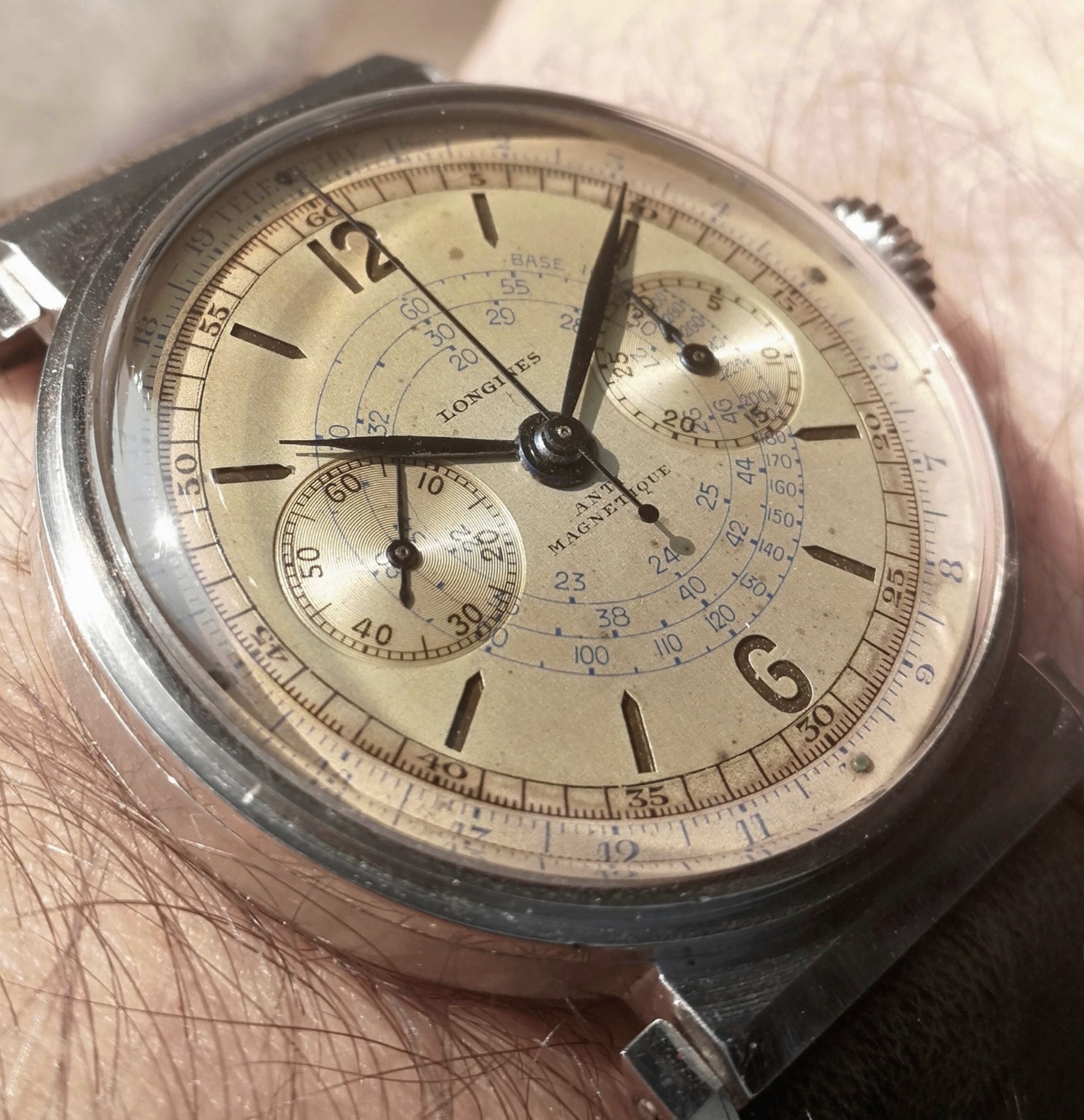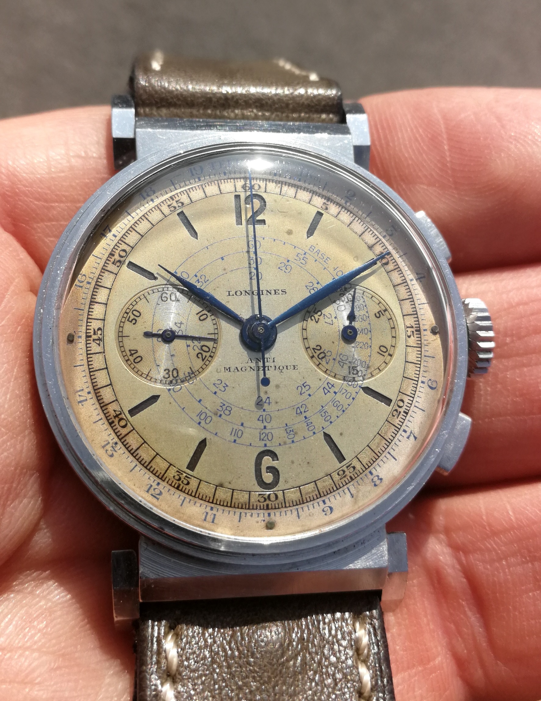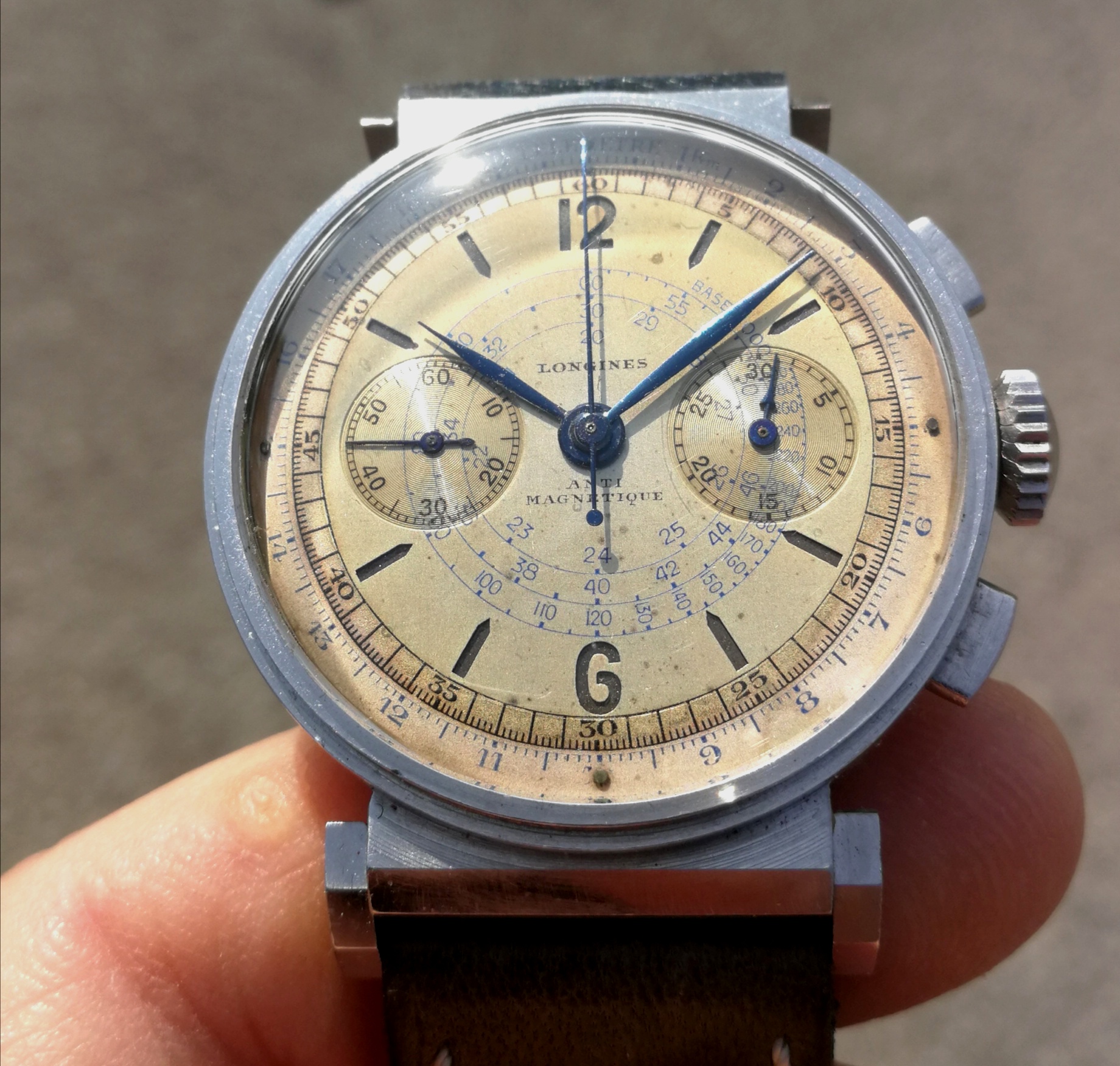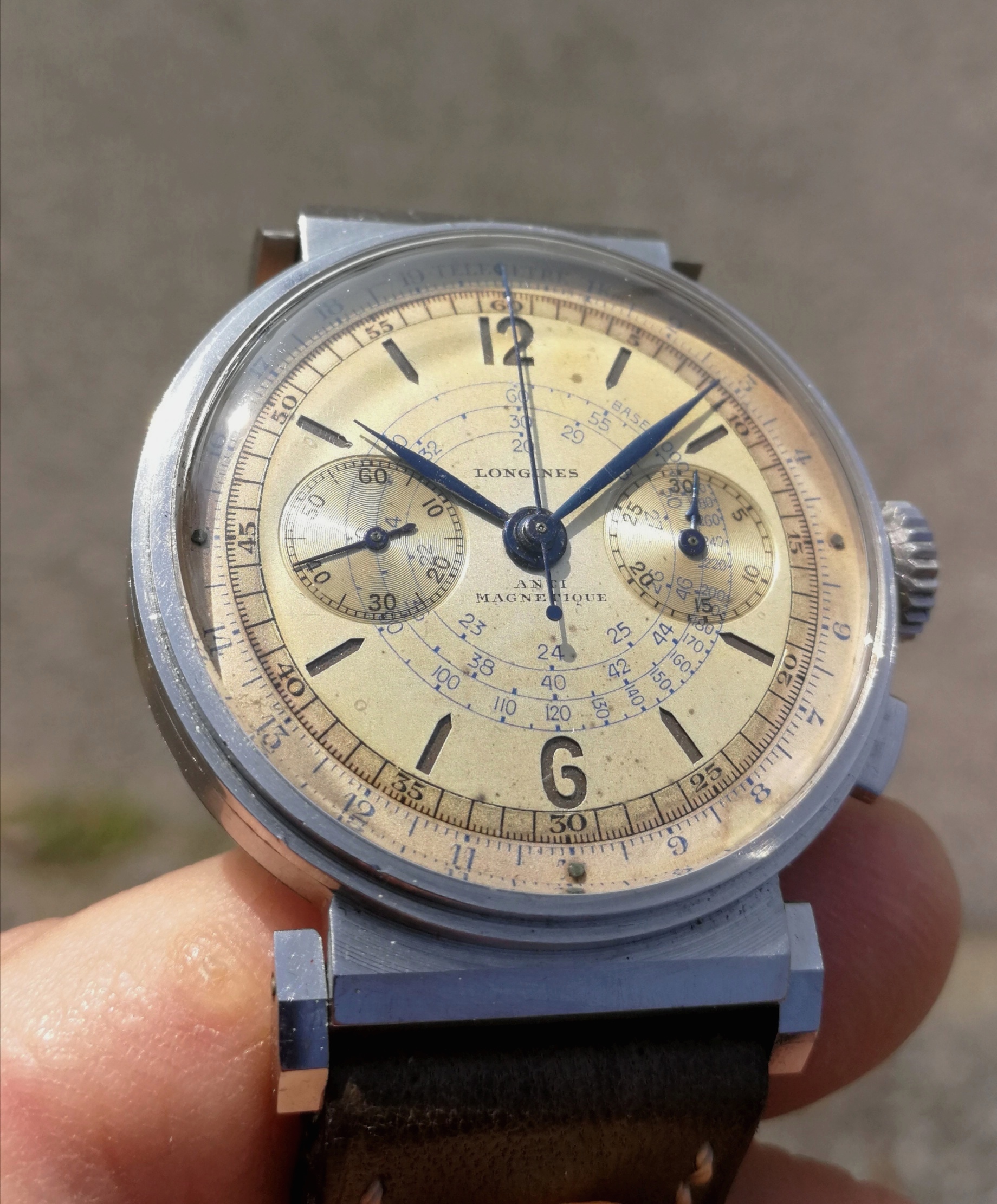 °The first one has a sandwich two tone dial ( with blue and black scales ) with very nice patina which makes it a real vintage piece : I love it !!!