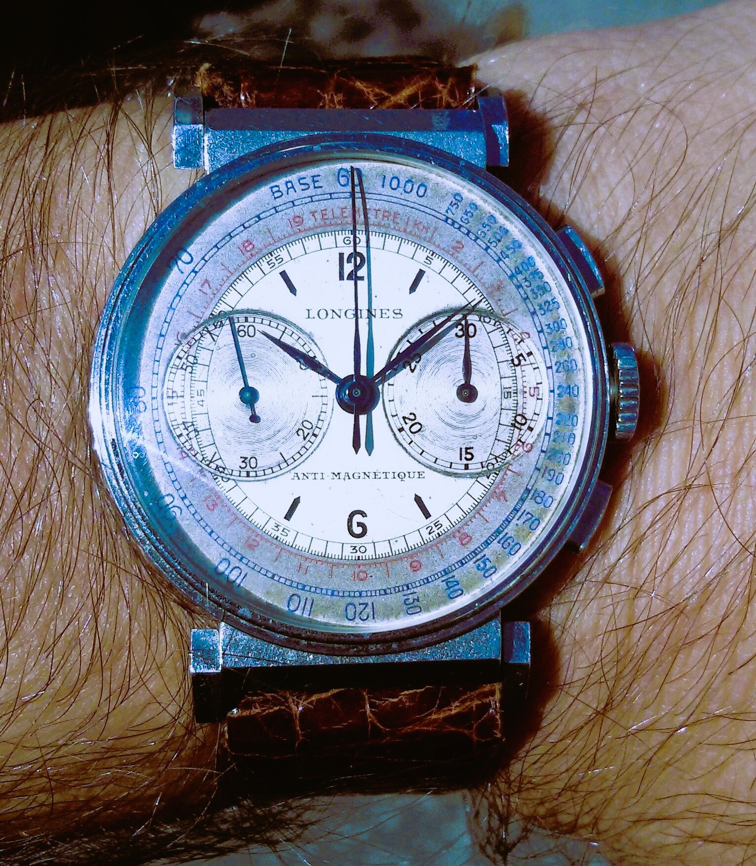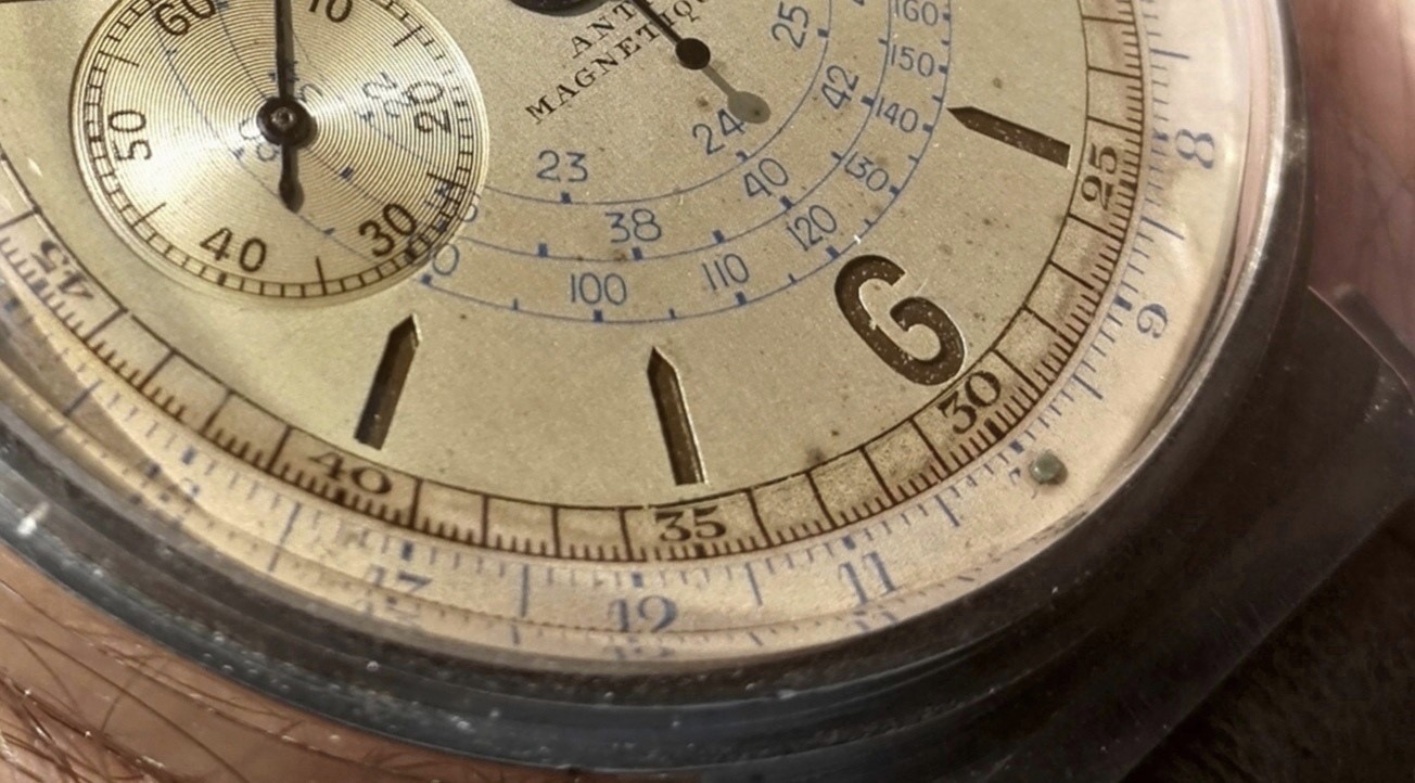 ° The second one has a silver two tone dial with red, blue and black scales and printed indexes, but the most striking feature are the very, very large counters ( bigger than the large ones observed on some books !!! )