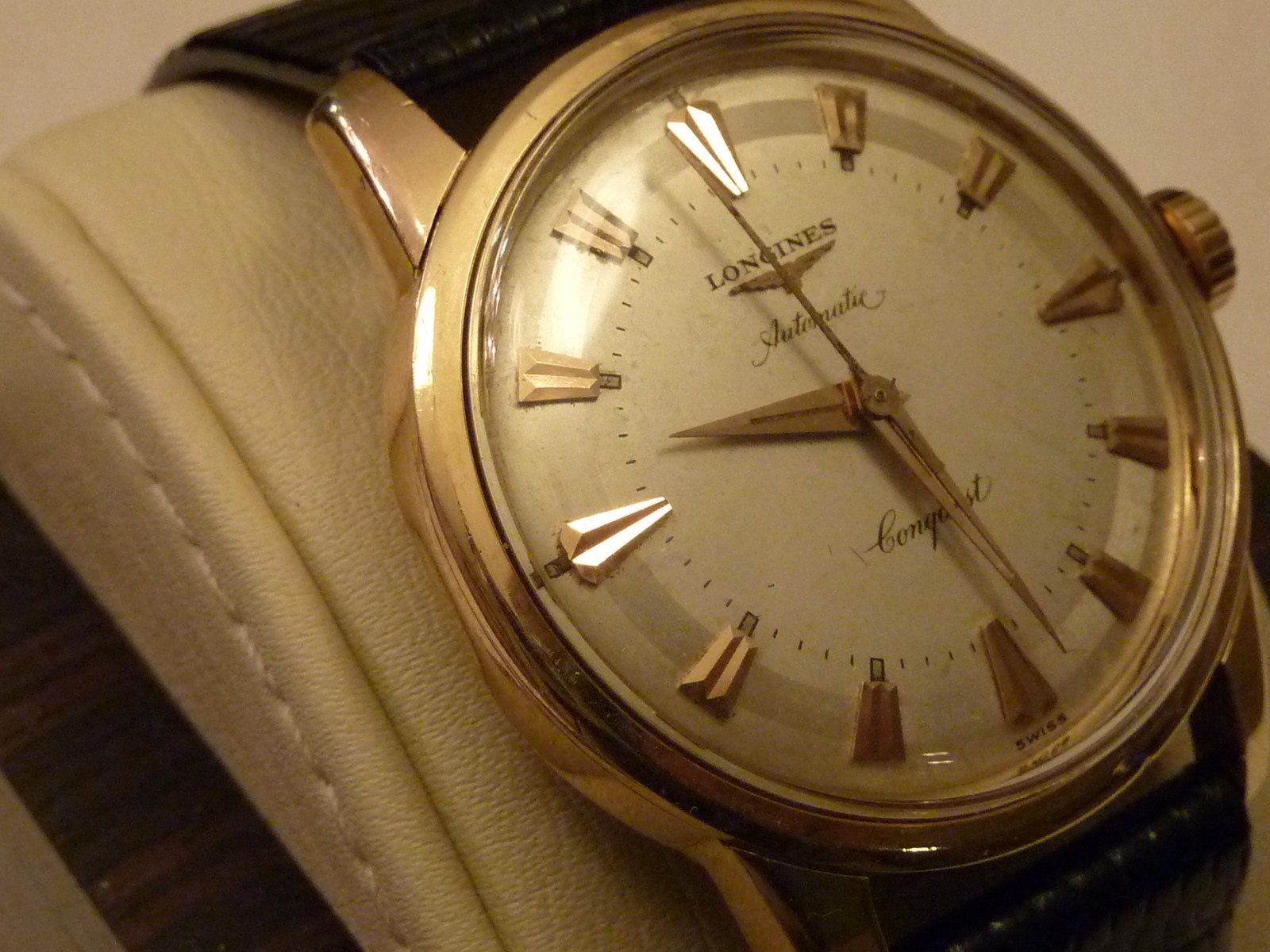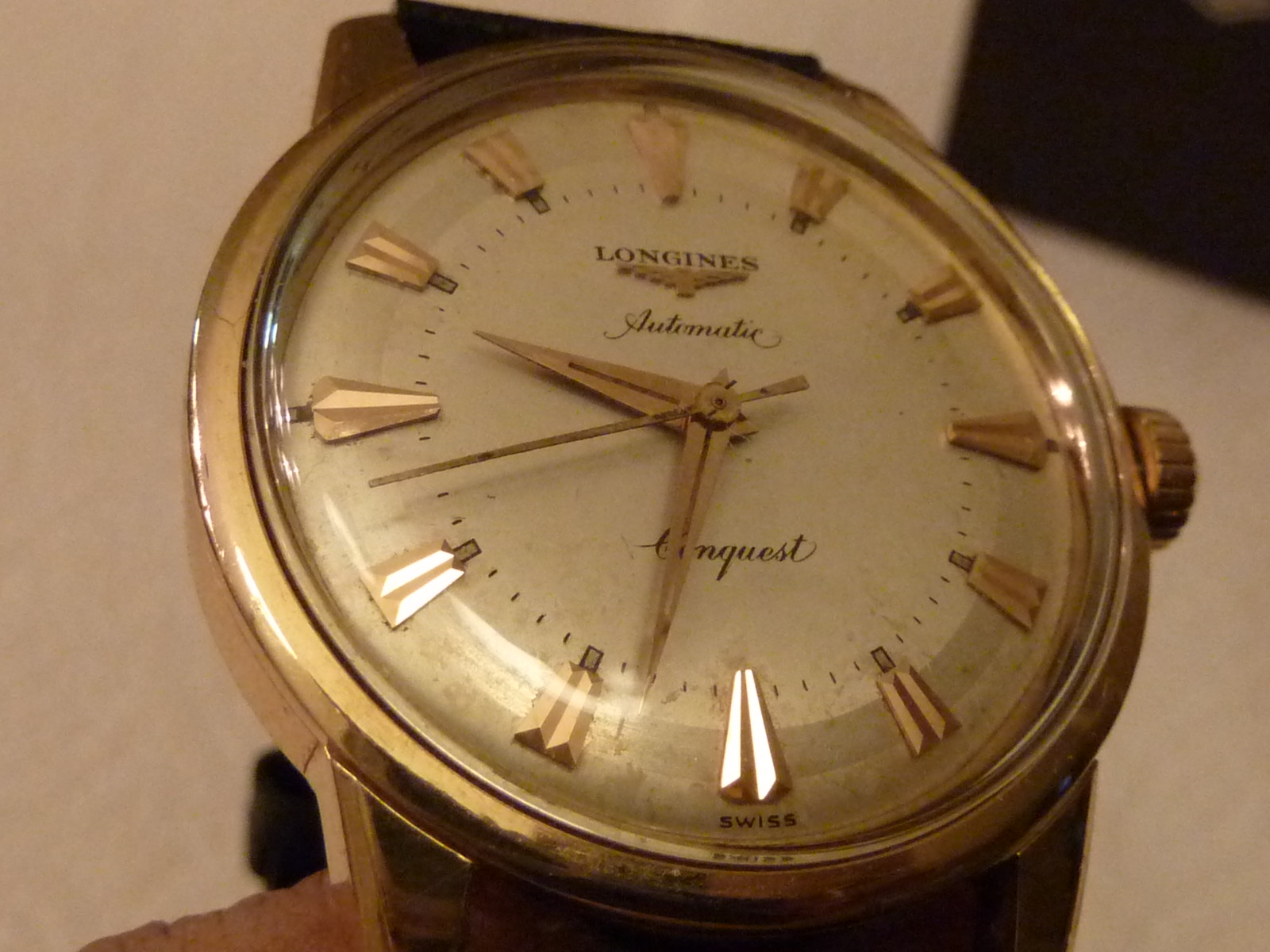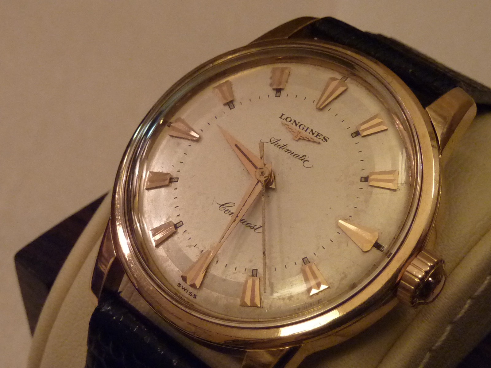 ·Hi good friends, for your consideration is a Longines Conquest in 18k with the 19AS automatic movement. The watch has the original dial, original Conquest crown, and the back has all the blue enamel. The side opposite the crown has a dent that is not really visible when the watch is worn. It is there if you look for it. I did not notice it for a long time after I purchased the watch. Please ask any questions and I will be more than happy to respond with the most pleasant attitude.