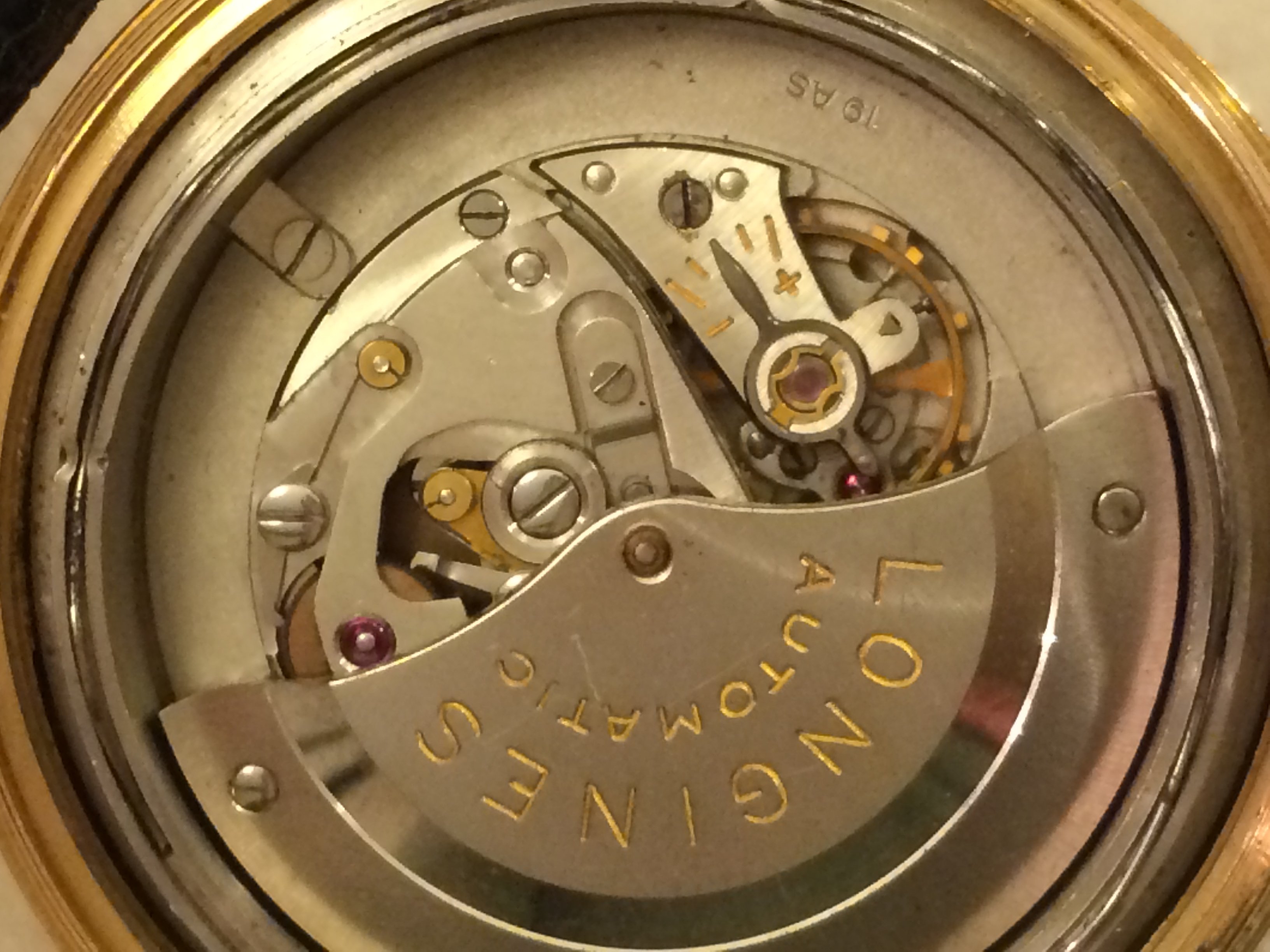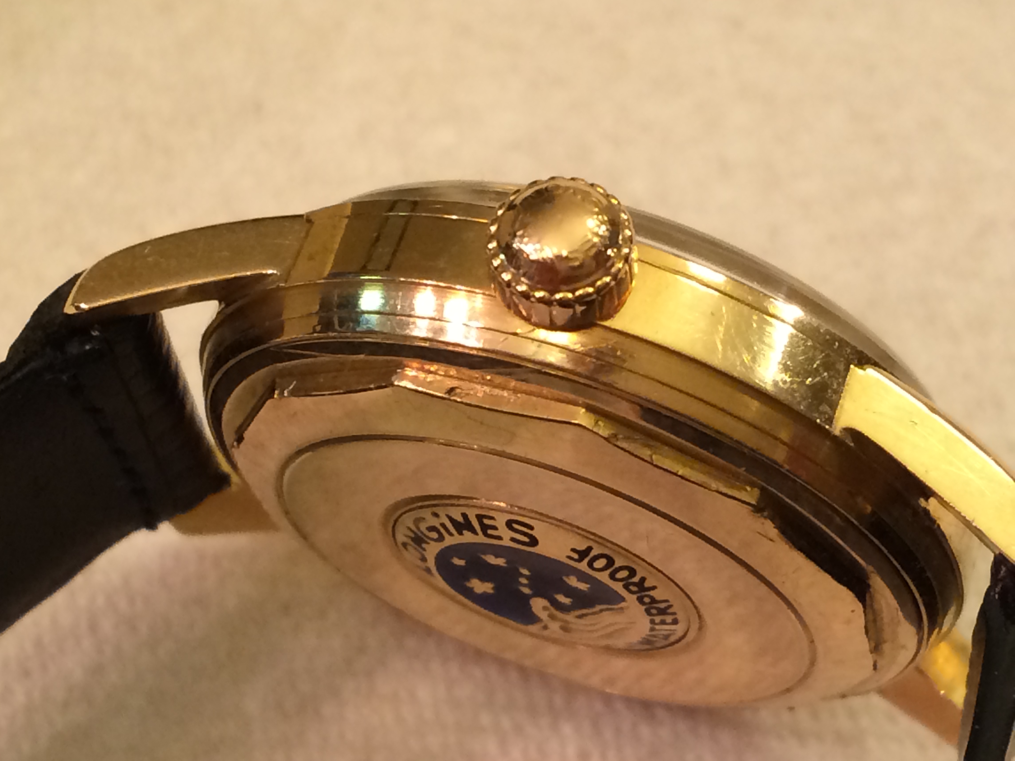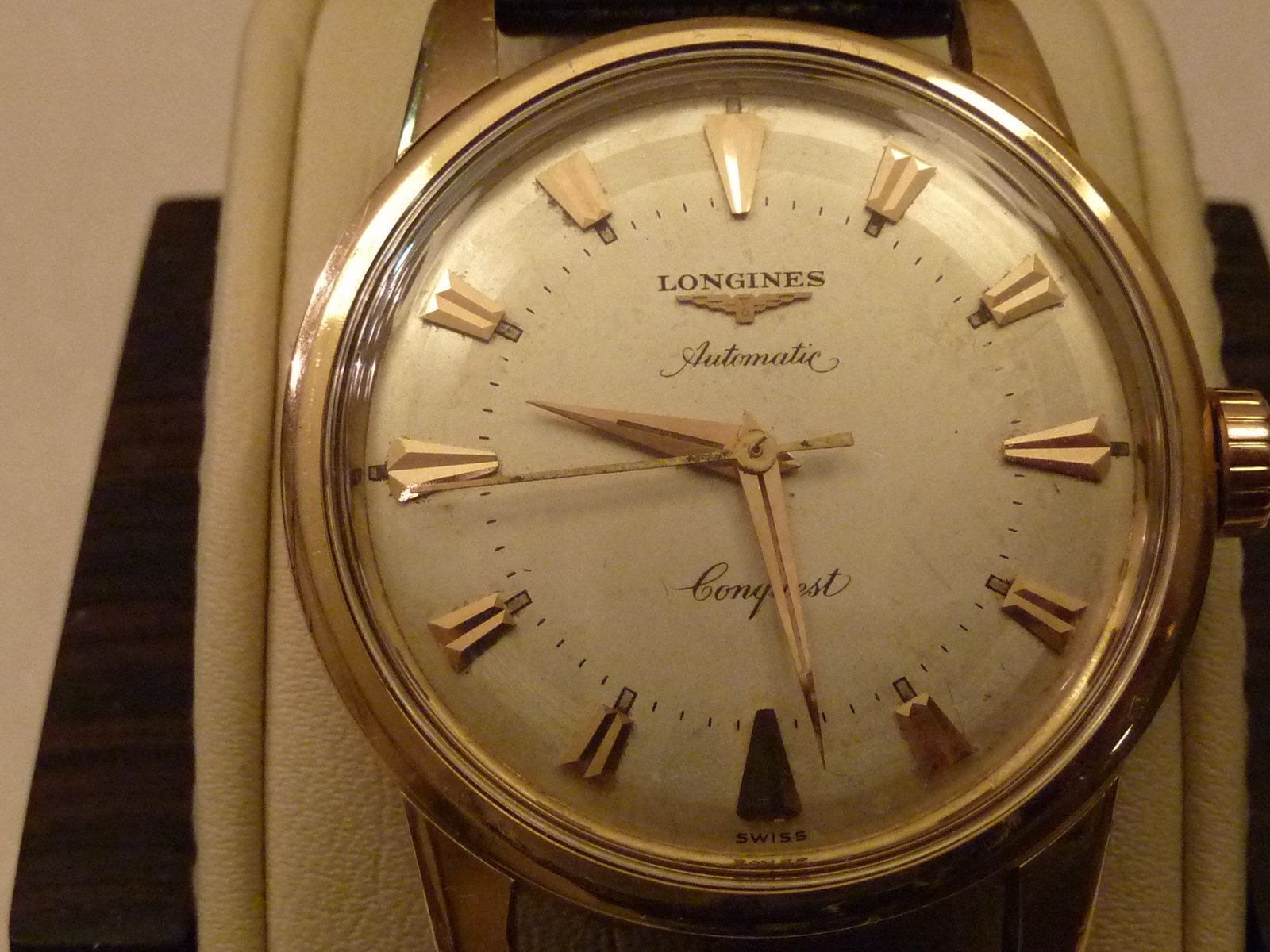 ·Hi good friends, for your consideration is a Longines Conquest in 18k with the 19AS automatic movement. The watch has the original dial, original Conquest crown, and the back has all the blue enamel. The side opposite the crown has a dent that is not really visible when the watch is worn. It is there if you look for it. I did not notice it for a long time after I purchased the watch. Please ask any questions and I will be more than happy to respond with the most pleasant attitude.